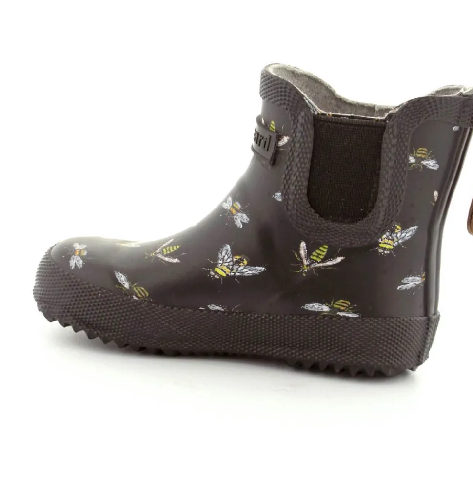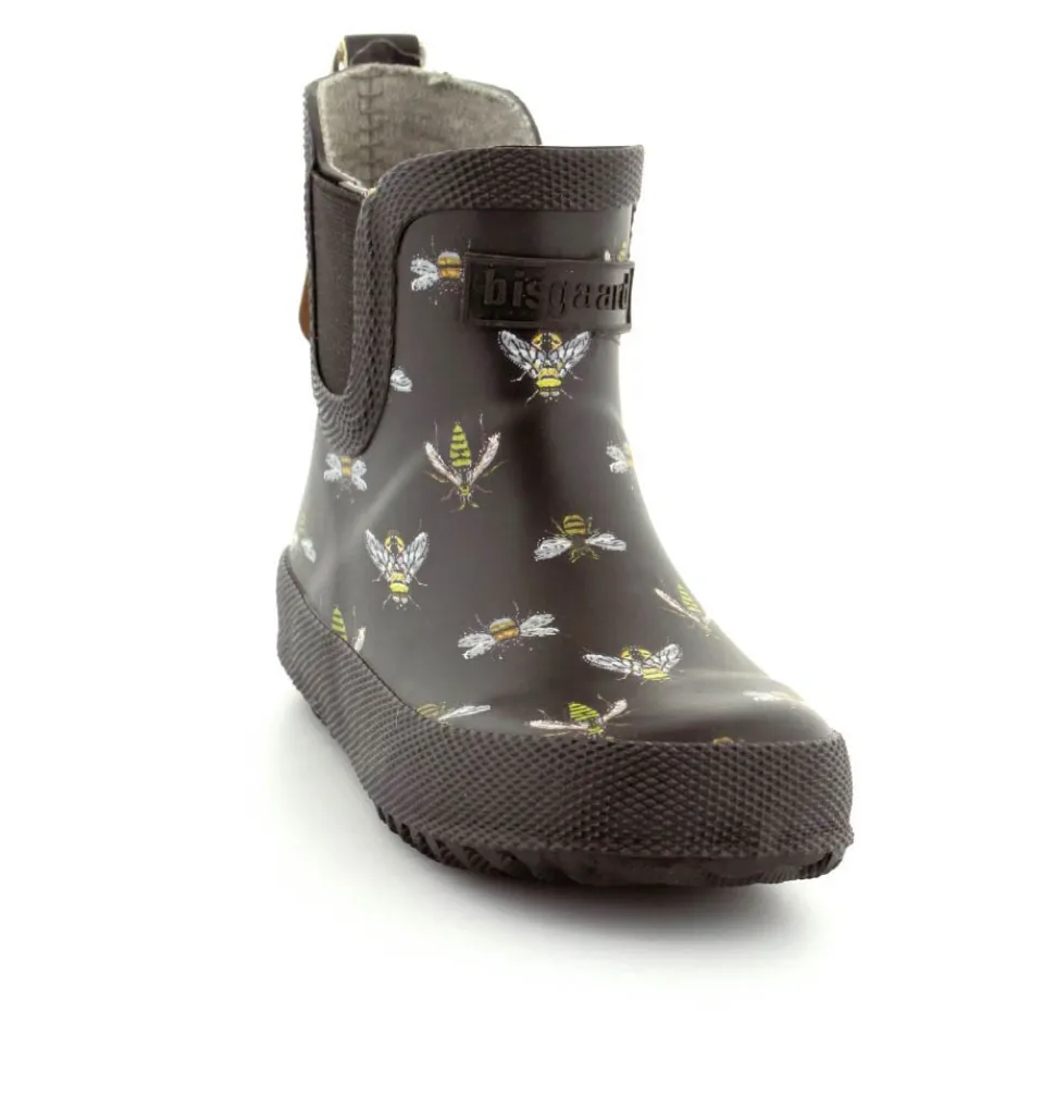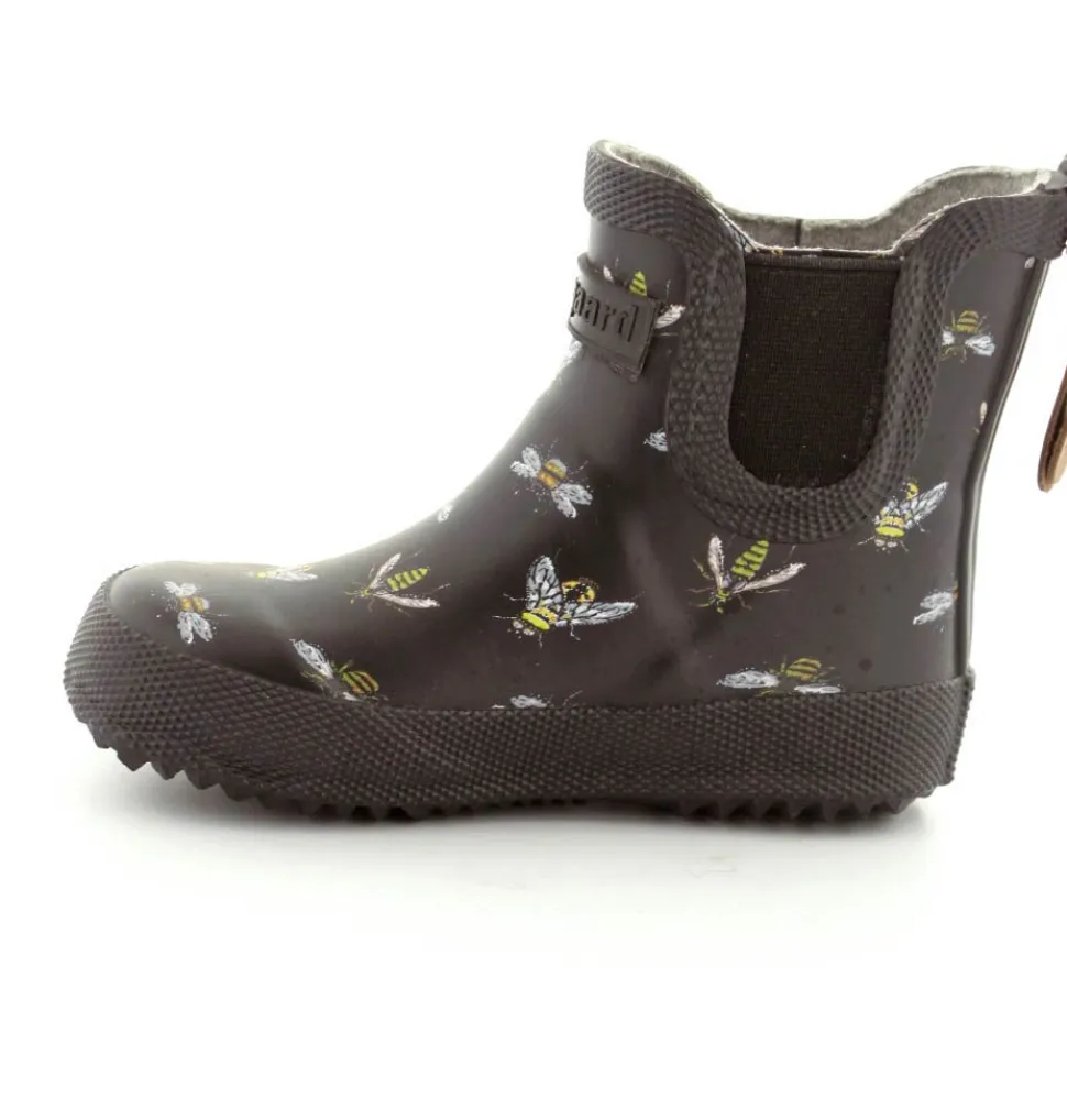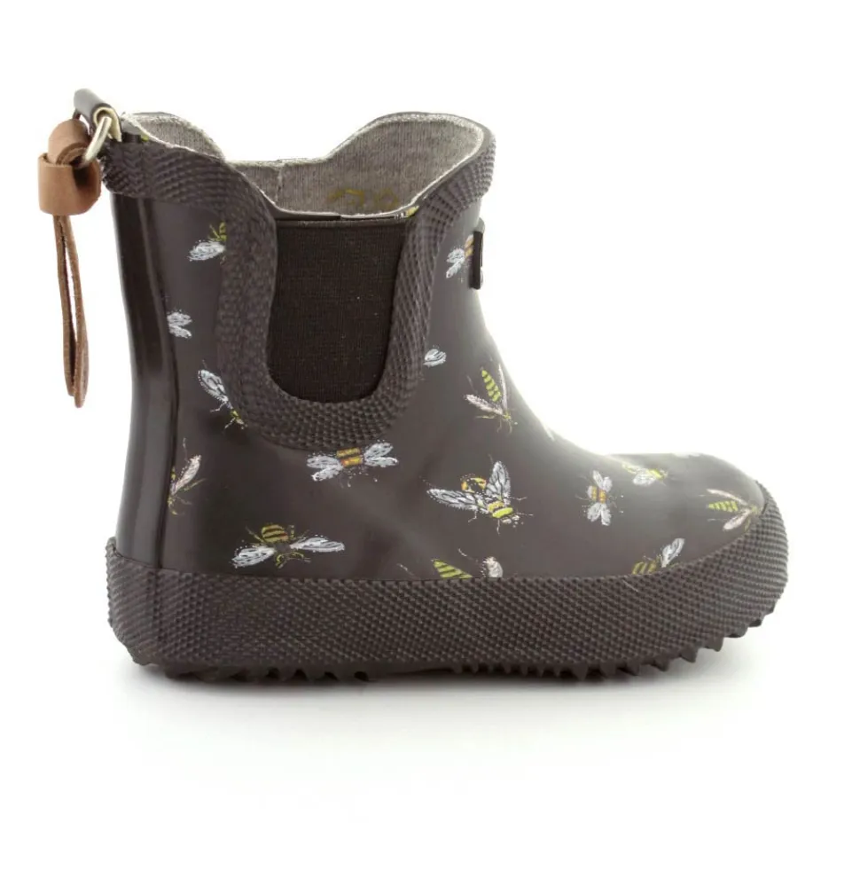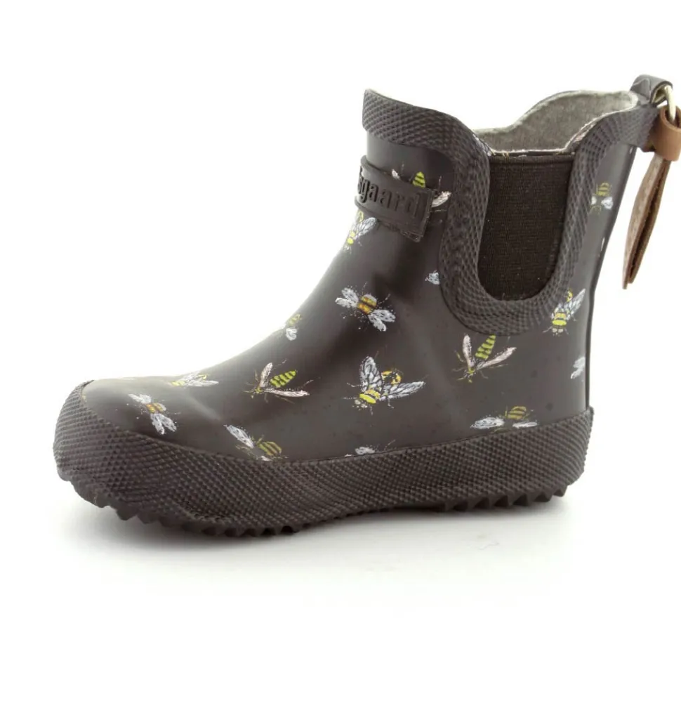 Super fine korte gummistøvler fra Bisgaard model Baby Bees, i sort naturgummi med små bier på. Støvlen er med elastik i siderne og er lige til at trække på. Blød og fleksibel med gummisåler og aftagelig indlægssål. Smart detalje med læderstroppen bagpå. Super god til de mindste.