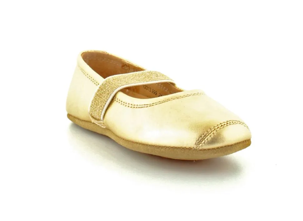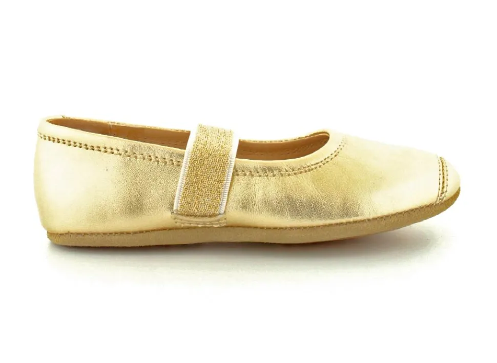 Super gode og flotte hjemmesko fra Bisgaard i guldfarvet skind. Skoen er lavet så det ligner en balletsko, og har et godt hold på foden. Sidder godt fast og har fast hælkappe. Alt er i skind, så den bliver super blød på barnets fod. Små gummifelter under bunden.