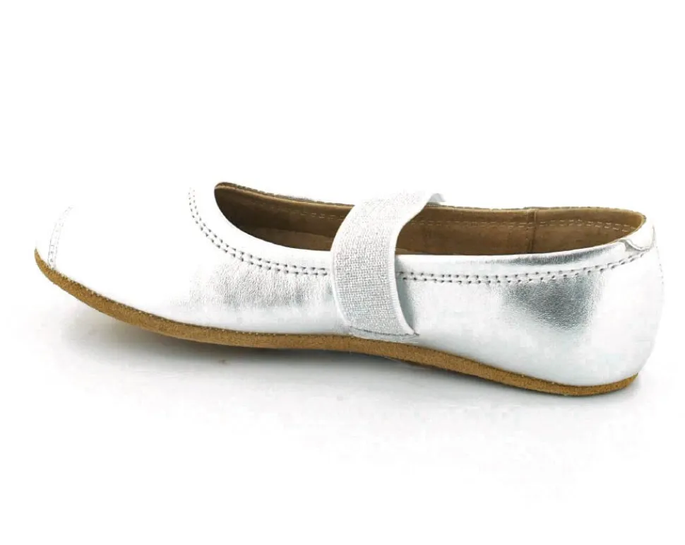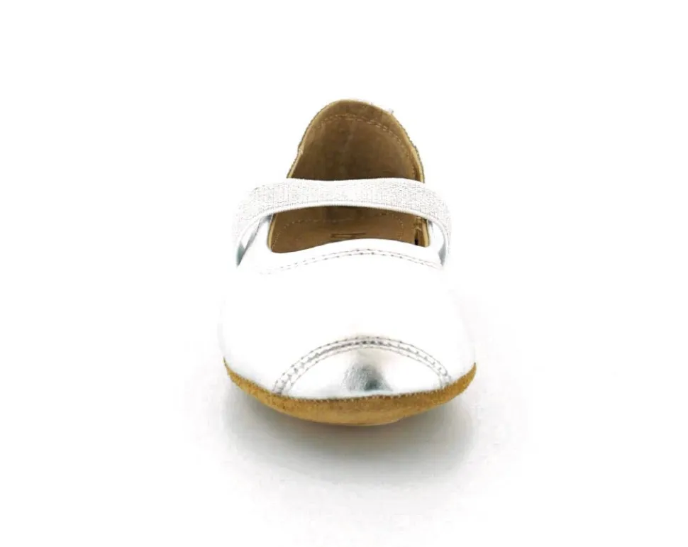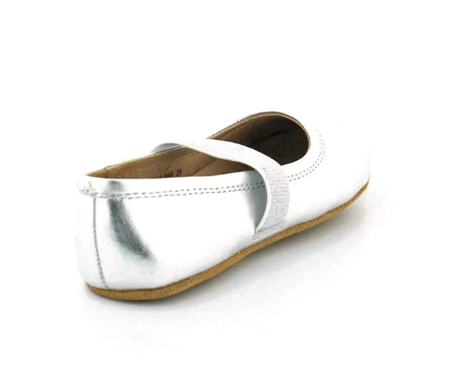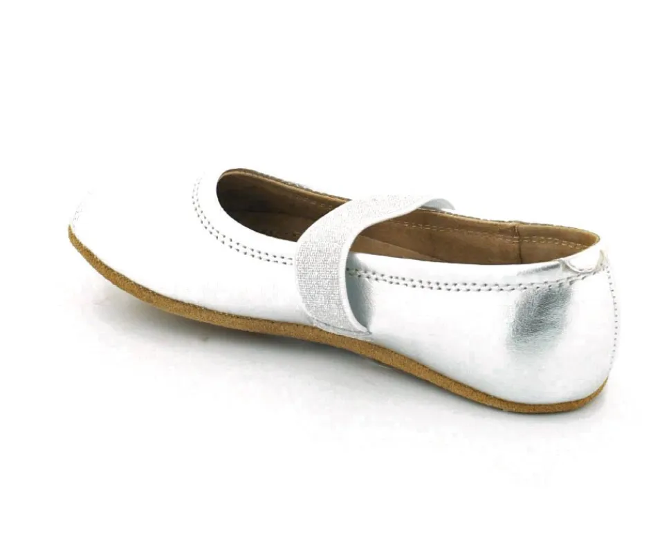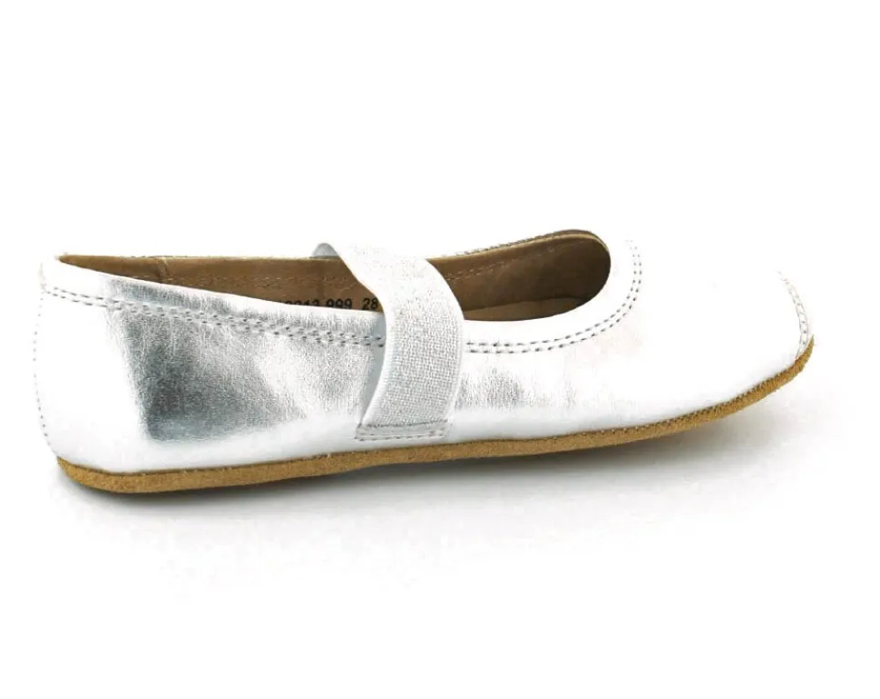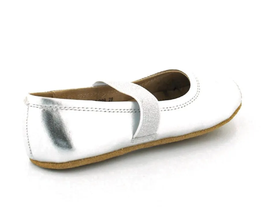 Super god hjemmesko fra Bisgaard model Ballet i sølvfarvet skind. Skoen er lavet som en balletsko med elastikrem over vristen, så den sidder godt fast. Skoen har en god fast hælkappe så den støtter barnets fod rigtig godt og med skindfoer i hele skoen. Der er ruskindssåler under bunden, med to gummifelter på, så barnet står bedre fast.