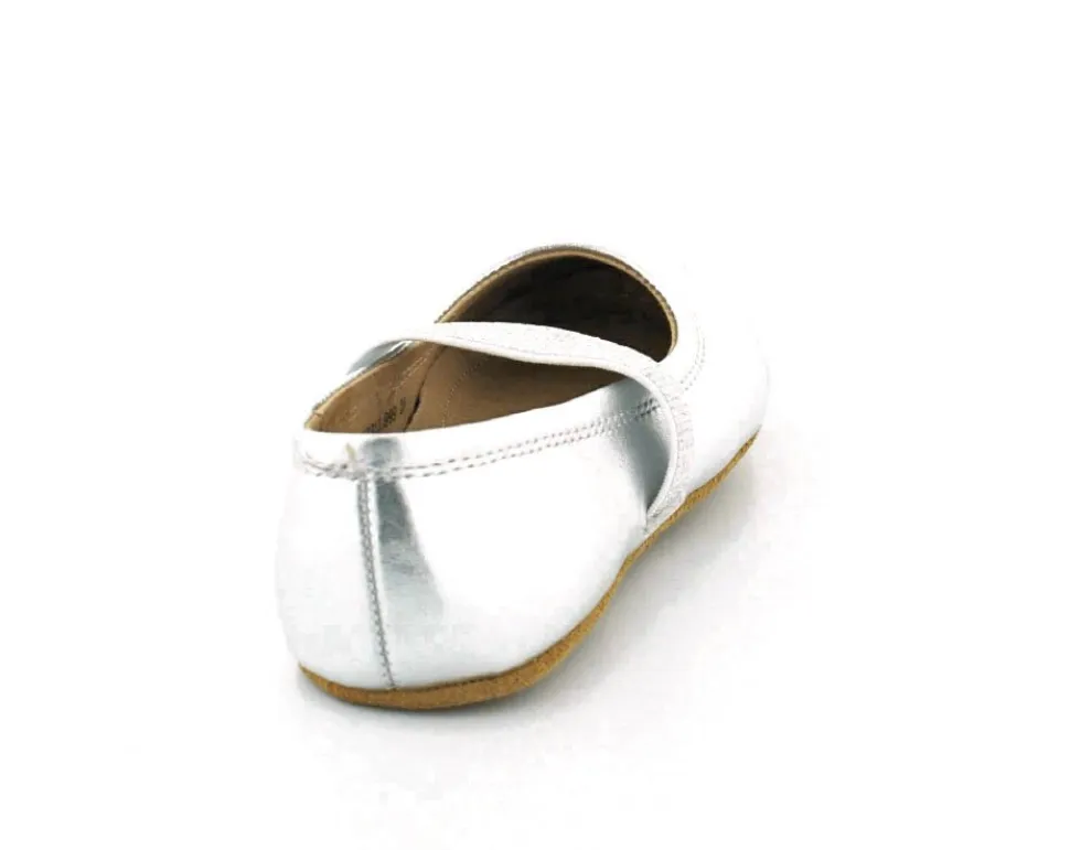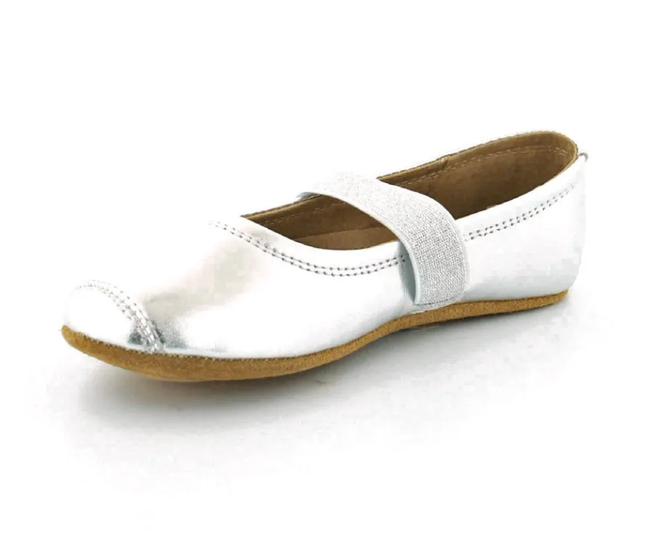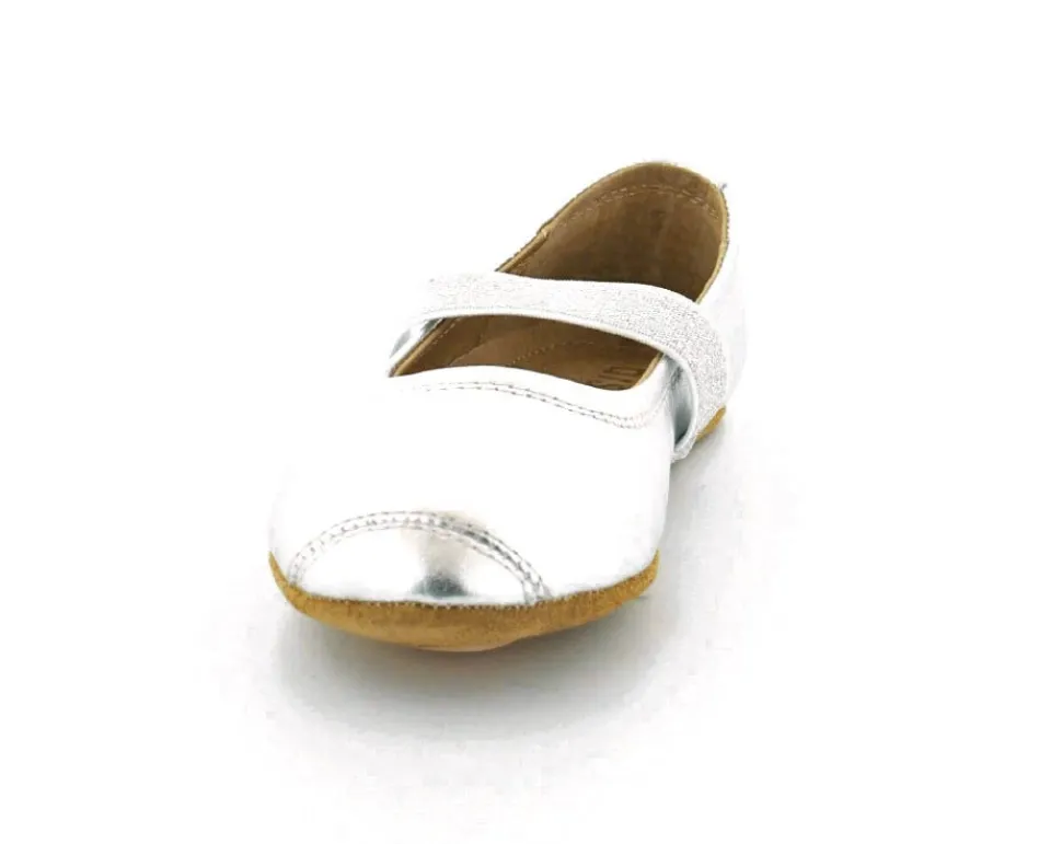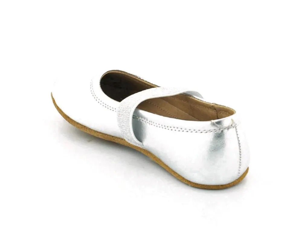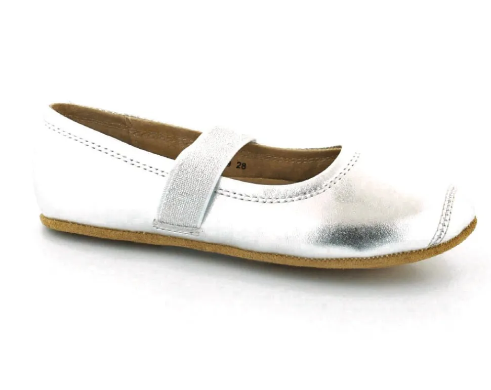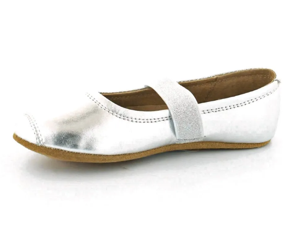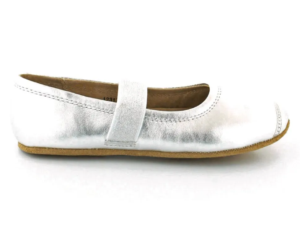 Super god hjemmesko fra Bisgaard model Ballet i sølvfarvet skind. Skoen er lavet som en balletsko med elastikrem over vristen, så den sidder godt fast. Skoen har en god fast hælkappe så den støtter barnets fod rigtig godt og med skindfoer i hele skoen. Der er ruskindssåler under bunden, med to gummifelter på, så barnet står bedre fast.