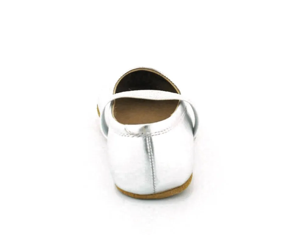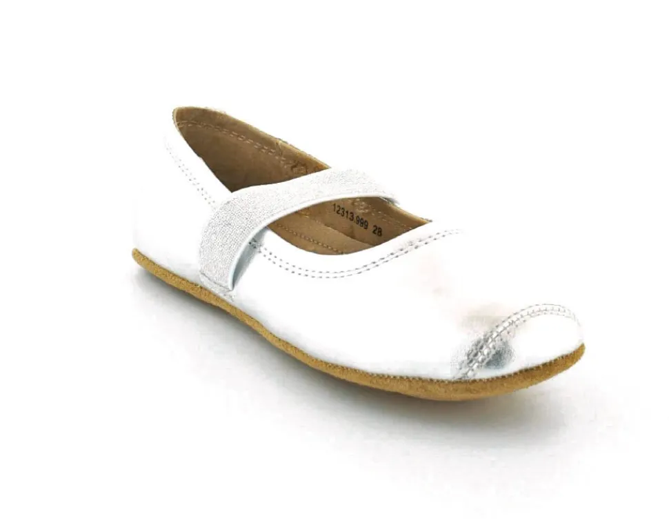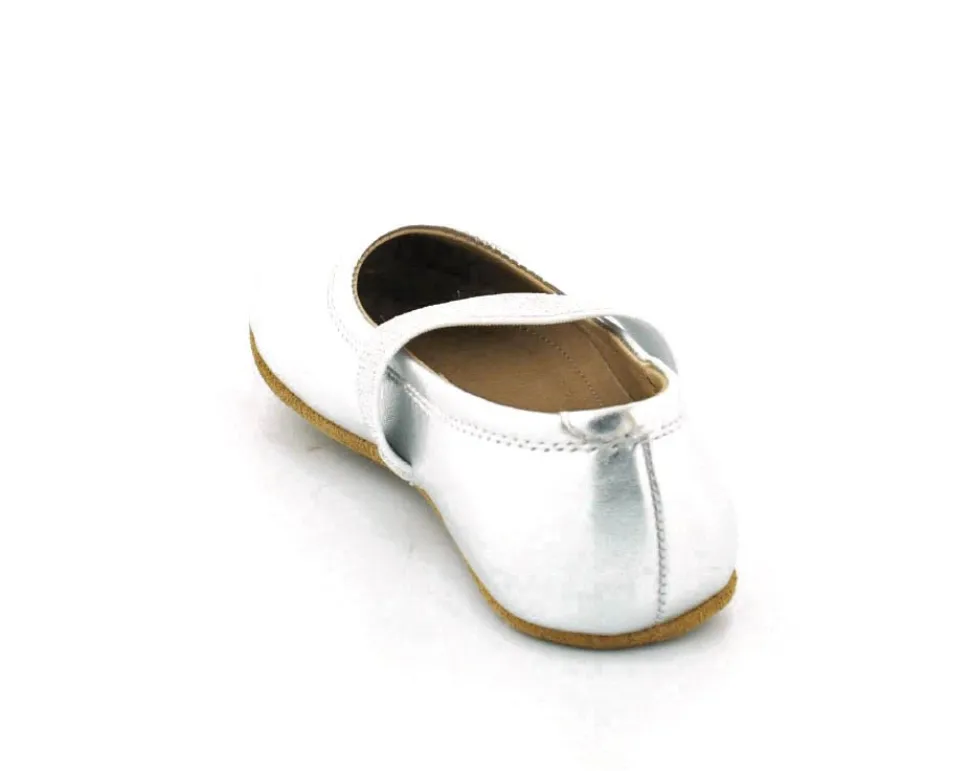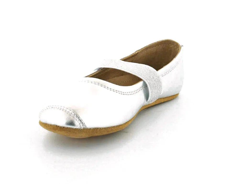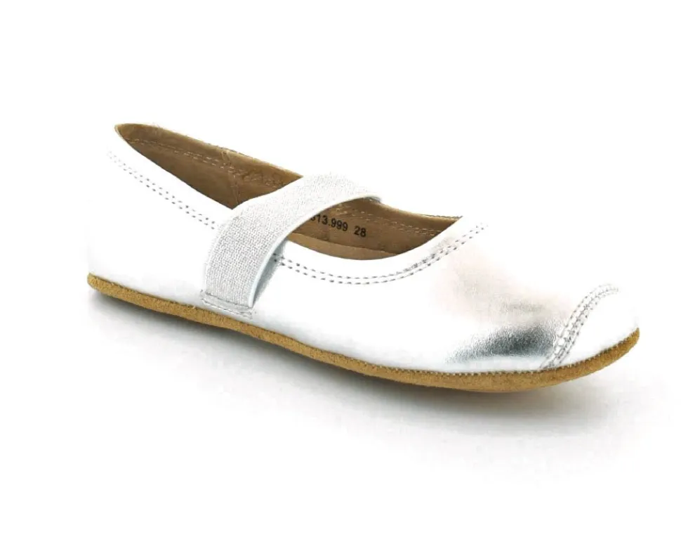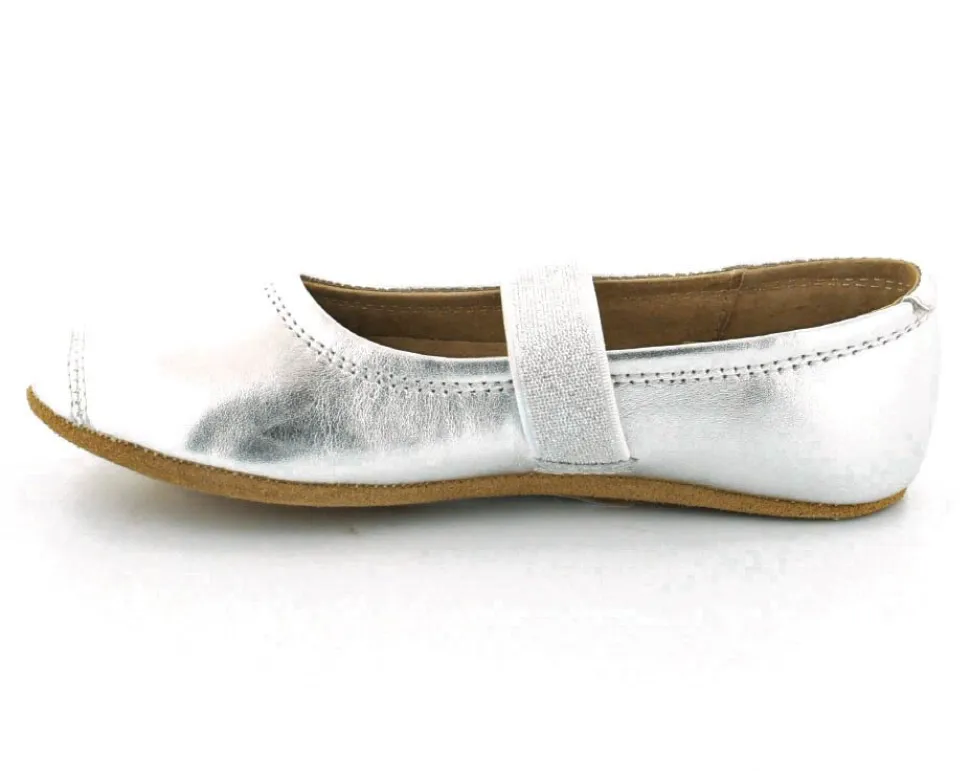 Super god hjemmesko fra Bisgaard model Ballet i sølvfarvet skind. Skoen er lavet som en balletsko med elastikrem over vristen, så den sidder godt fast. Skoen har en god fast hælkappe så den støtter barnets fod rigtig godt og med skindfoer i hele skoen. Der er ruskindssåler under bunden, med to gummifelter på, så barnet står bedre fast.