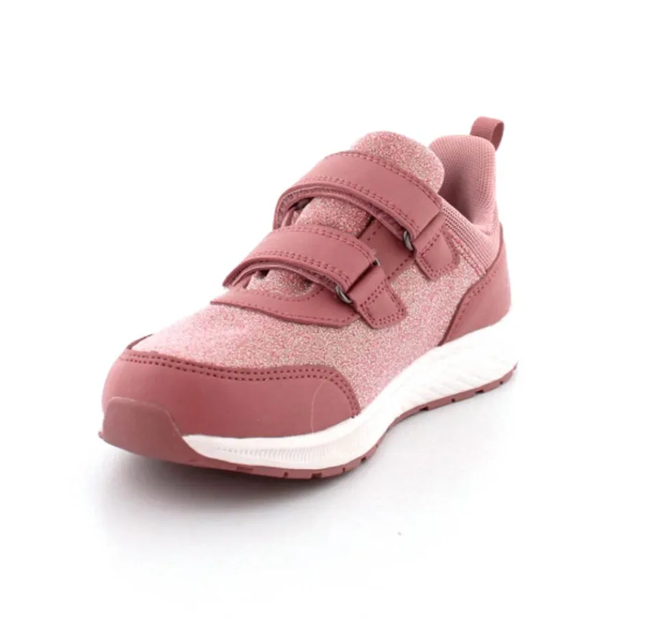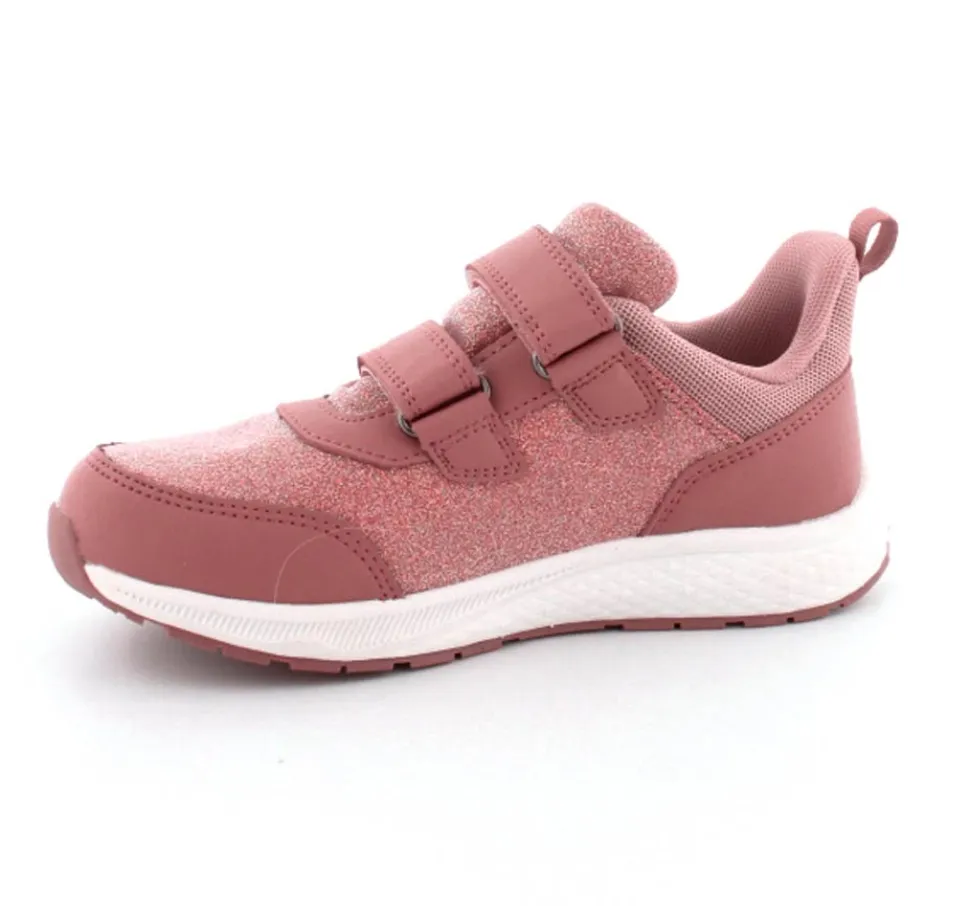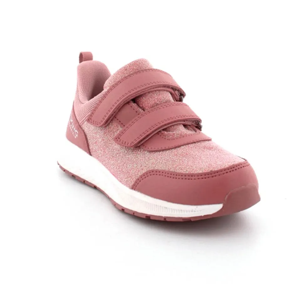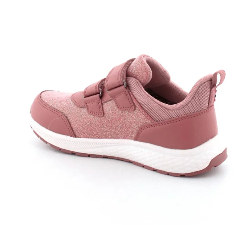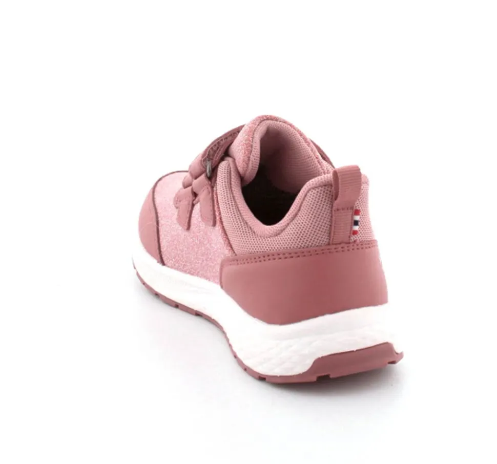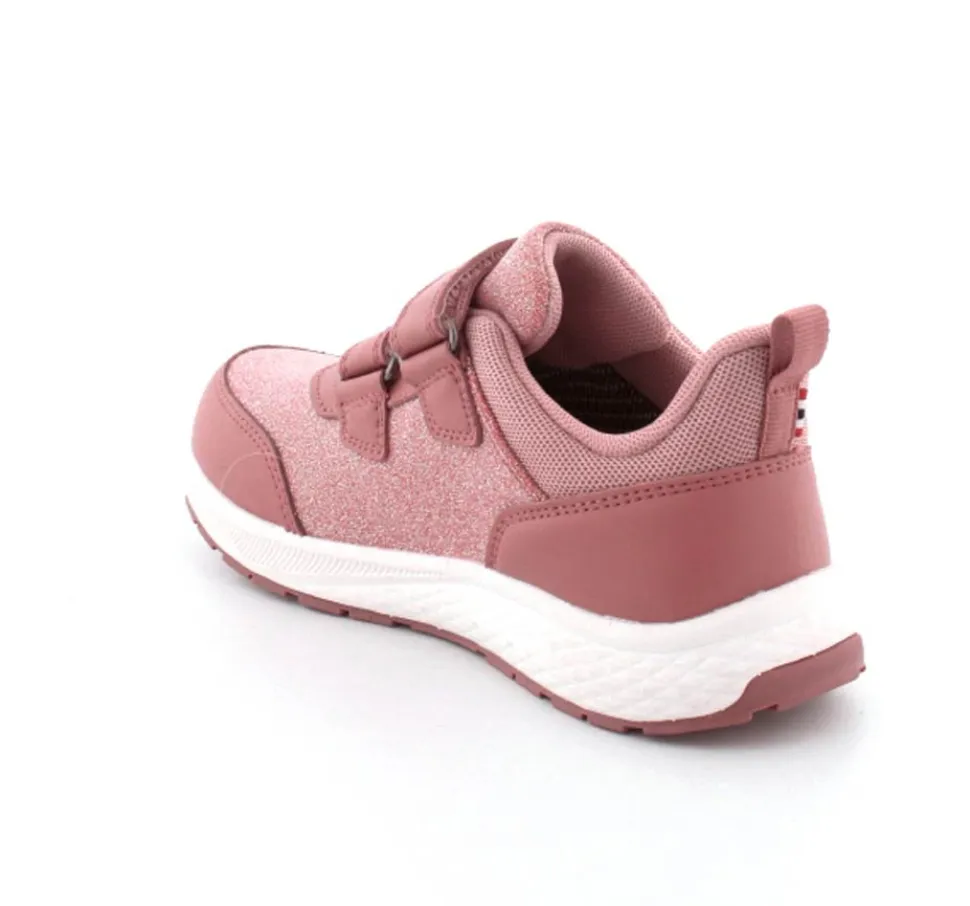 Super smarte sneakers fra Viking model Bouncy Glitter i gl. rosa med glimmer på. Skoen er med to regulerbare velcroremme og en fast hælkappe med slip-in effekt, så den er nem at komme i. Der er bl’defleksible gummisåler og skoen er vandtæt. Skoen kan vaskes på 30 grader skånevask.