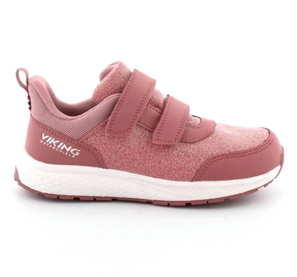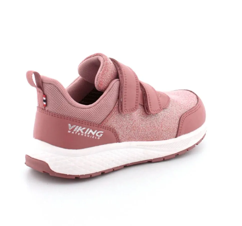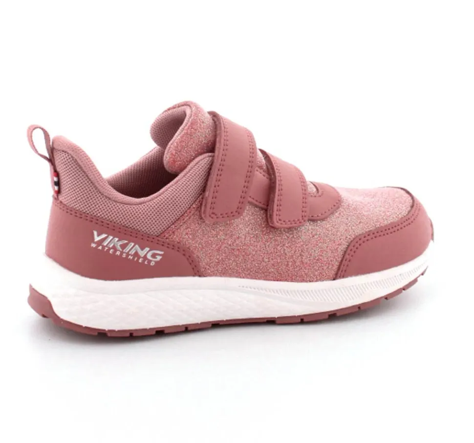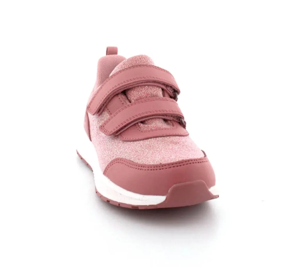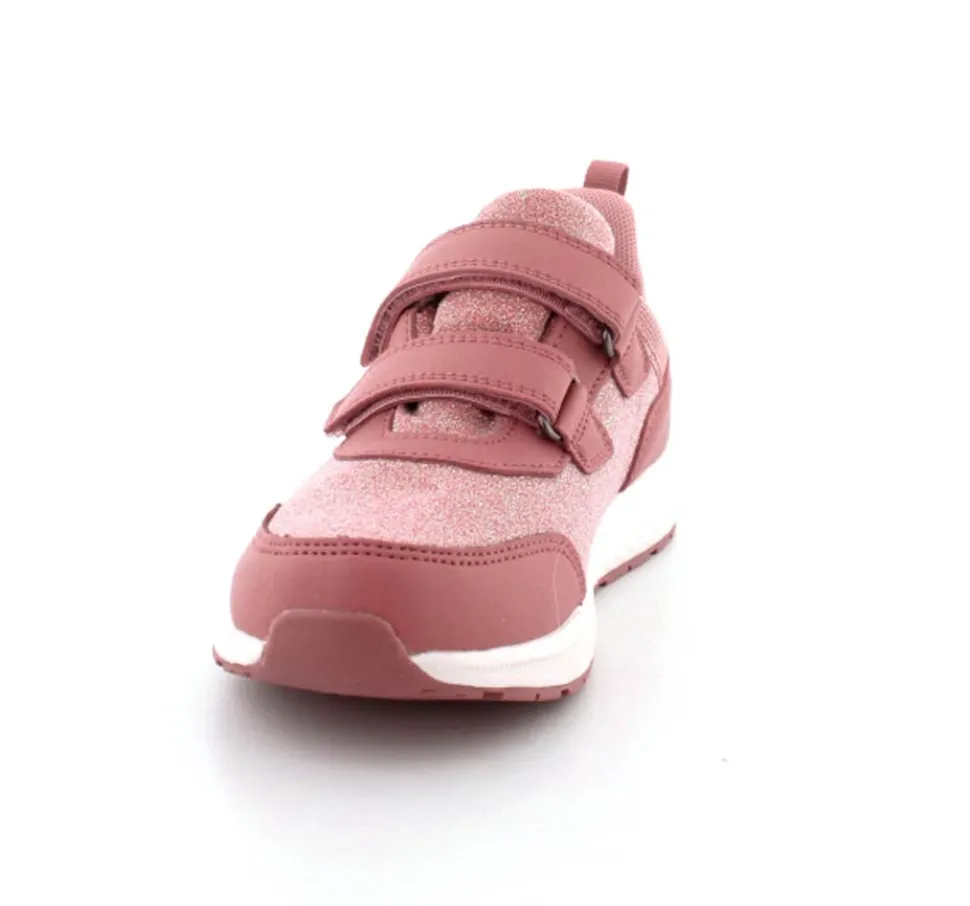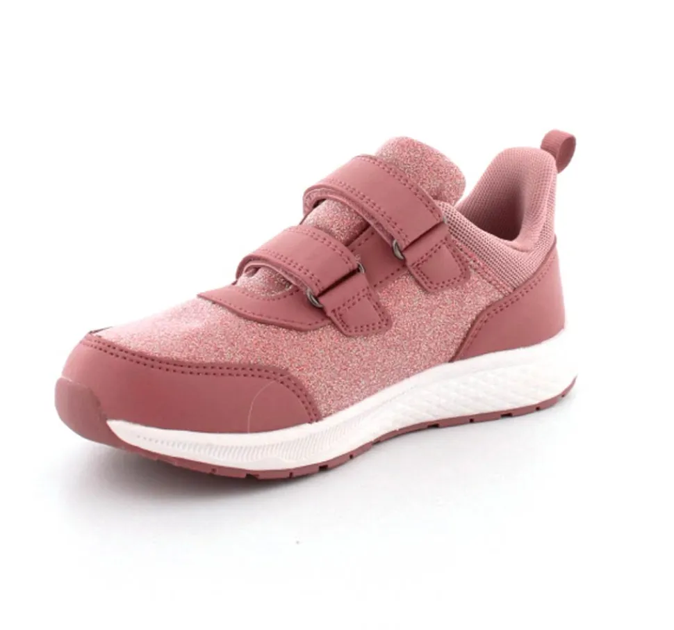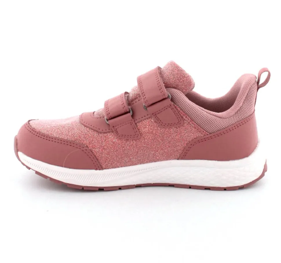 Super smarte sneakers fra Viking model Bouncy Glitter i gl. rosa med glimmer på. Skoen er med to regulerbare velcroremme og en fast hælkappe med slip-in effekt, så den er nem at komme i. Der er bl’defleksible gummisåler og skoen er vandtæt. Skoen kan vaskes på 30 grader skånevask.
