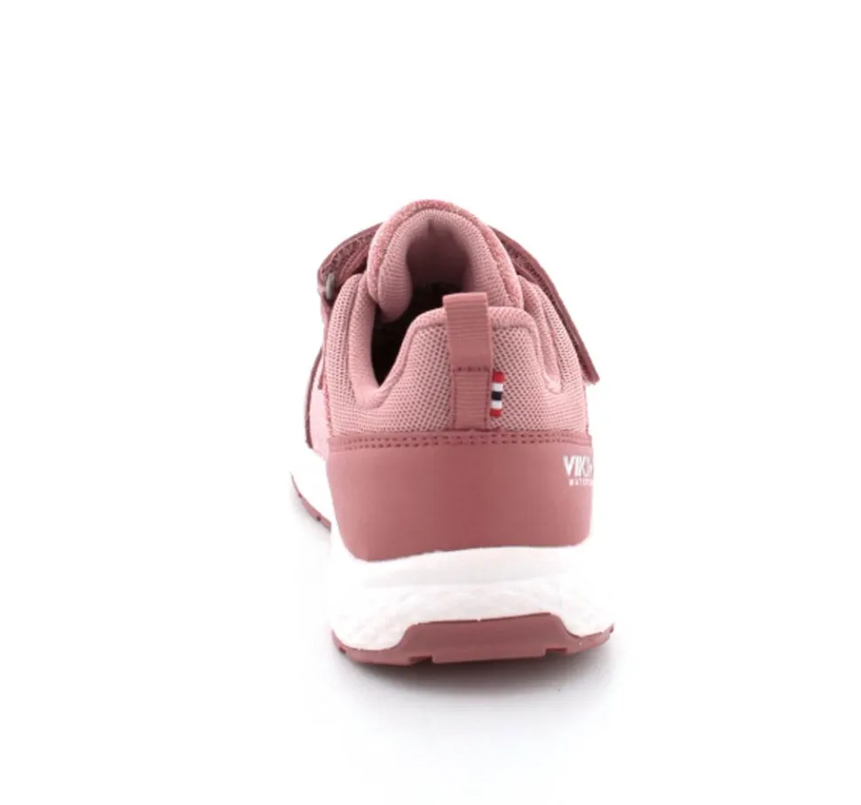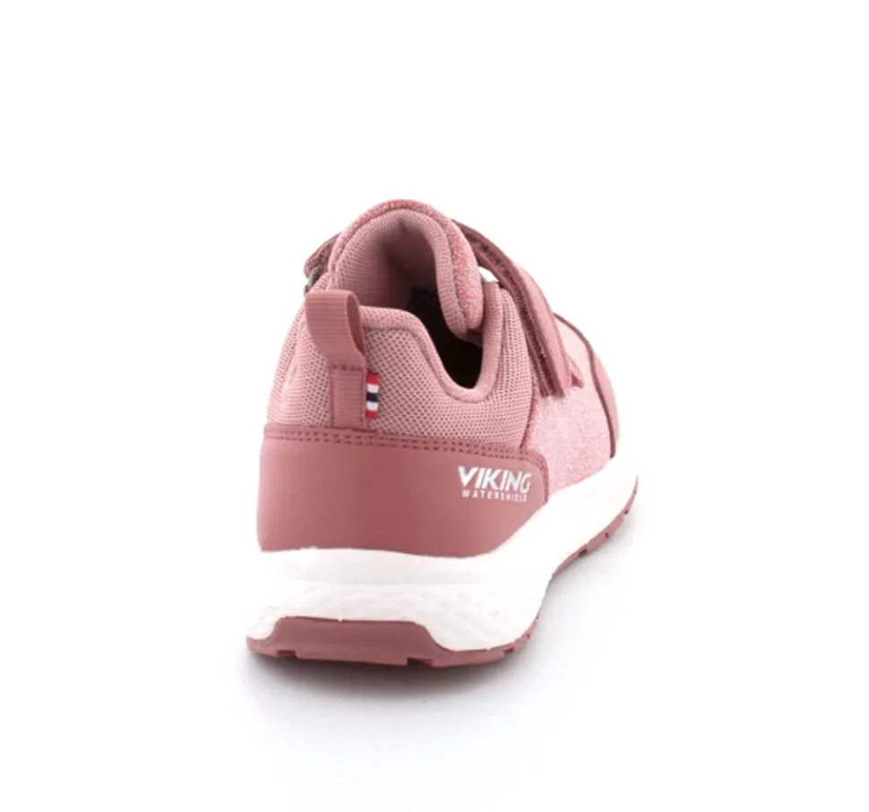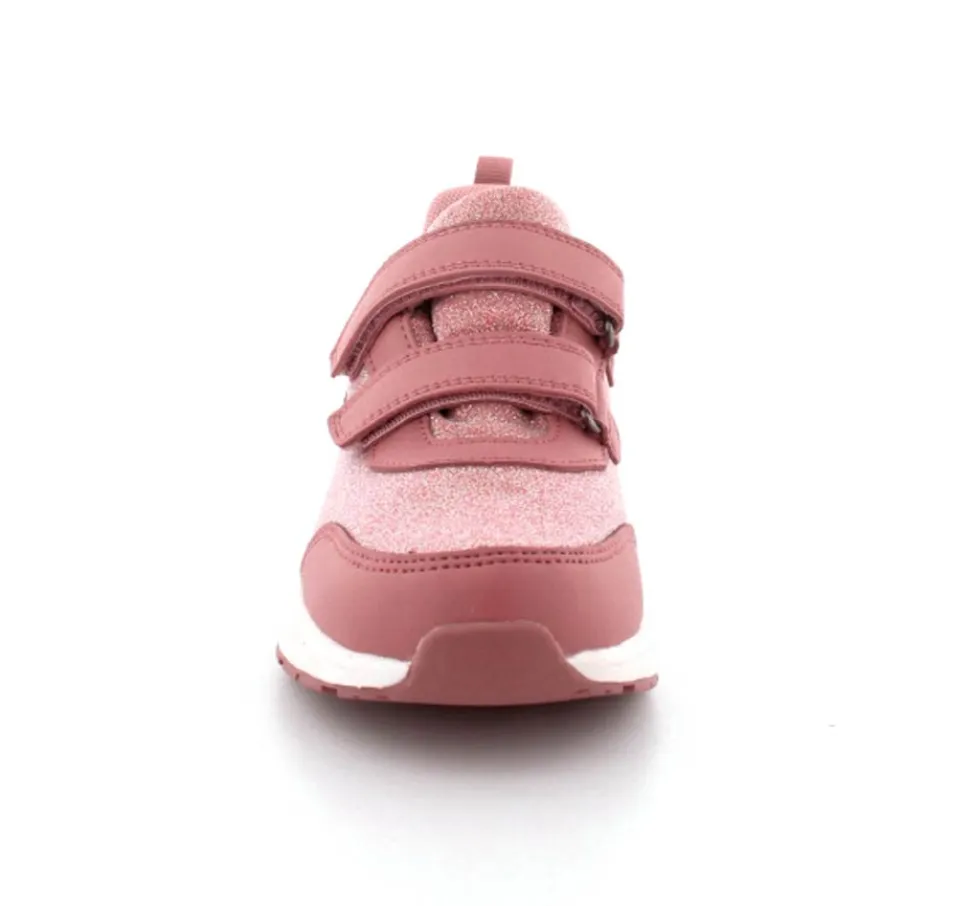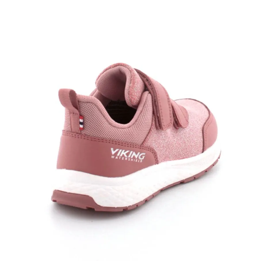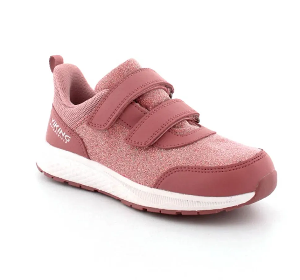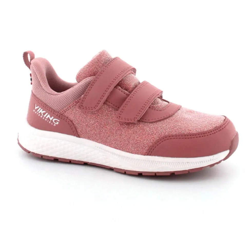 Super smarte sneakers fra Viking model Bouncy Glitter i gl. rosa med glimmer på. Skoen er med to regulerbare velcroremme og en fast hælkappe med slip-in effekt, så den er nem at komme i. Der er bl’defleksible gummisåler og skoen er vandtæt. Skoen kan vaskes på 30 grader skånevask.