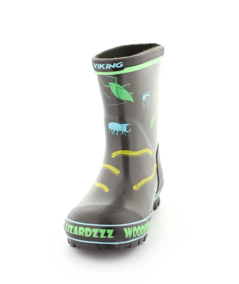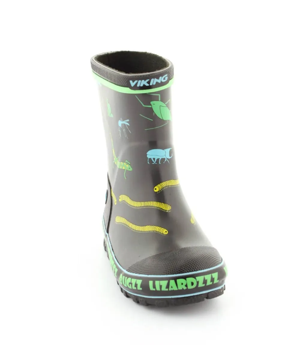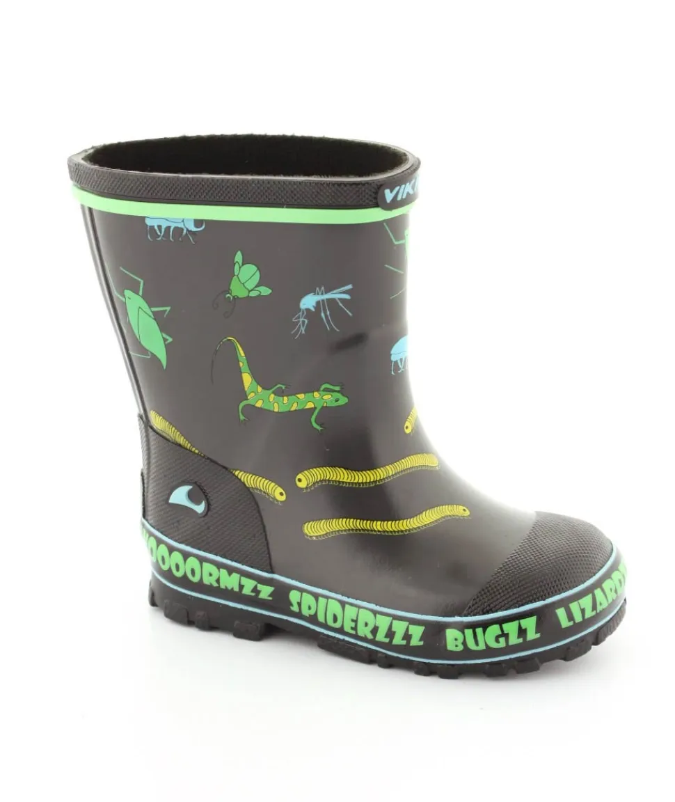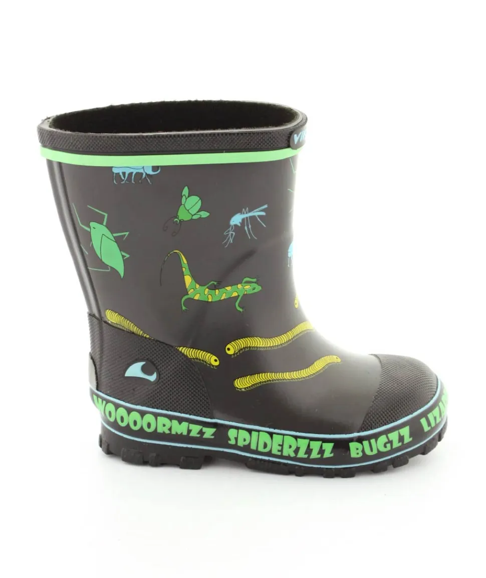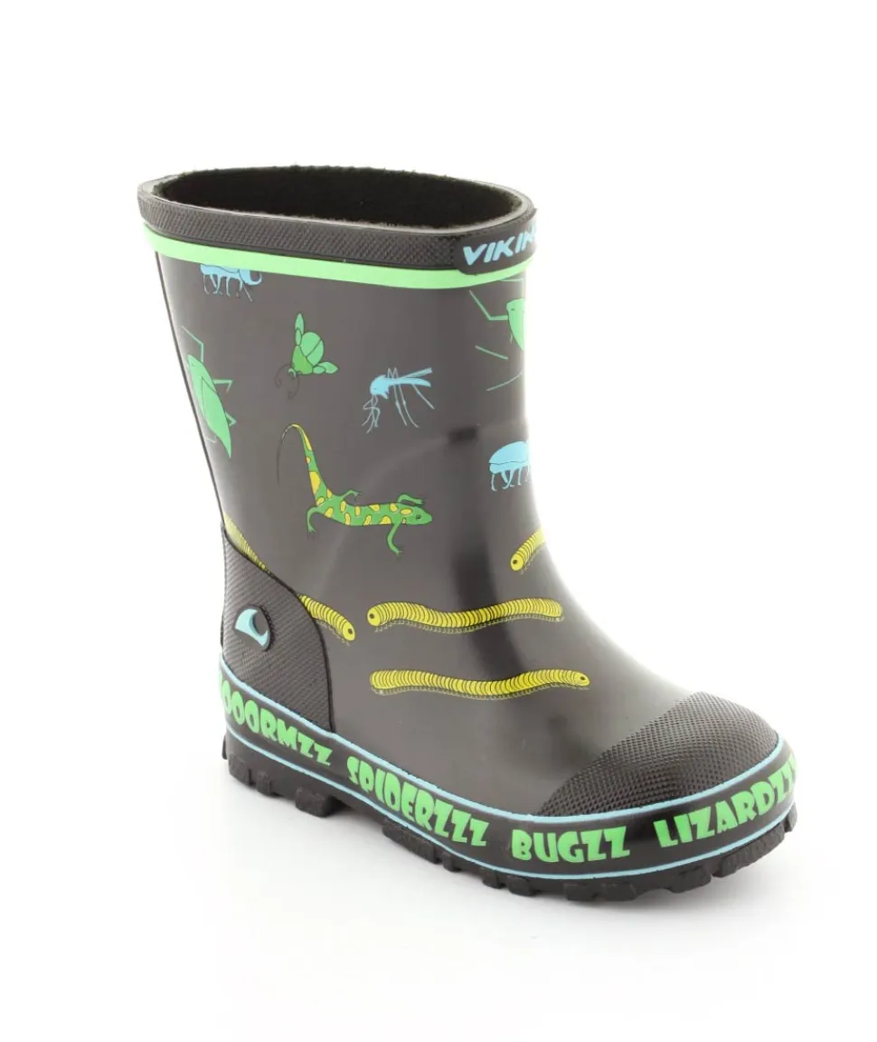 Rigtig fed gummistøvle til drenge fra Viking. Gummistøvlen er grå med motiver af forskellige insekter. Den er lavet i blødt naturgummi og sålerne er meget bløde og fleksible. Gummistøvlen fra Viking har en rigtig god pasform og sidder godt til om barnets fod. Støvlen er hverken for lang til barnet eller for kort.