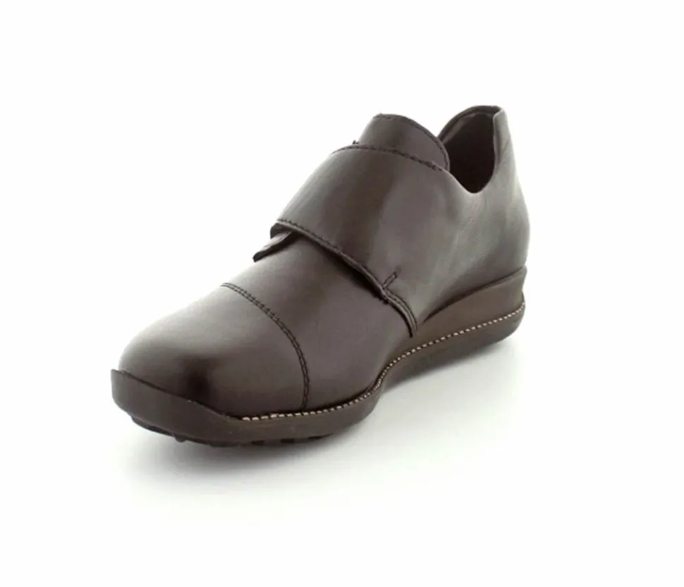 Rigtig god skindsko fra Rieker i sort skind. Skoen er med velcro og er meget nem at komme i og justere efter fodens bredde. Skoen rummer godt og har bløde og fleksible gummisåler under hele bunden, med god profil så man står godt fast. Der er Rieker-Tex membran., så den kan klare fugtigt vejr.