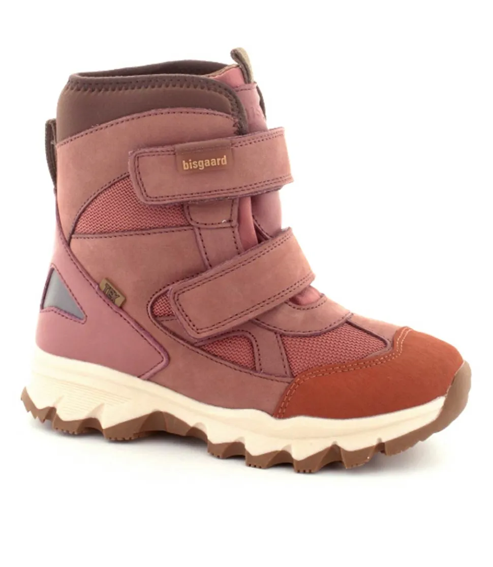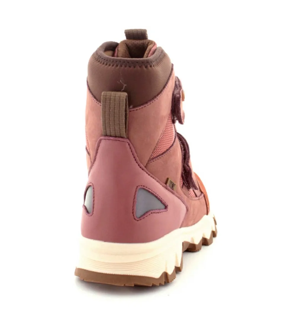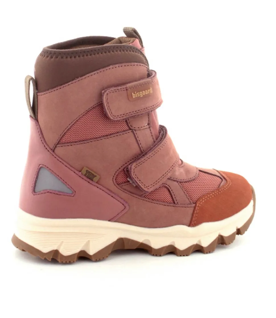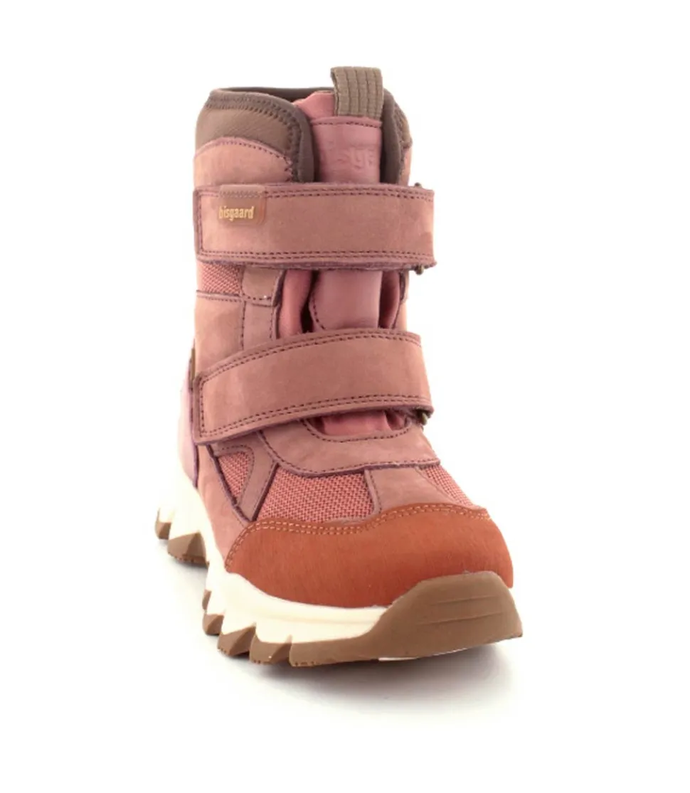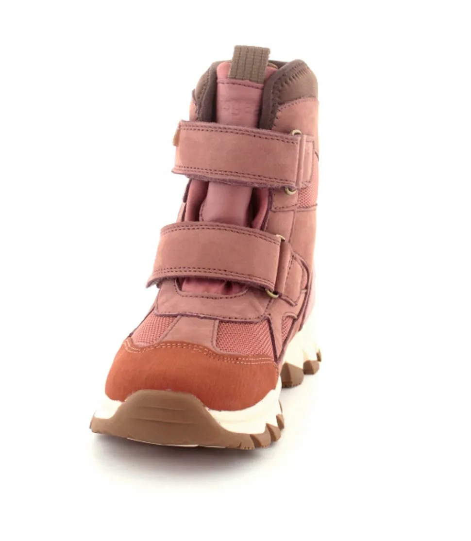 Super gode og praktiske vinterstøvler fra Bisgaard model Edon Heather i gl rosa. Støvlen er med to regulerbare velcroremme og har et super godt hold på foden. Der er B400 thinsulate isolation i den så den kan holde sig varm ned til minus 15 grader. Der er også tex membran så den kan klare snevejret. Gode solide gummisåler under hele bunden og en dejlig let støvle.