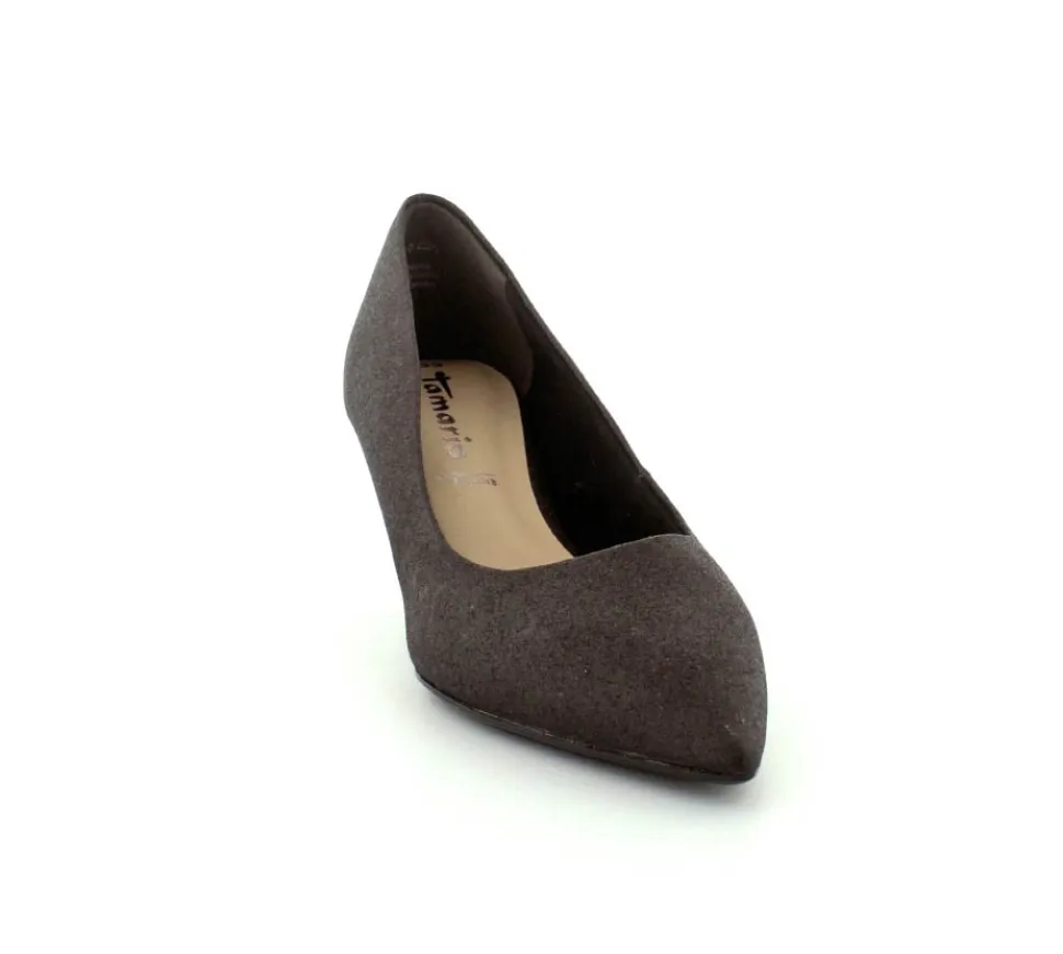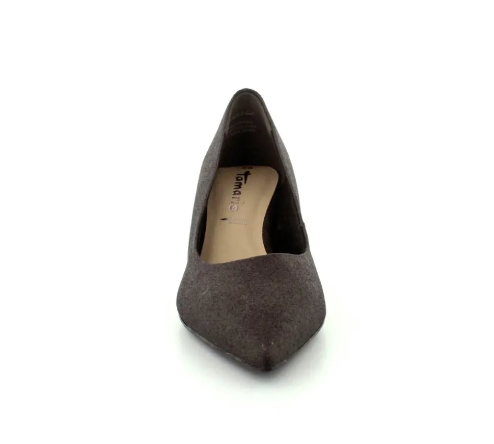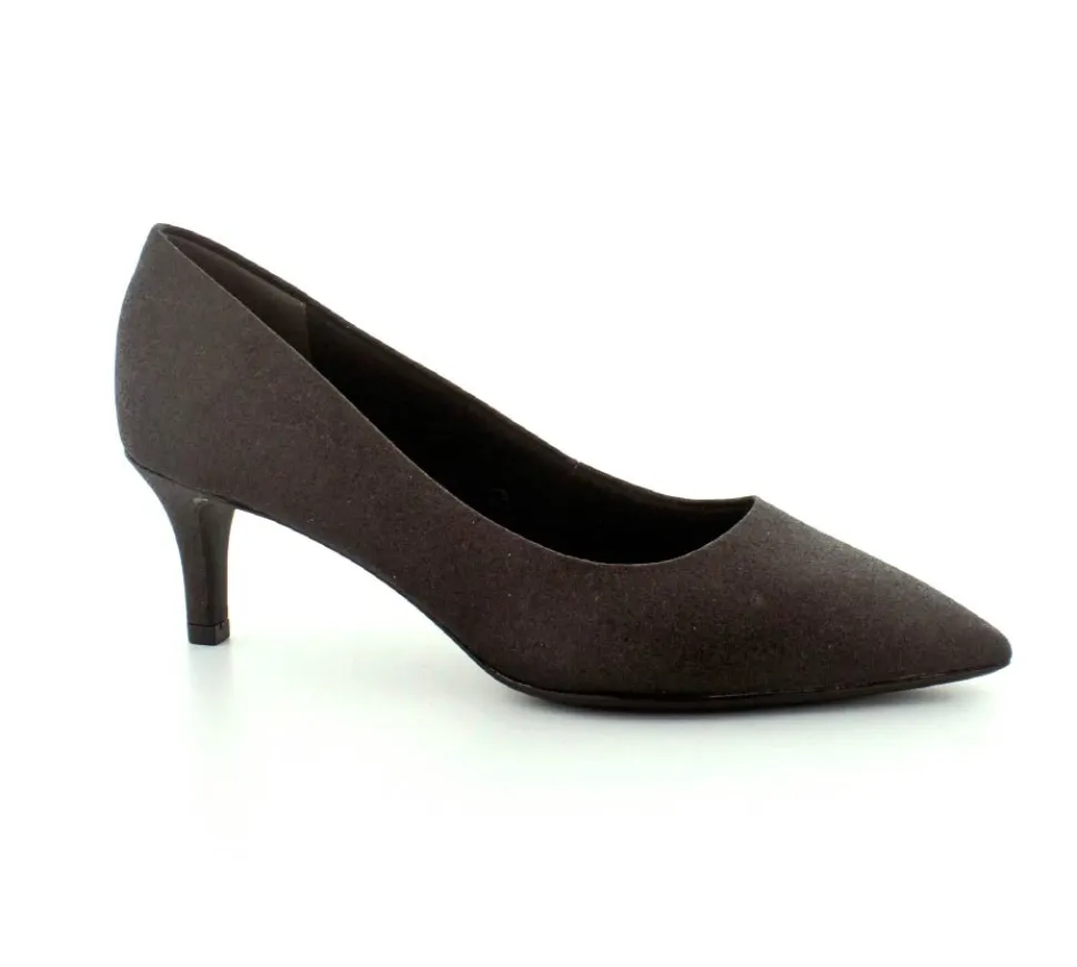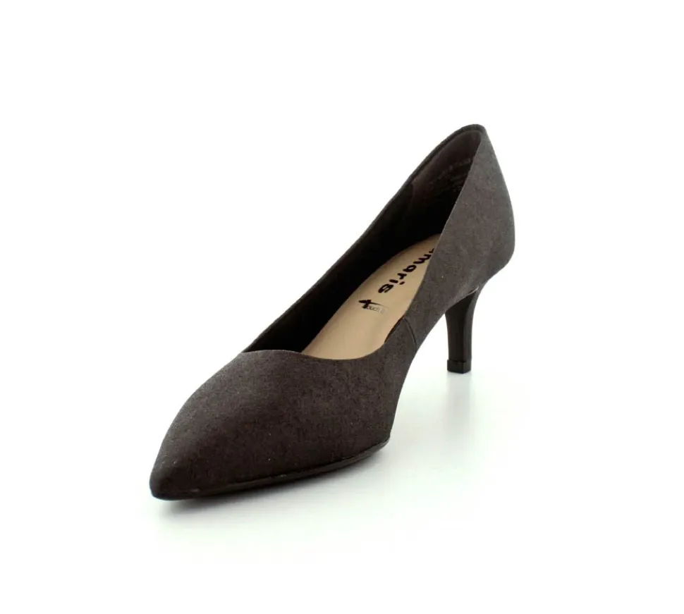 Flot og elegant pump fra Tamaris i sort med sølv glimmer. Skoen er med spids snude og stilethæl. Nem at gå i og med bløde Touch It såler indeni.