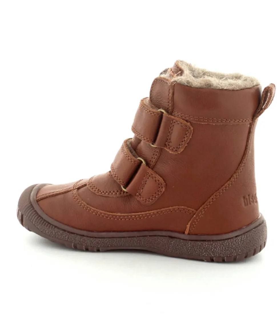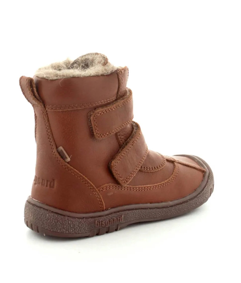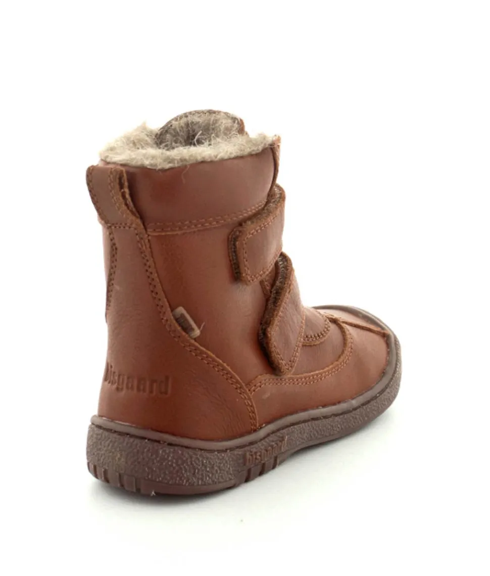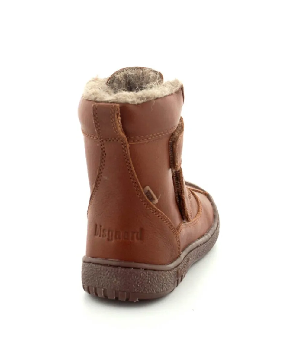 Super lækker vinterstøvle fra Bisgaard i cognacfarvet skind. Støvlen har en rigtig god pasform med god fast hælkappe, gummisnude og to regulerbare velcroremme. Støvlen passer godt til en smal og normal fod, da den kan strammes helt til. Støvlen fra Bisgaard er foeret med rigtig uld og har aftagelige uldsåler. Der er Tex membran, så den kan klare sne og kulde. Bløde fleksible gummisåler under hele bunden.