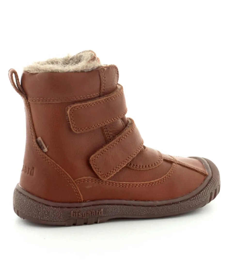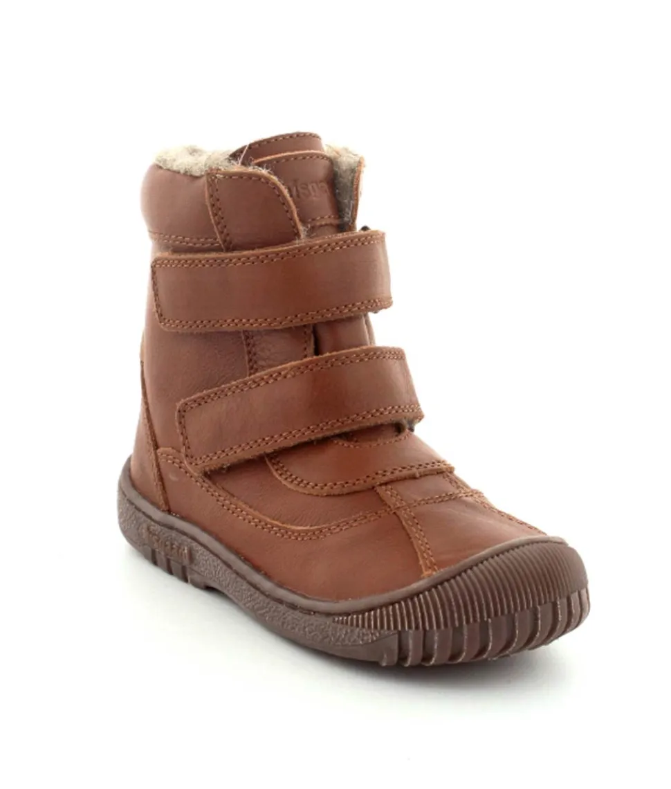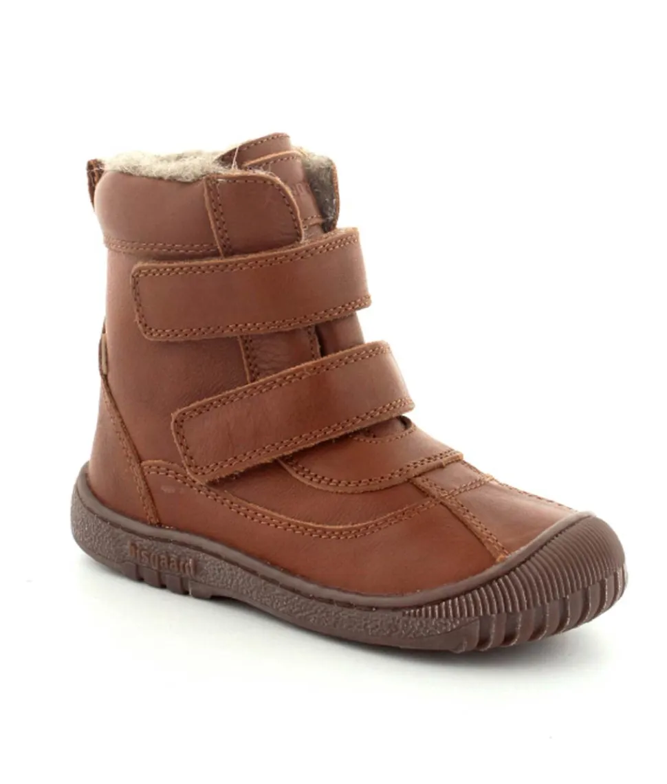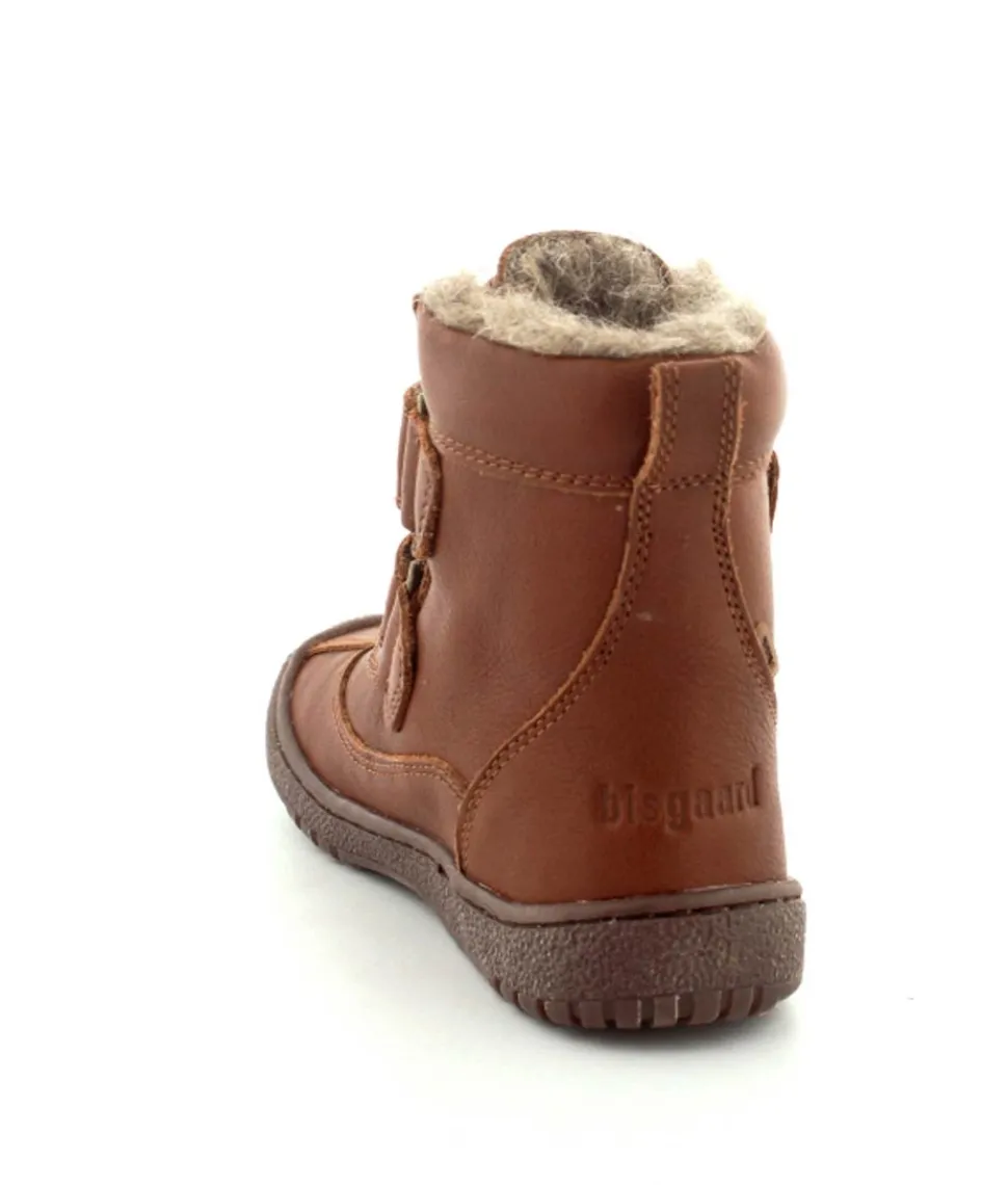 Super lækker vinterstøvle fra Bisgaard i cognacfarvet skind. Støvlen har en rigtig god pasform med god fast hælkappe, gummisnude og to regulerbare velcroremme. Støvlen passer godt til en smal og normal fod, da den kan strammes helt til. Støvlen fra Bisgaard er foeret med rigtig uld og har aftagelige uldsåler. Der er Tex membran, så den kan klare sne og kulde. Bløde fleksible gummisåler under hele bunden.