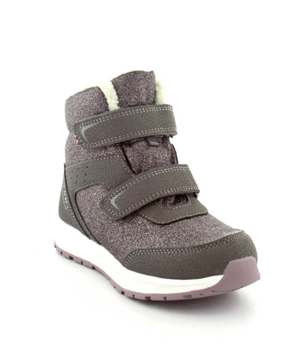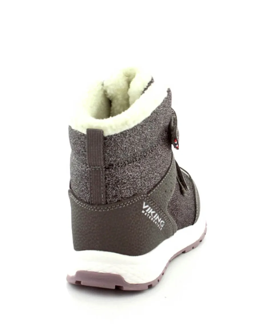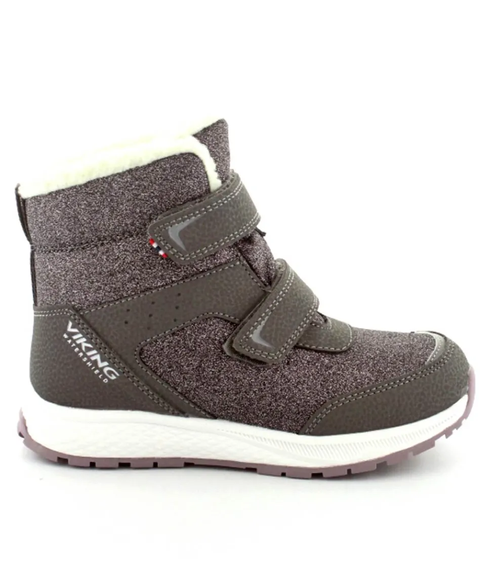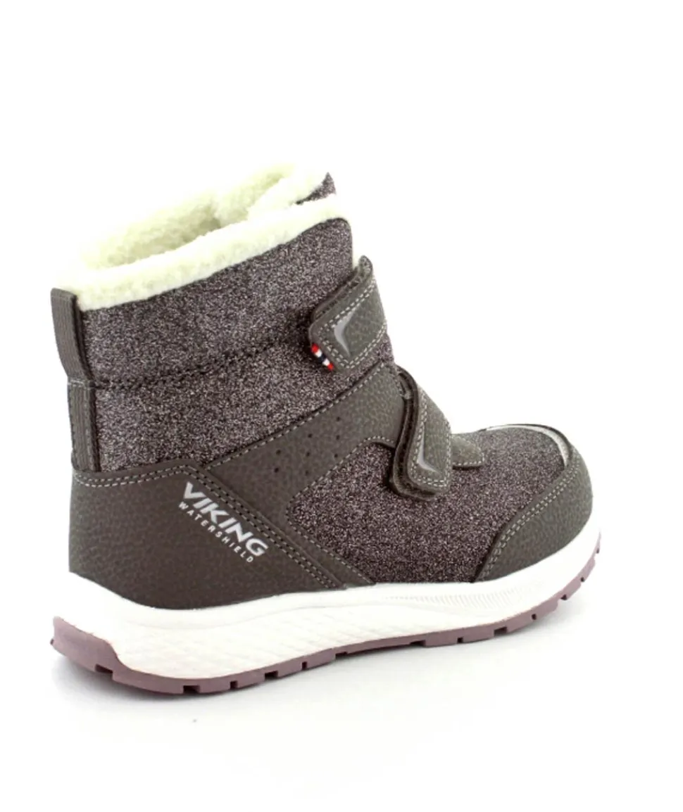 Super smarte vinterstøvler fra Viking model Equip Warm i metallic farve fyldt med glitter på. Støvlen er varmt foeret og med tex membran, så den kan klare sne og kulde. Der er to regulerbare velcropremme og gode fleksible gummisåler under hele bunden.