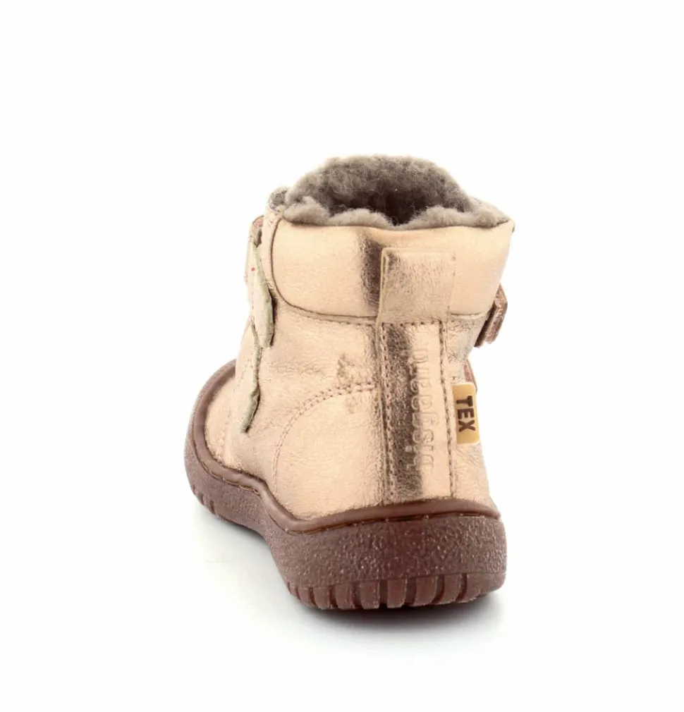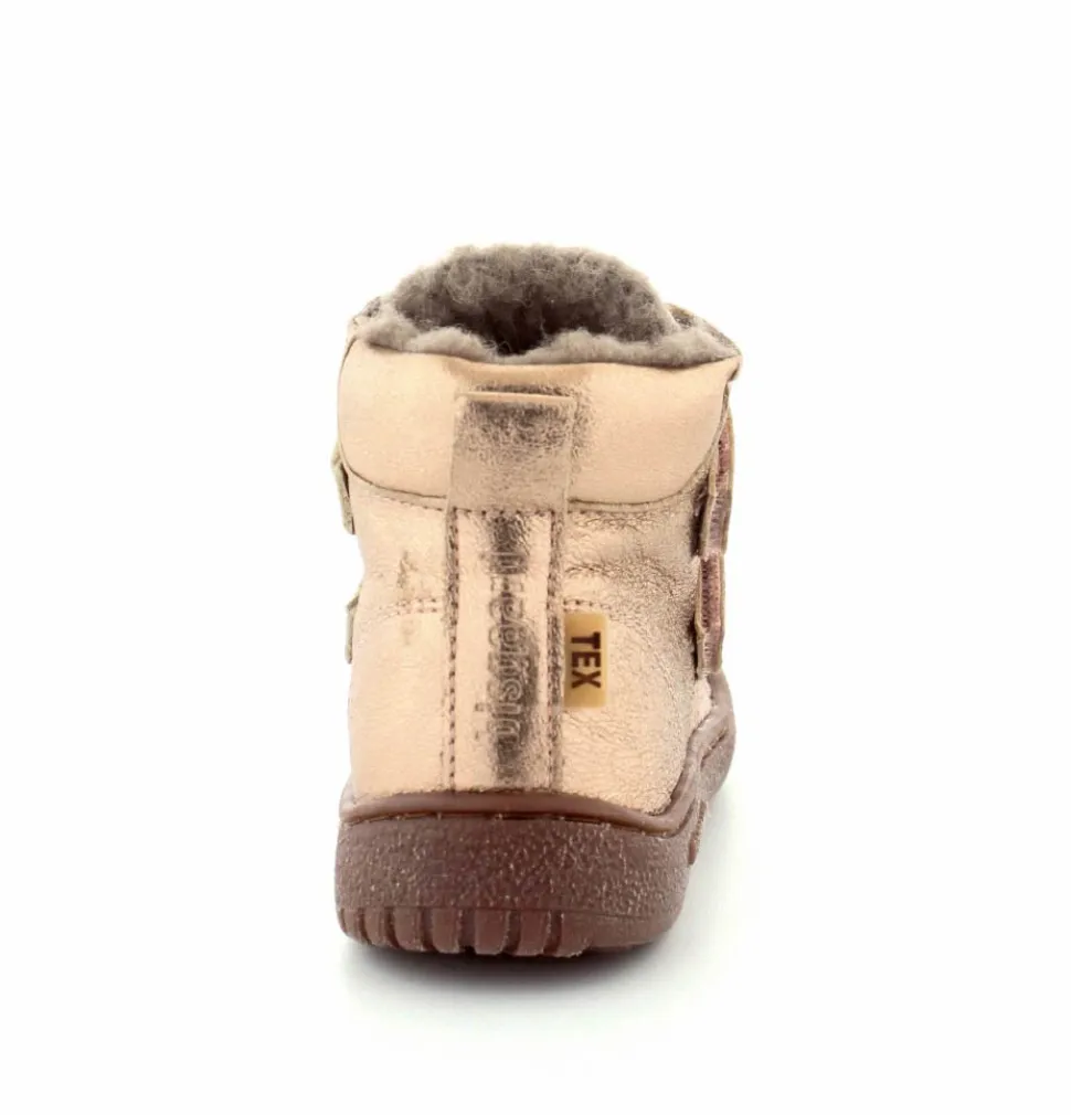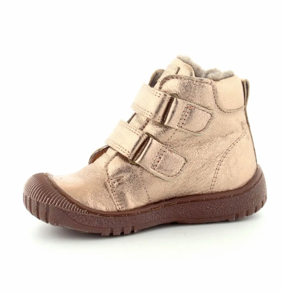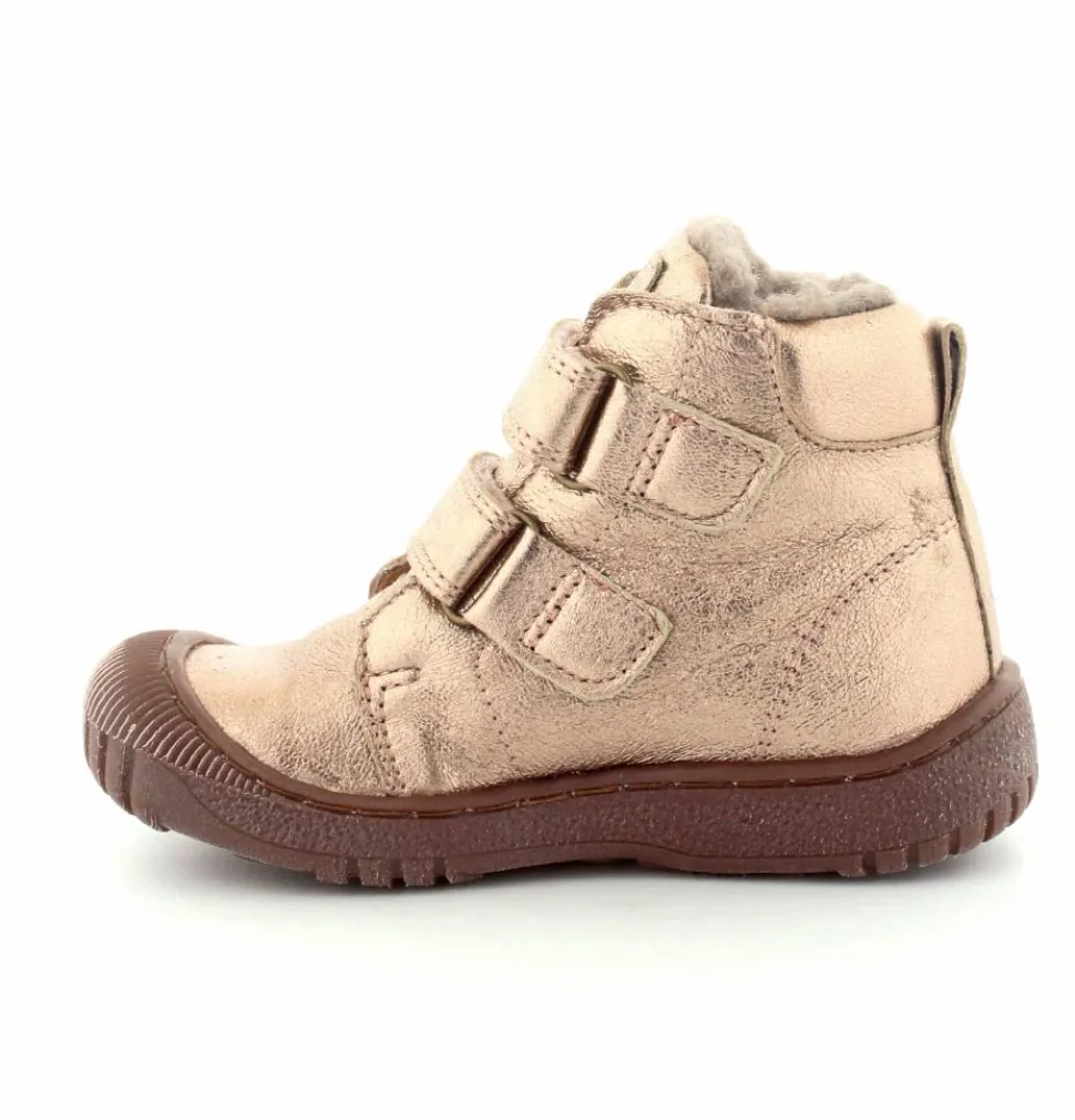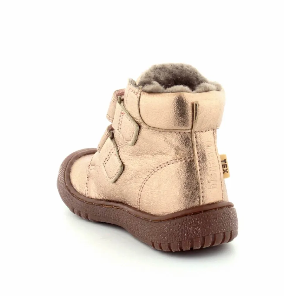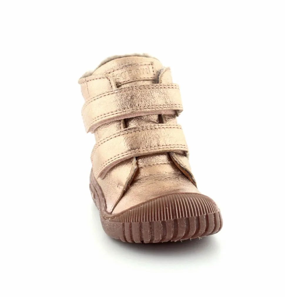 Super flotte og rigtig gode vinterstøvler fra Bisgaard i en flot bronzefarvet skind. Støvlerne er foeret med rigtig uldfoer, har gummisåler under bunden og er med tex membran, så den kan klare sne og kulde. Støvlen er nem at komme i med to regulerbare velcroremme.