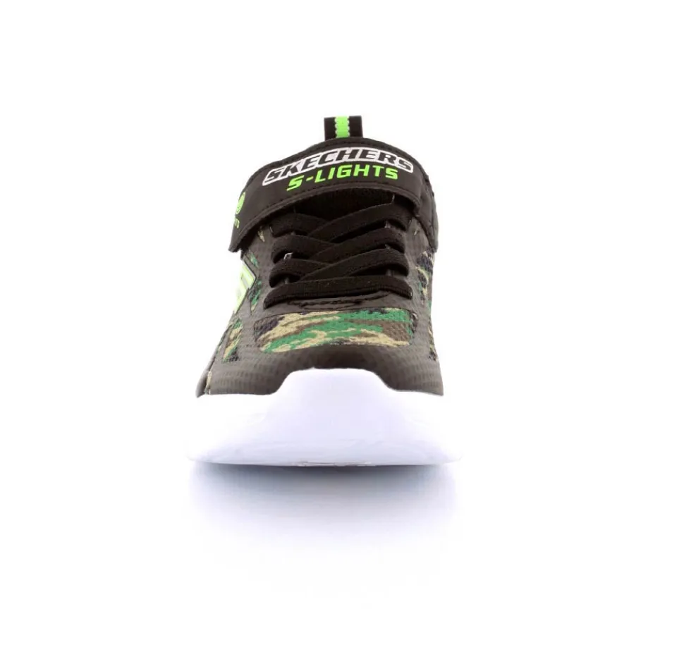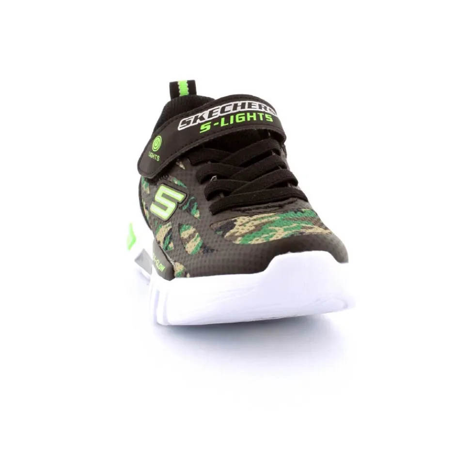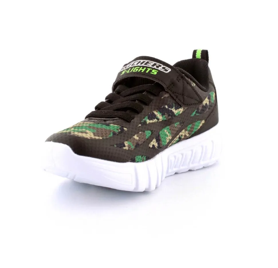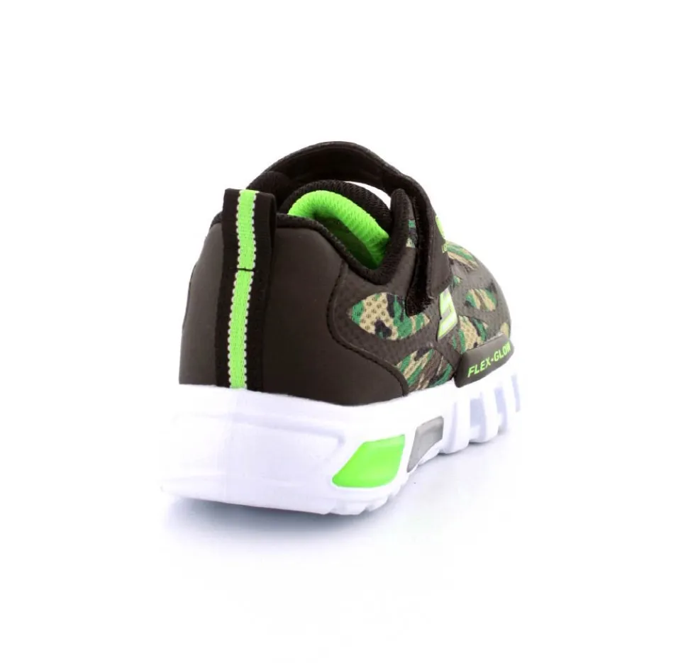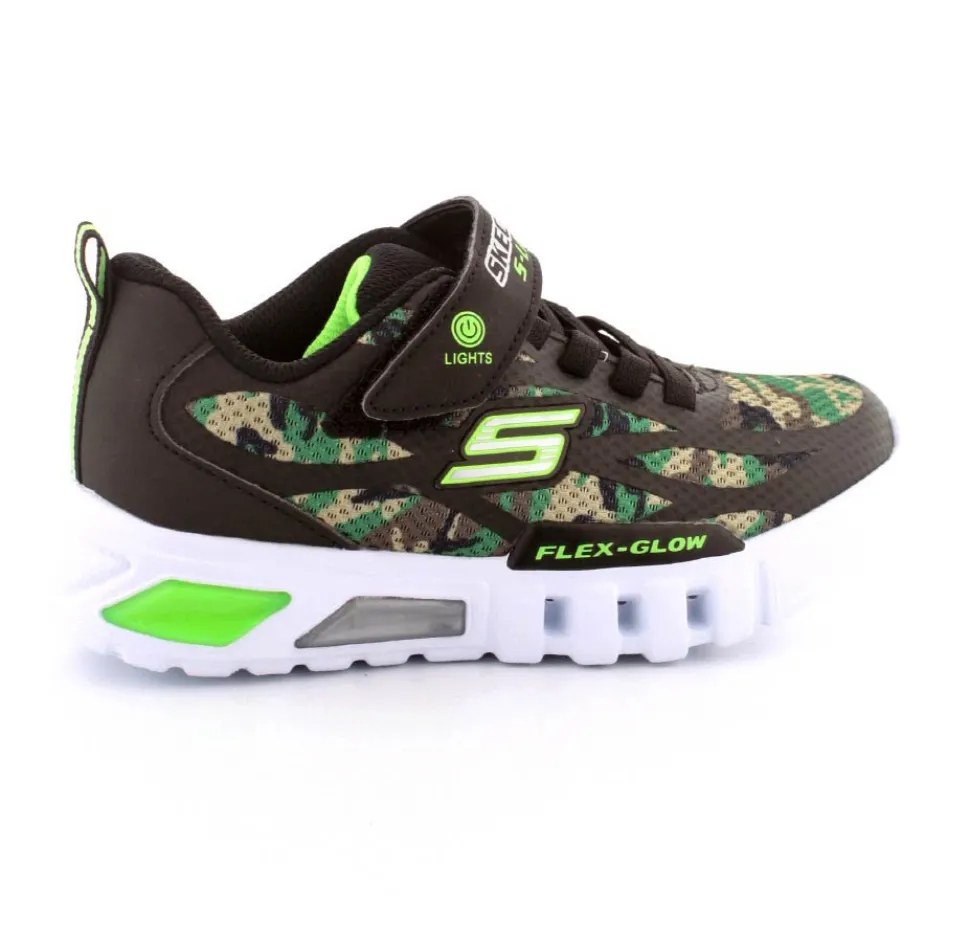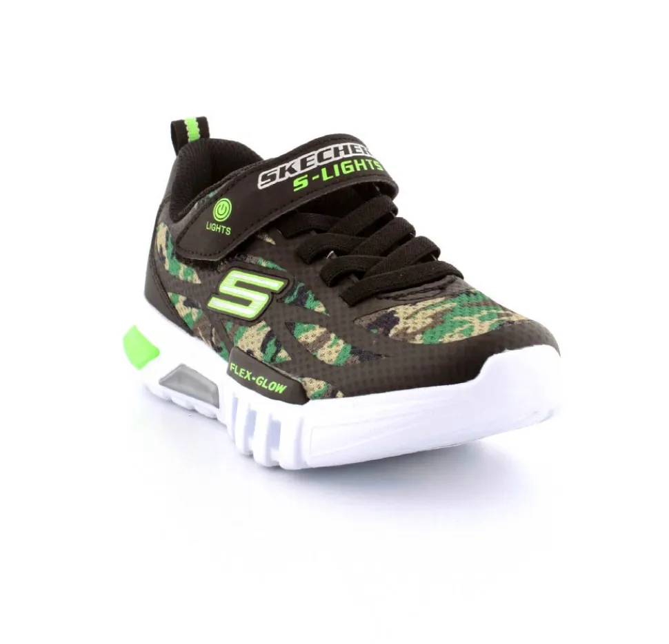 Super fede blinkesko til drenege fra Skechers model Flex-Glow. Flot i den camoflacefarvet. Skoen er med en regulerbar velcrorem og elastiksnøre, så den er nem at komme i. Der er god fast hælkappe og god plads i bredden af skoen. Skoen fra Skechers er meget let og har fleksible og stødabsoberende såler under hele bunden. Den blinker ved bevægelse, men den kan slukkes på en knap på remmen ved behov for ingen lys.