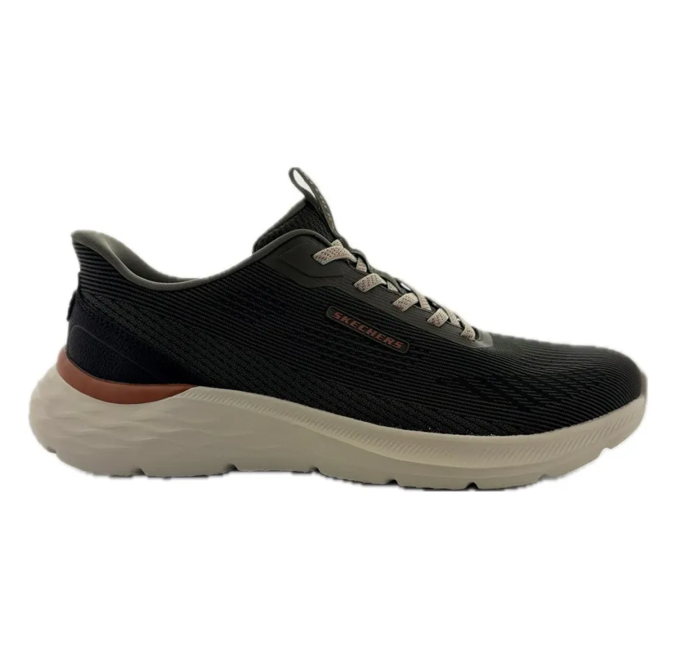 Super smarte sneakers fra Skechers i en flot armygrøn farve. Skoen er med Slip-ins, så den er lige til at tage på uden brug af hænder eller skohorn. Dejlig bløde såler og ekstra vidde i skoen.