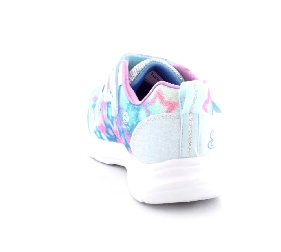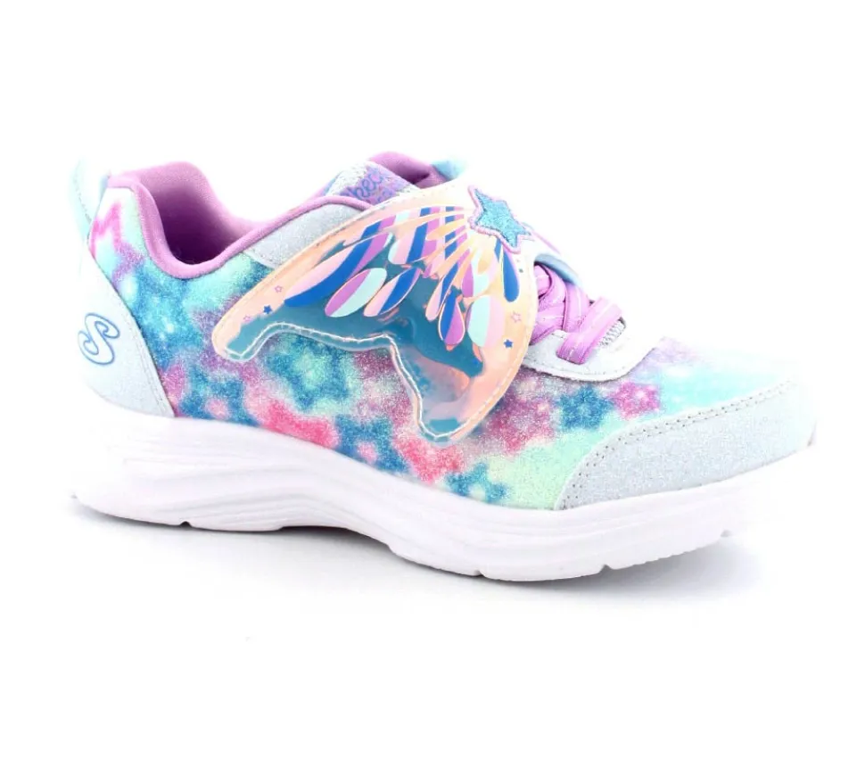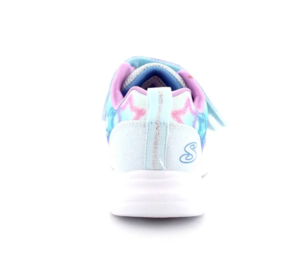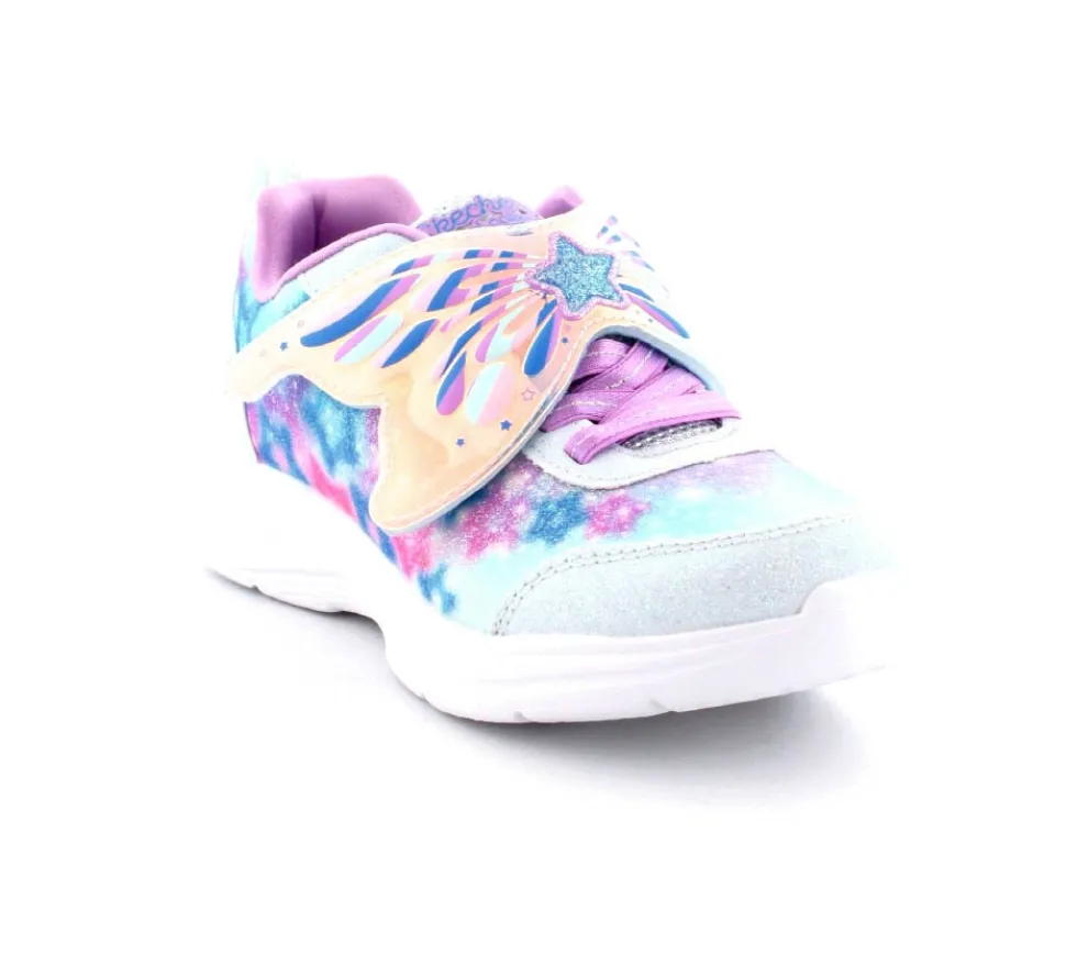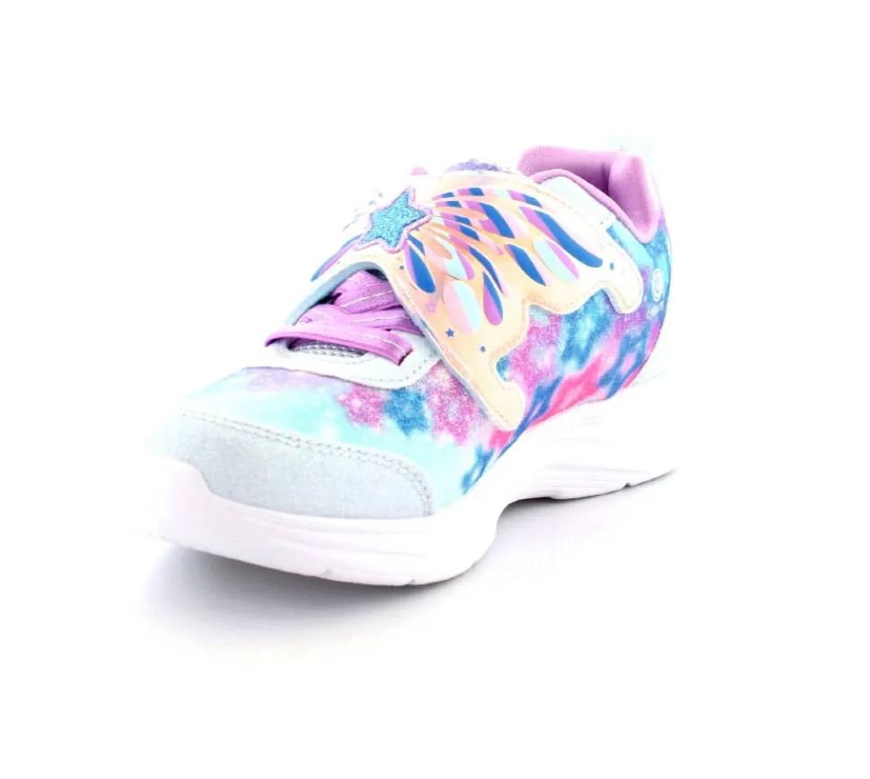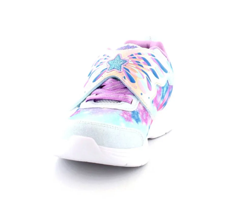 Super fine sneakers fra Skechers model Glimmer Kicks Fairy – enhver piges drøm. Skoen er en blinkesko, der blinker i fevingerne på toppen. Det er en stort velcrorem, så den er nem at tage på. Dejlig bløde og lette såler. Lyset kan man slukke for efter behov. Skoen er lidt til den store side.