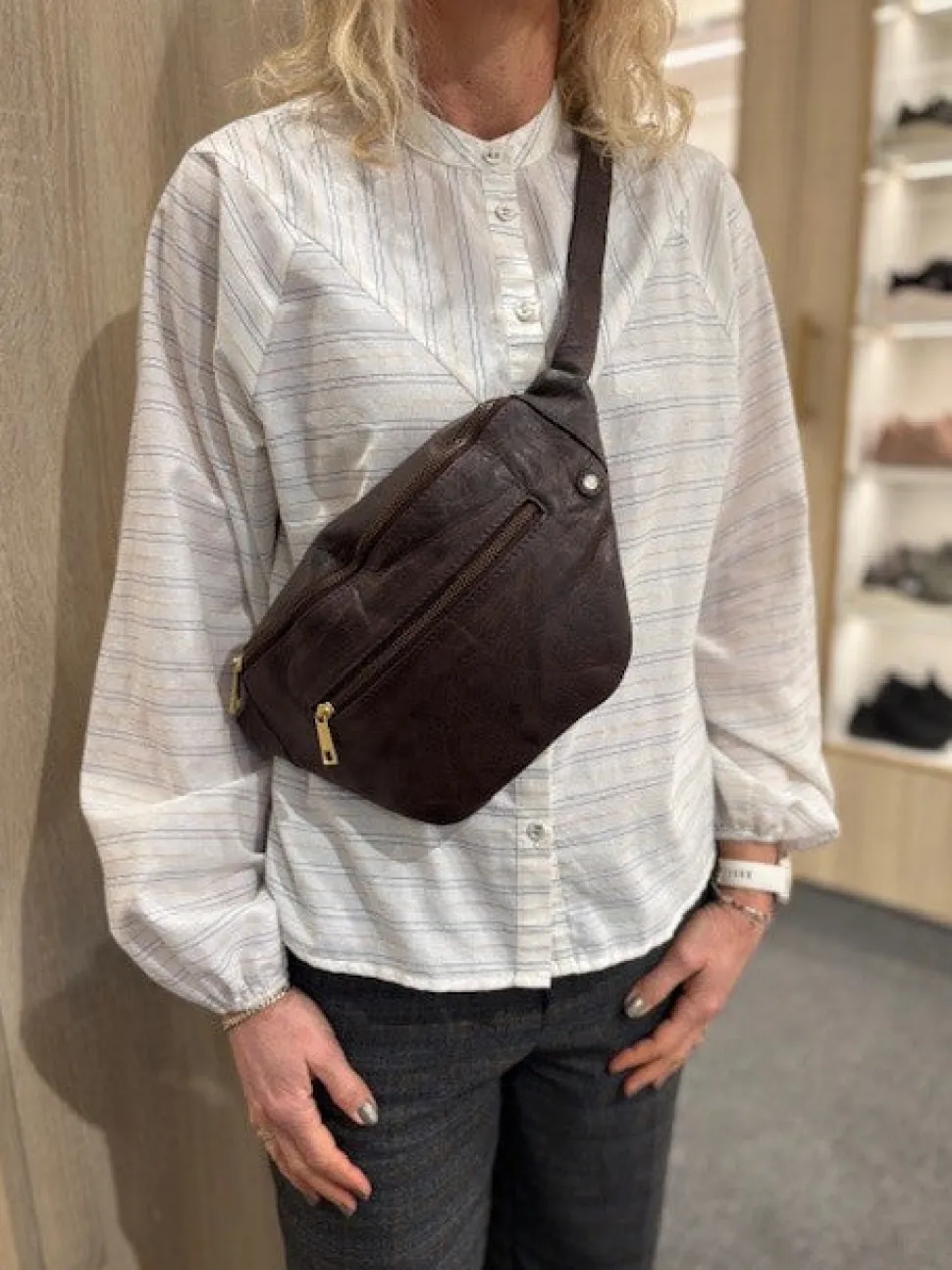 Flot og klassisk bumbag i mørkebrunt skind fra Depeche i serien Golden Chic. Tasken er med lynlåse og der er to store rum. Indeni er der også lynlåsrum og to små lommer. Tasken kan reguleres i skulderremmen. Flot både til hverdag og fest.
