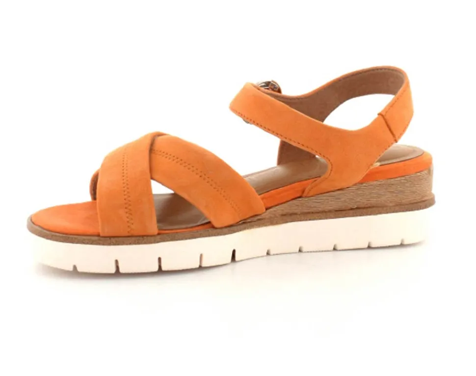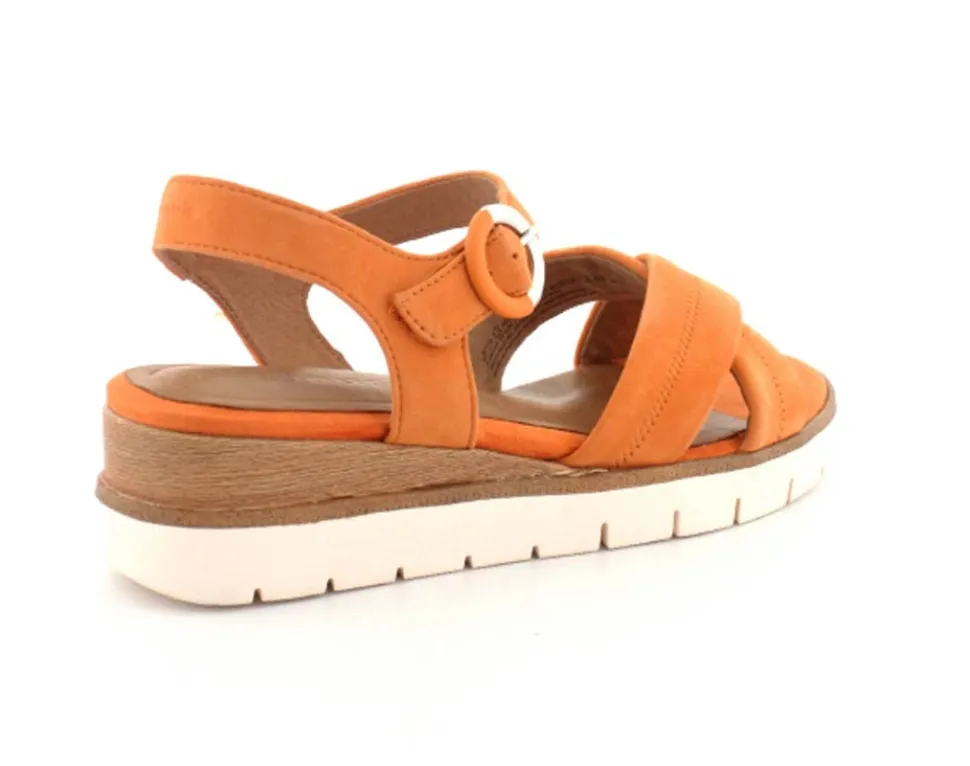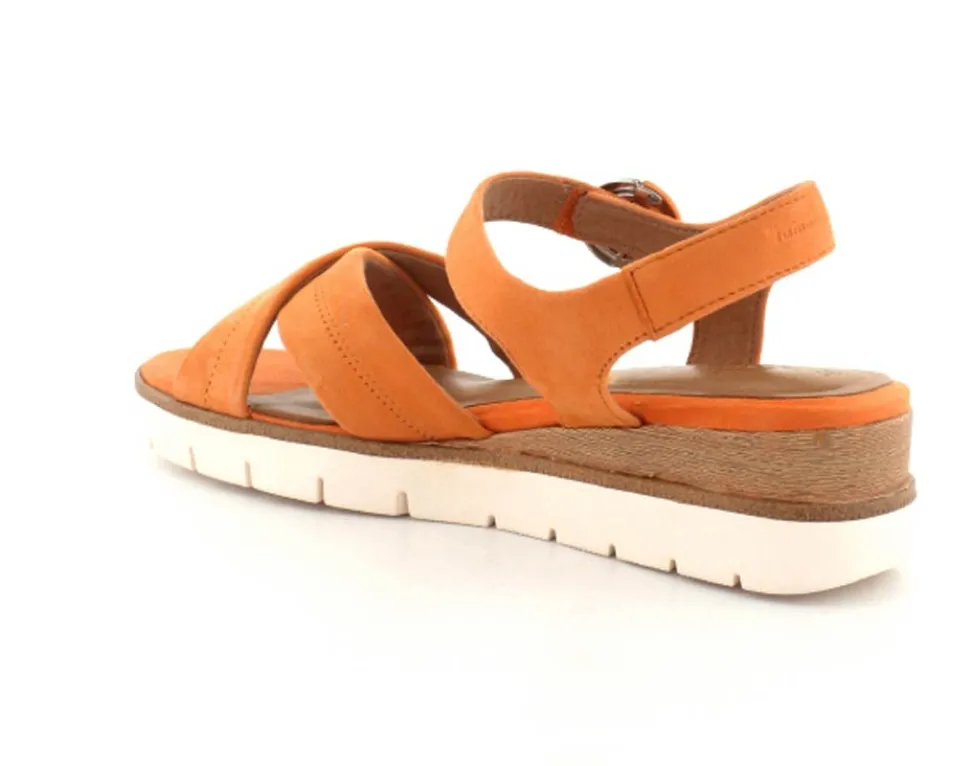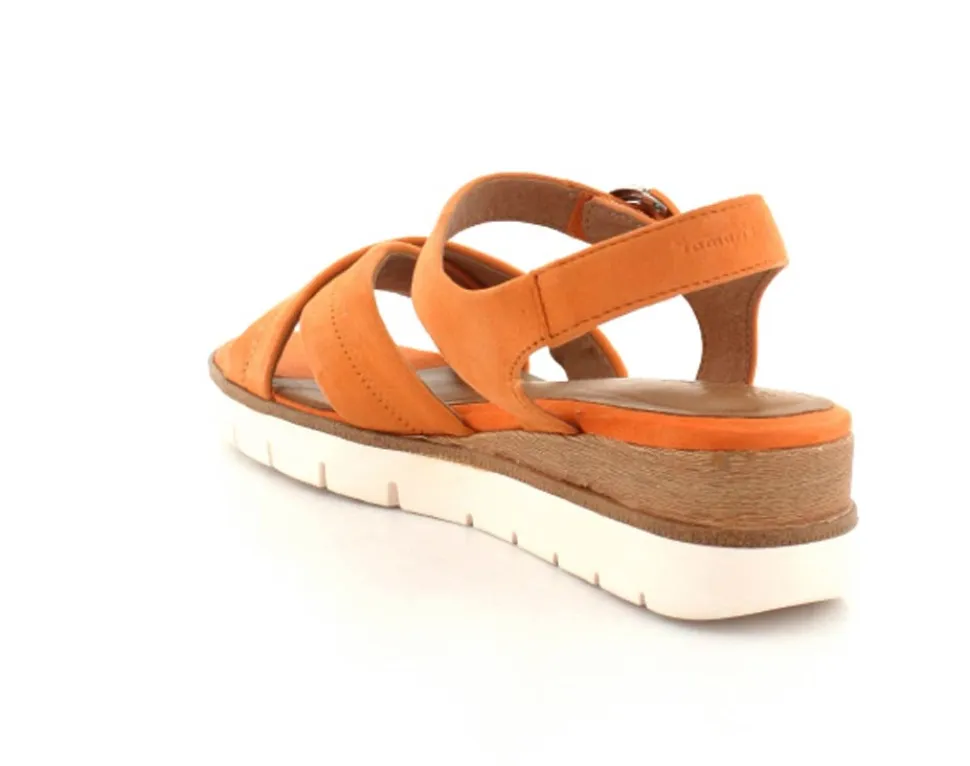 Super flot og lækker blød ruskinds sandal fra Tamaris. Sandalen er i en flot orange farve med ankelrem og krydsremme ved forfoden. Der er god plads i bredden og dejlige bløde såler indeni. Nem lille kilehæl at gå på.