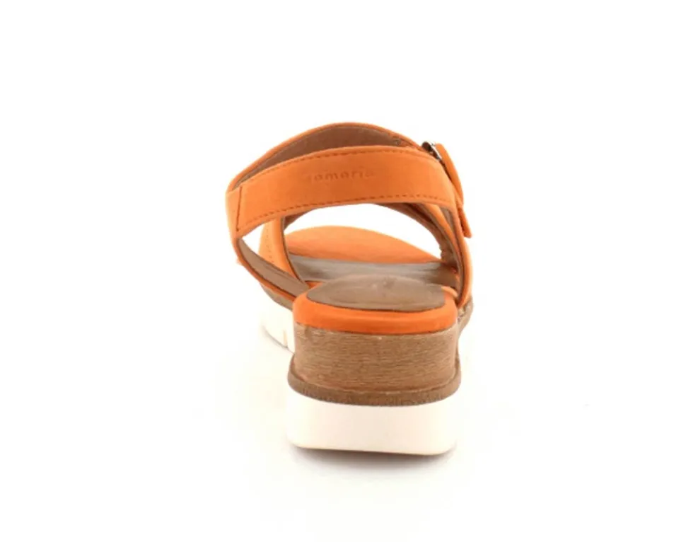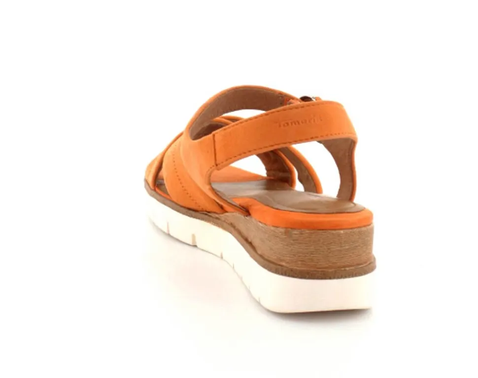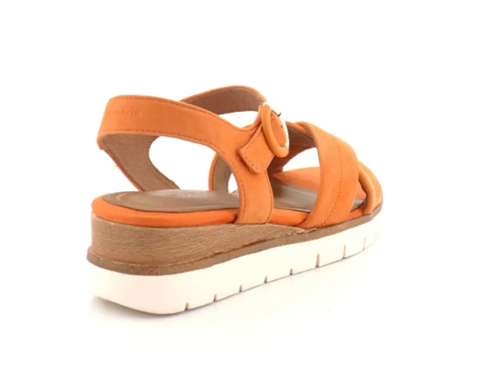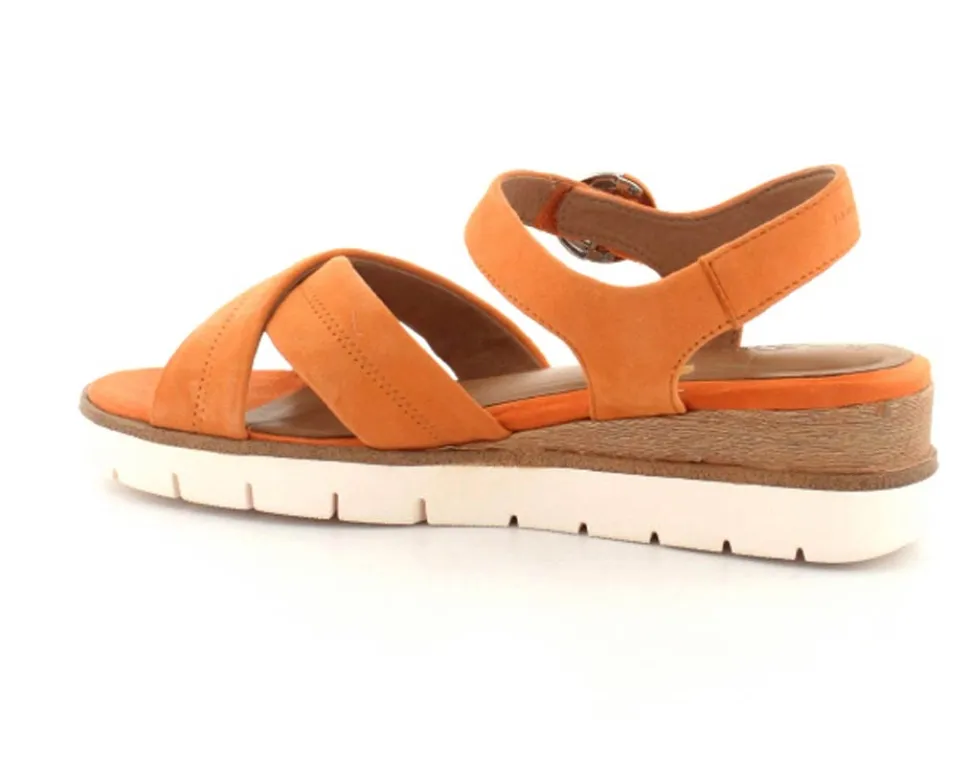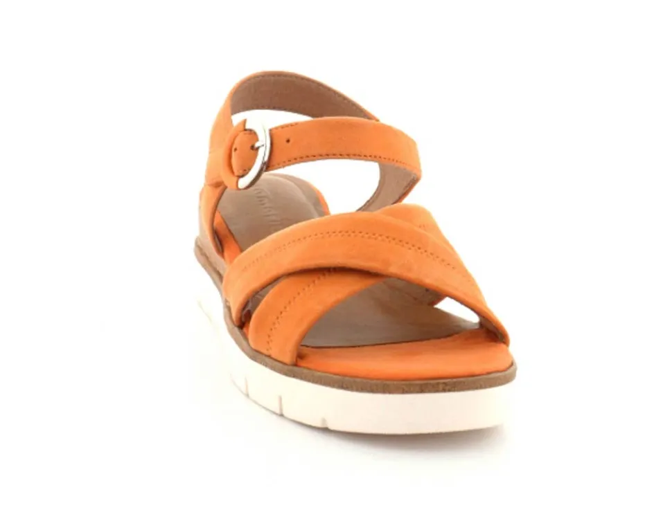 Super flot og lækker blød ruskinds sandal fra Tamaris. Sandalen er i en flot orange farve med ankelrem og krydsremme ved forfoden. Der er god plads i bredden og dejlige bløde såler indeni. Nem lille kilehæl at gå på.