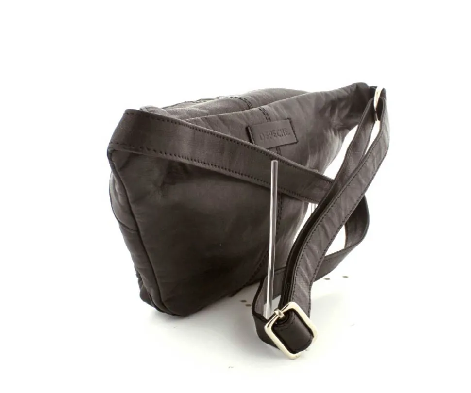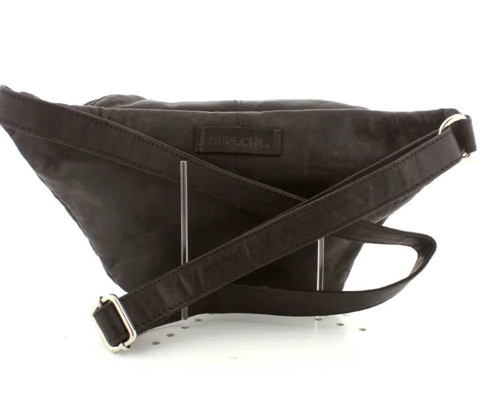 Klassisk bumbag i sort lækkert skind fra Depeche. Tasken har en god størrelse og er lækker blød i skindet. Flot detalje med sølvlynlåsene. Der er en stor lynlåslomme på fronten og tasken åbnes i toppen med lynlås. Indeni er der et stirt rum, med lynlåslomme på den ene side og lomme på den anden side. Tasken fra Depeche har en lang regulerbar skulderrem, så den også kan bruges som crossover.