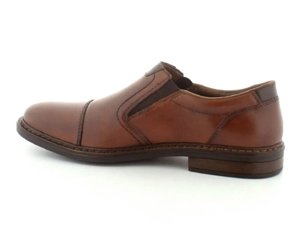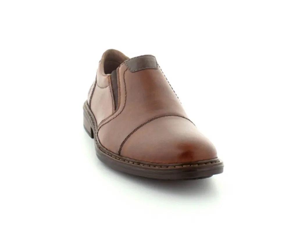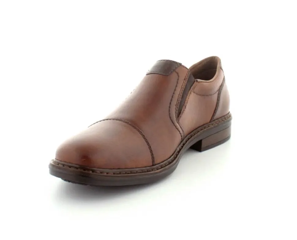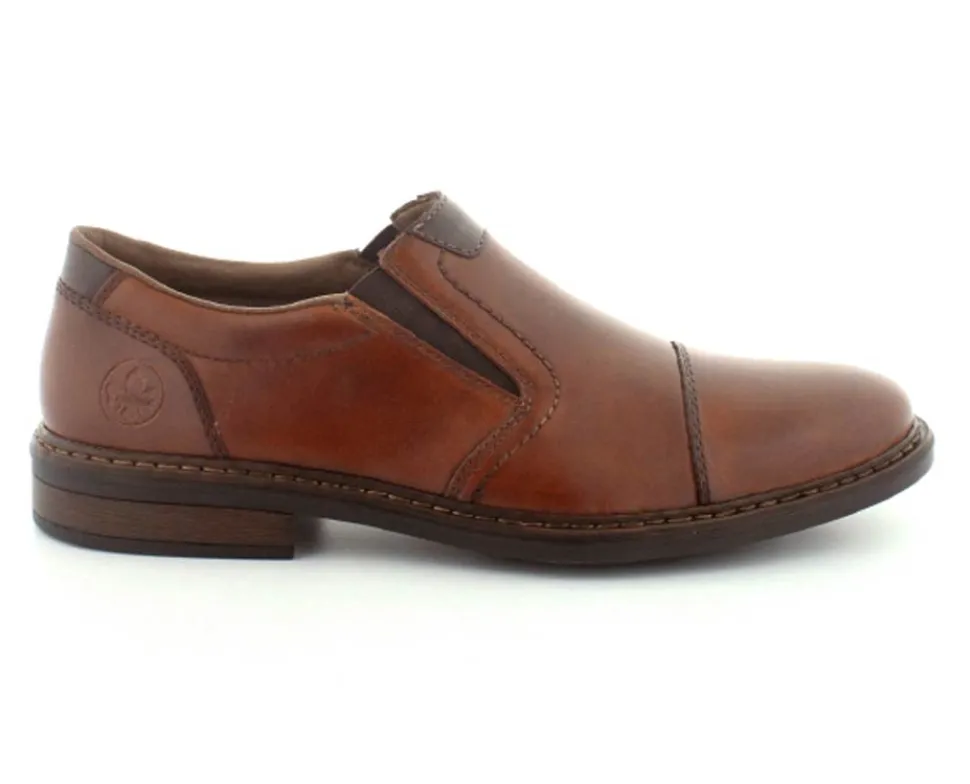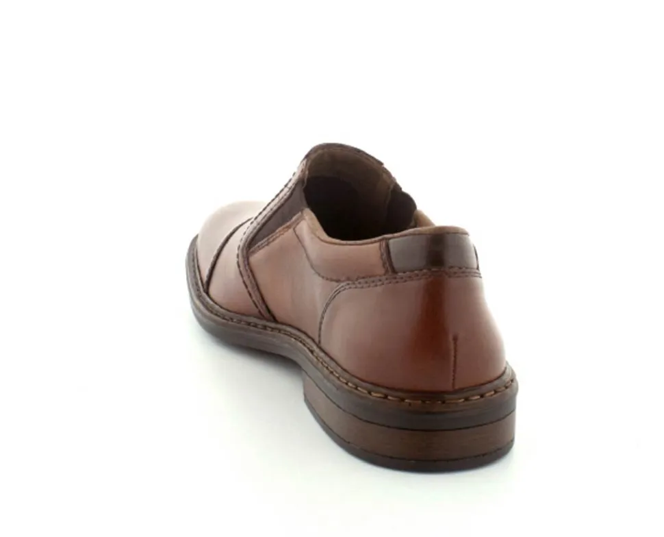 Flot og klassisk moccasin sko fra Rieker i cognacfarvet glat skind. Skoen er lige til at smutte i med elasik på begge sider af vristen. Skoen fra Rieker har lette, bløde og fleksible såler under hele bunden. Bløde skinddækssåler indeni. Skoen er med ekstra vidde.