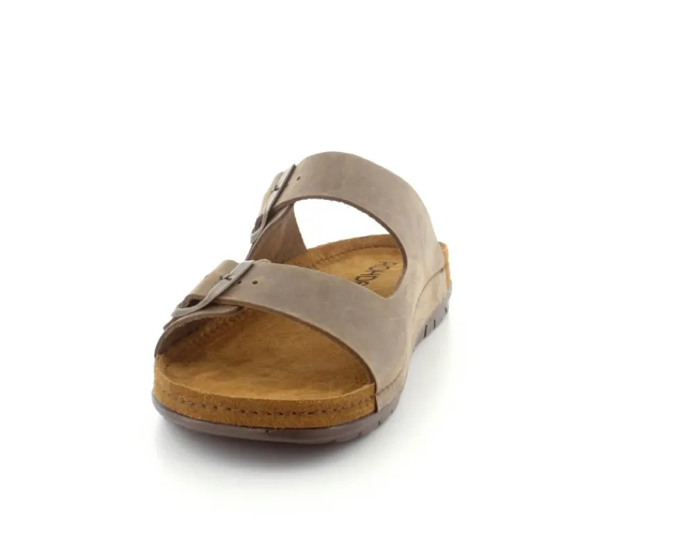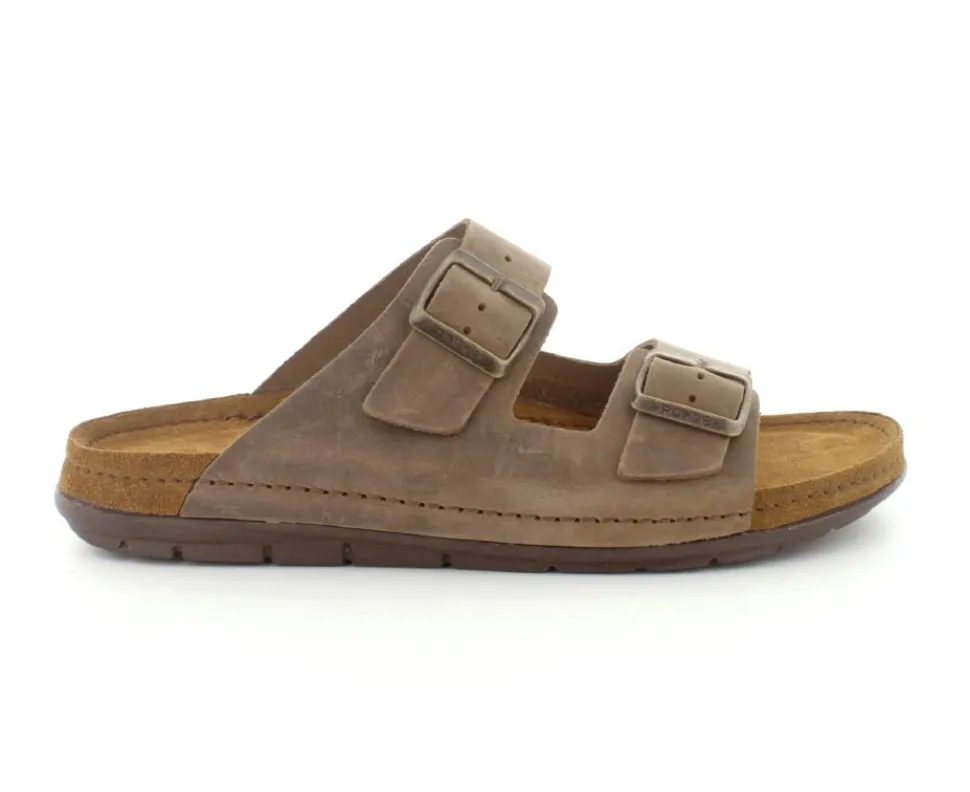 Lækker blød sandal slippers fra Rohde i oilieret brunt skind. Sandalen kan reguleres på de to remme med spænder. Den er med svangstøtte og ruskind i bunden. Stødabsoberende og lette såler under hele bunden.