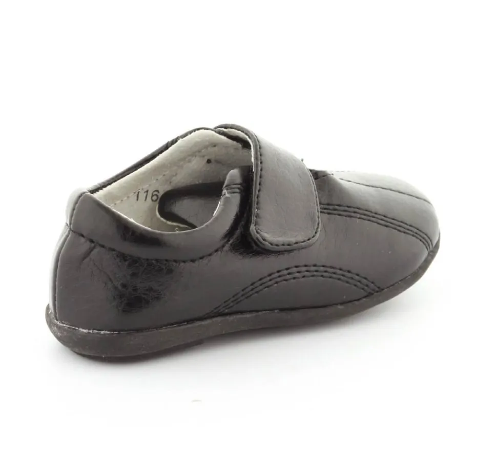 Smart drengesko fra Kennedy. Skoen er lavet i et sort blødt materiale og der er skind indvendigt i skoen. Skoen har en regulerbar velcrorem og bløde fleksible gummisåler. Skoen fra Kennedy vil egne sig godt som en hjemmesko eller en fin sko til fest.