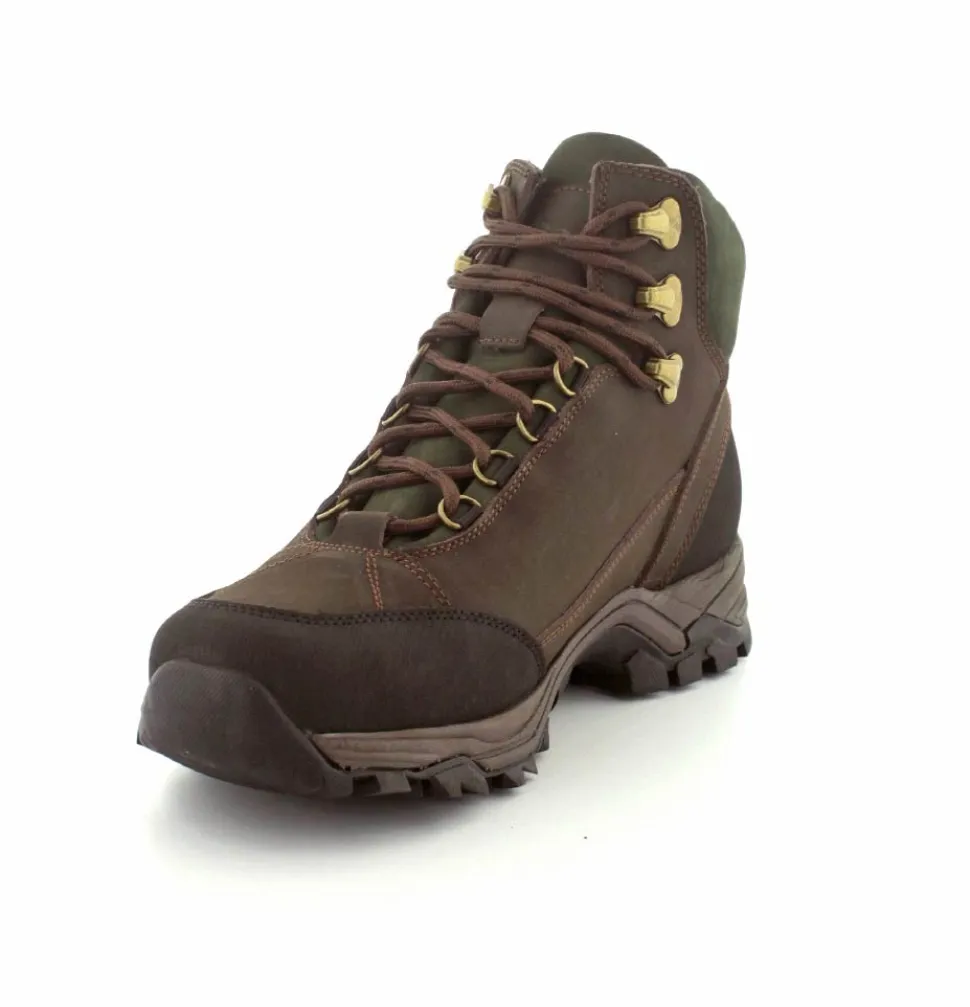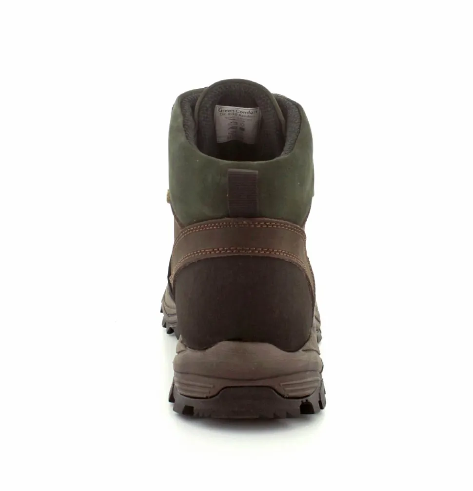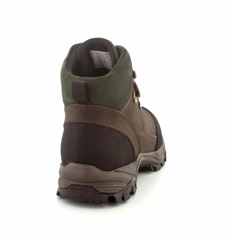 Super god vandrestøvle fra Green Comfort model North Outdoor. Støvlen er en snørestøvle i farven mørkebrun og mørk grøn. Den er lavet i skind og er med Tex-membran, så den også er vandtæt. Den aftagelig indlægssål er med ekstra svangstøtte. Gode solide gummisåler under hele bunden med god profil.