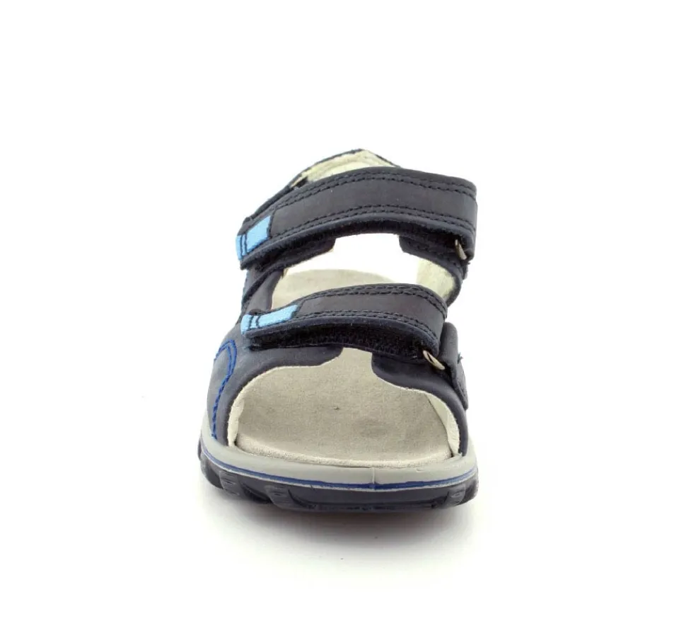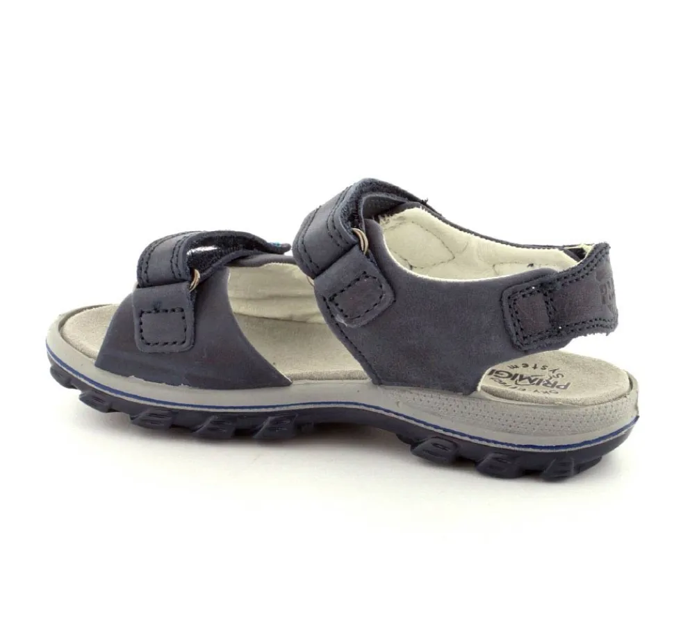 Rigtig lækker skindsandal fra Primigi i mørkeblåt nubuck skind. Sandalen er lavet på en smallere læst, så den passer bedst til en smal og normal fod. Der er blødt skindfoer indeni og tre regulerbare velcroremme, så den kan tilpasses foden. Sandalen fra Primigi har bløde, lette, fleksible og stødabsoberende såler under hele bunden. Husk den er meget lille i størrelsen, så her skal man tage nummeret større end normalt.