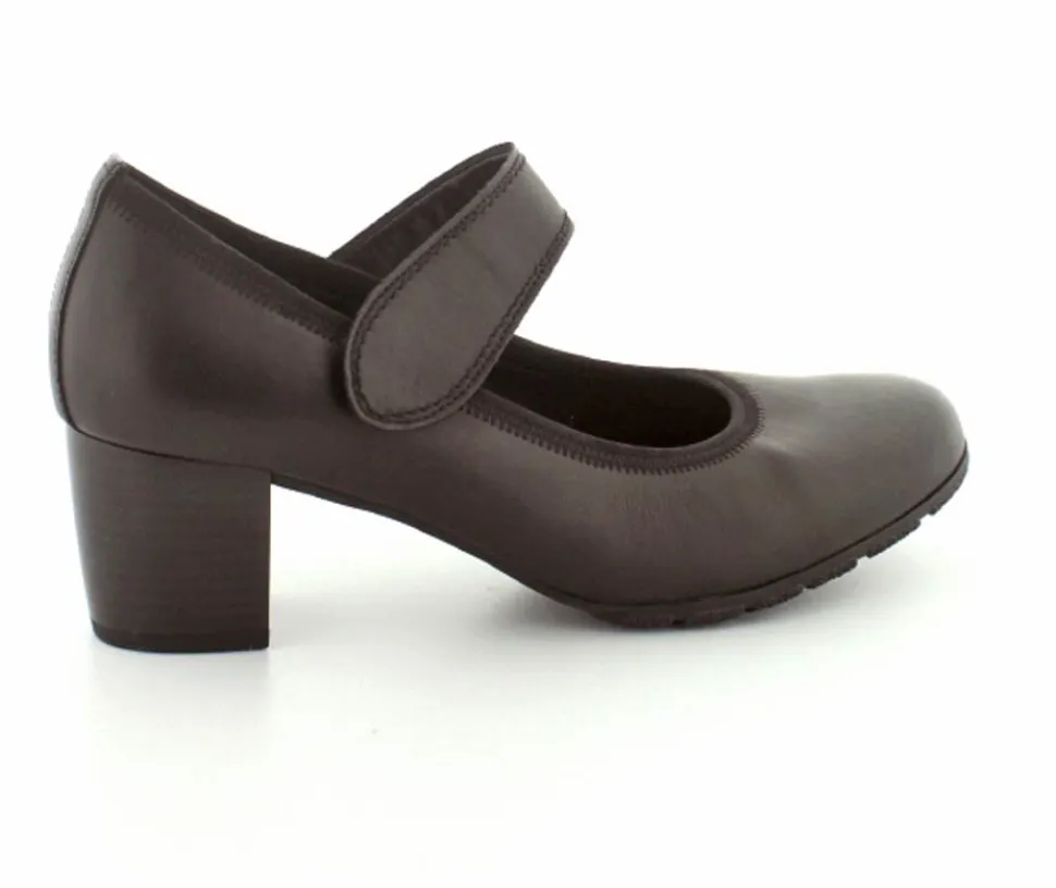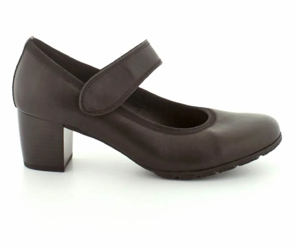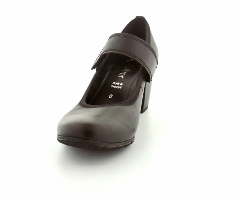 Flot og klassisk skind pump fra Gabor i Sort med ankelrem. Remmen justeres med velcro og giver et rigtig godt hold på foden. Der er bløde gummisåler under forfoden, så den er blød at gå i. Nem lille hæl at gå på.
