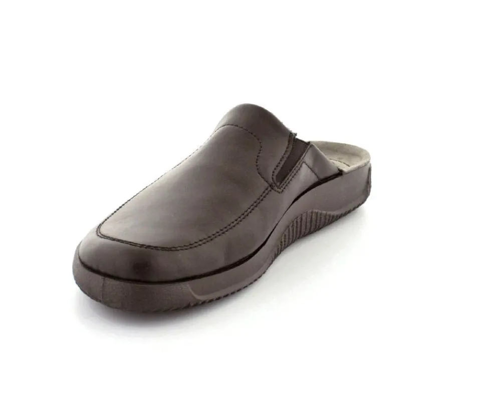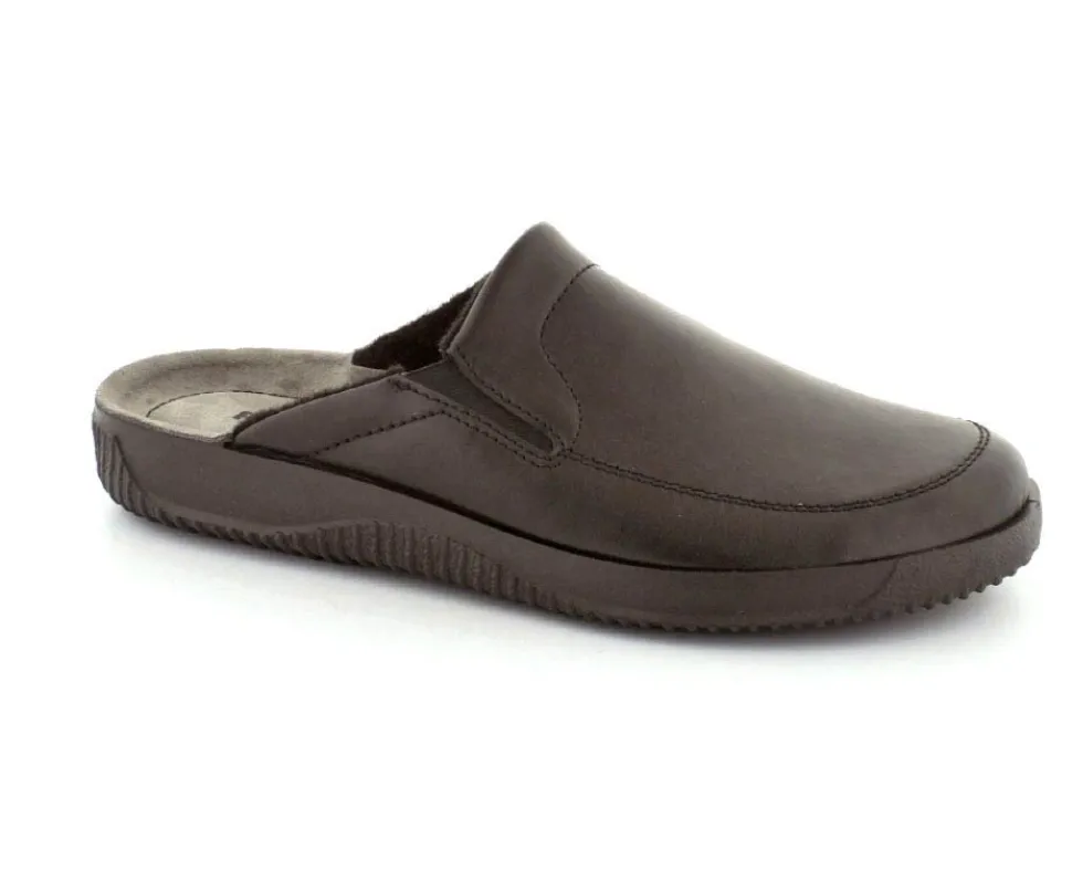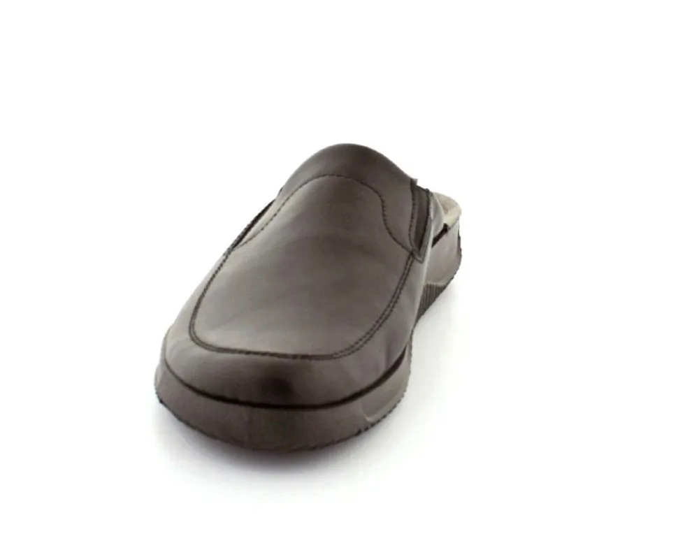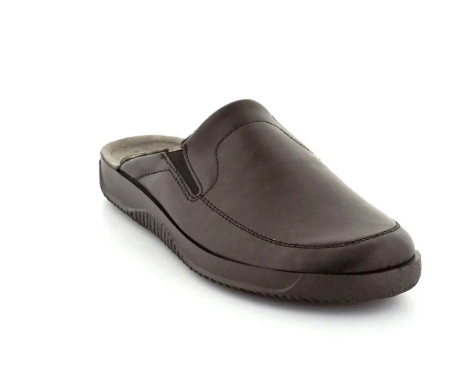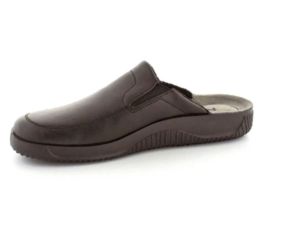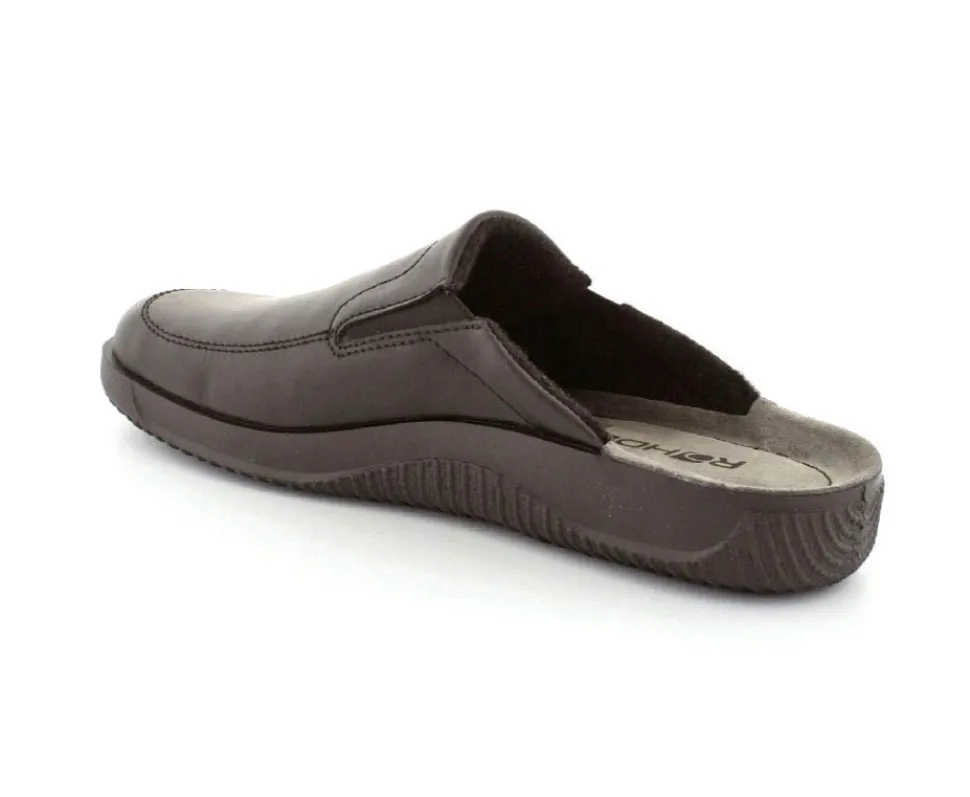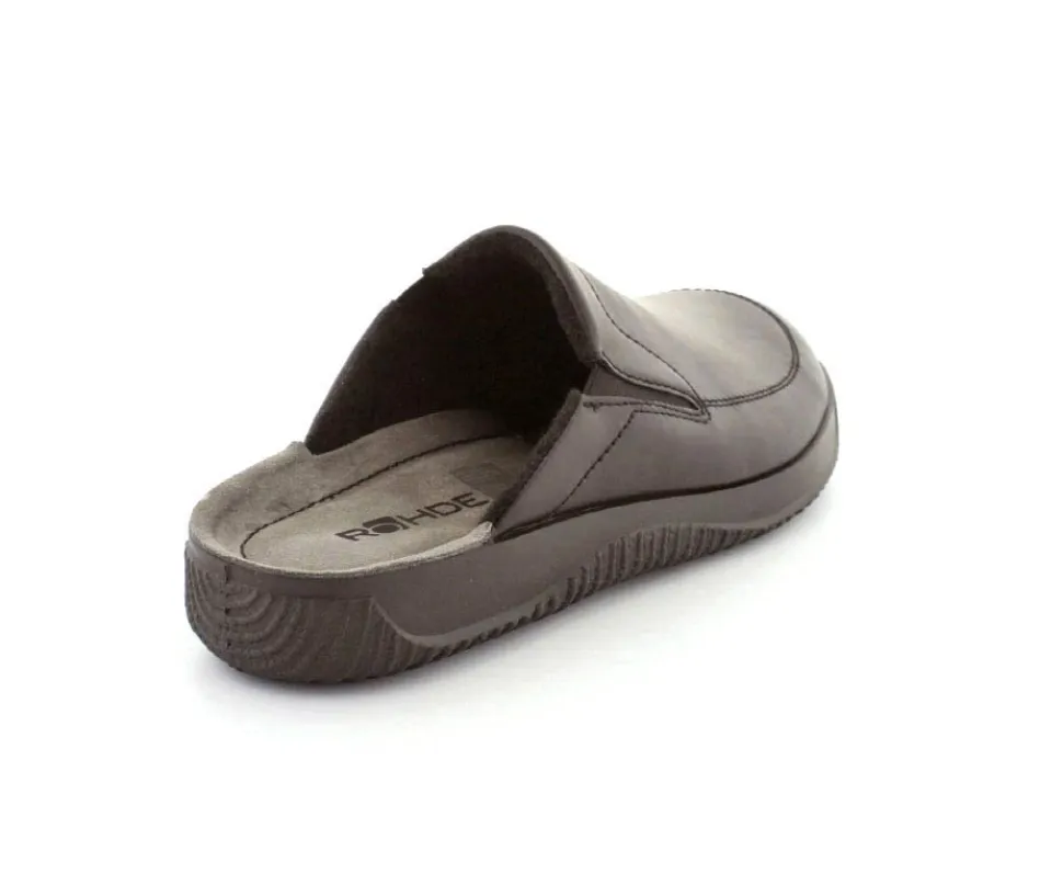 Rigtig god hjemmesko fra Rohde i sort skind. Modellen er en slippers model, så den er lige til at smutte i. Den rummer godt i bredden og har elastik på begge sider af vristen, så den kan give sig efter behov. Hjemmeskoen fra Rohde er varmt foeret indeni og har ruskindssåler i bunden. Blød og lækker at gå på. Der er gode solide gummisåler under hele bunden.