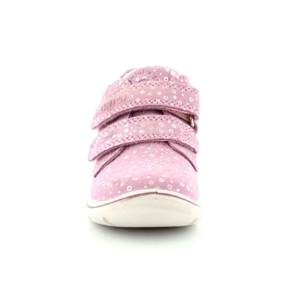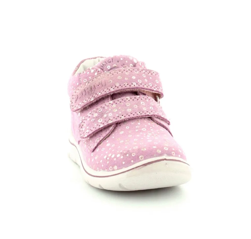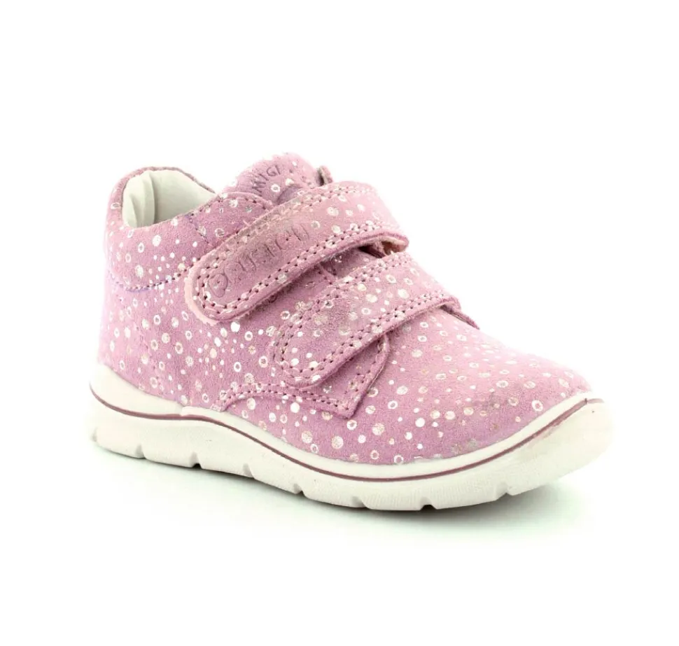 Super gode prewalkers fra Primigi i rosafarvet ruskind med glimmer på. Skoen har et godt hold på foden, med god støtte om anklen. Den er nem at komme i med to regulerbare velcroremme. God plads i bredden og kan nemt strammes til. Der er skindfoer indeni og bløde, fleksible såler under hele bunden. Lidt til den store side.