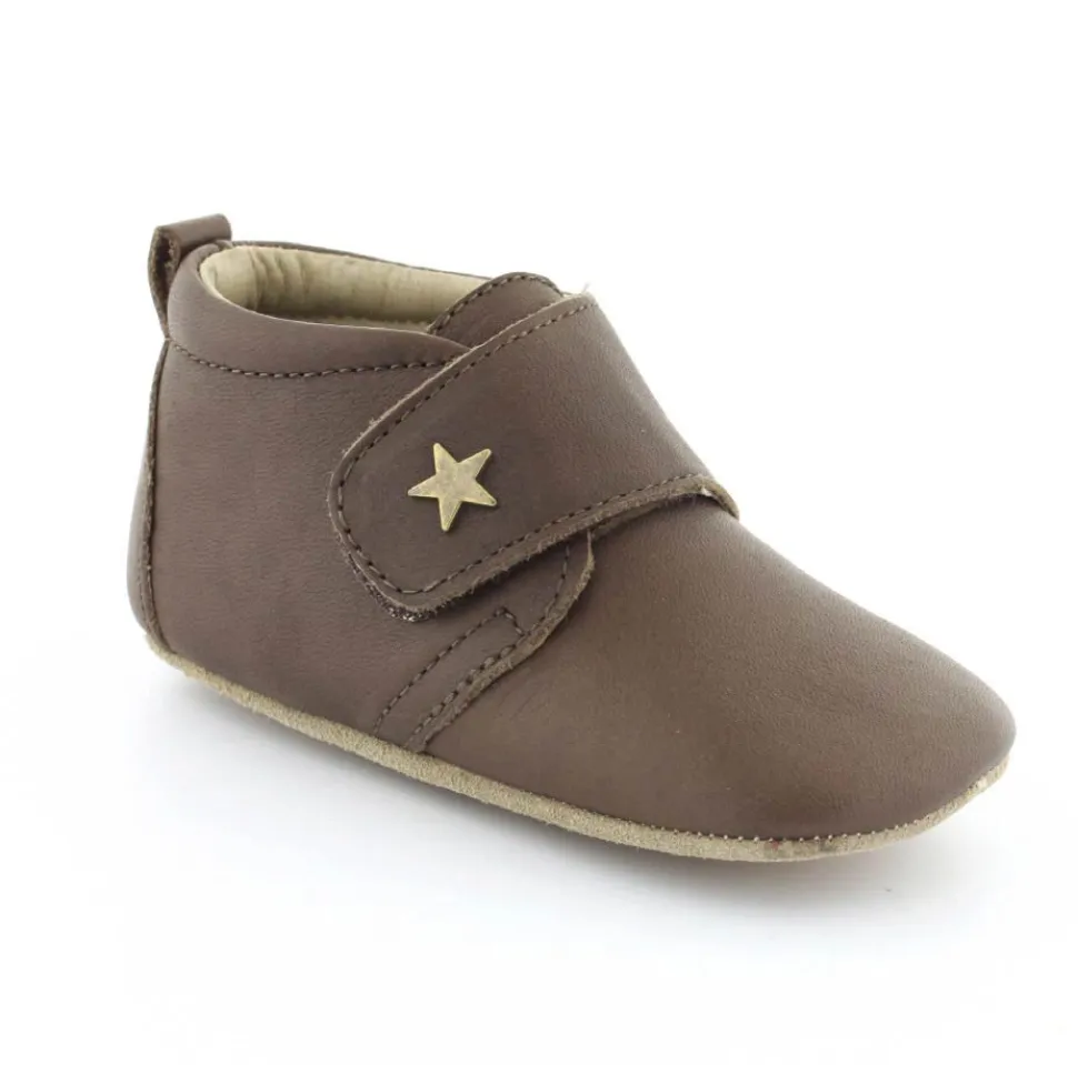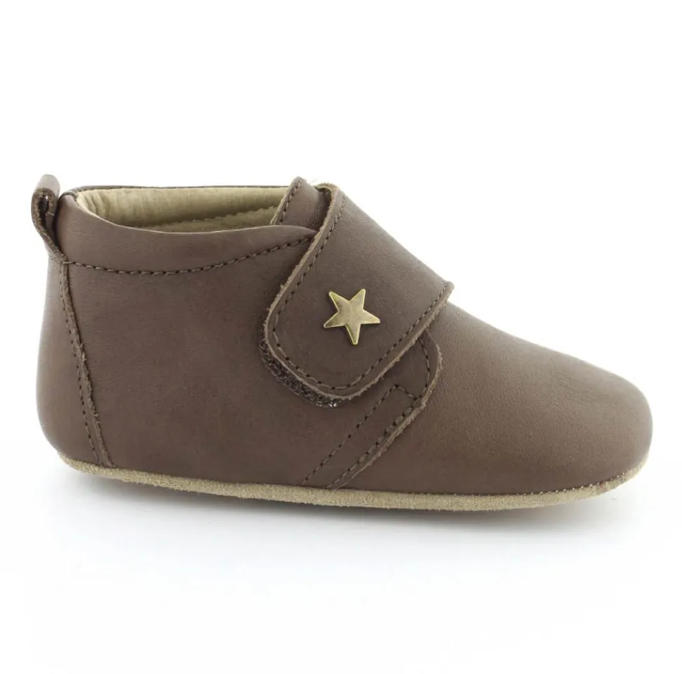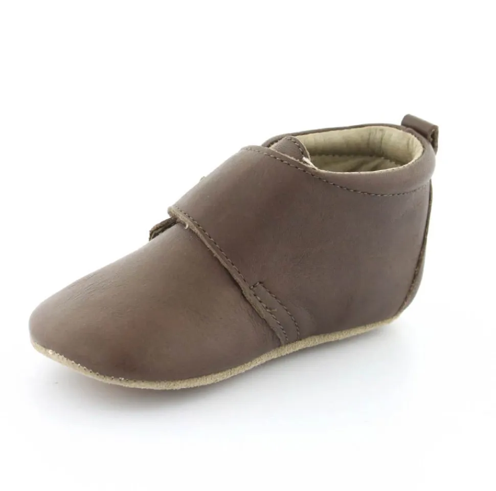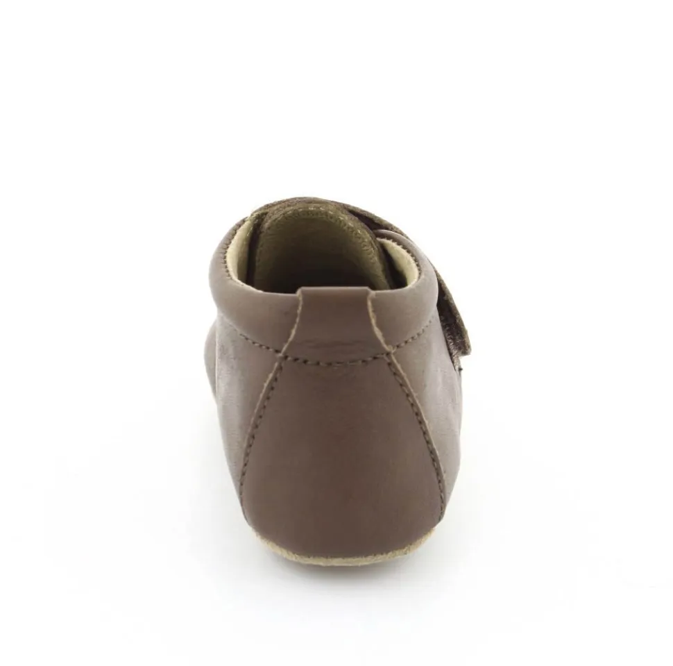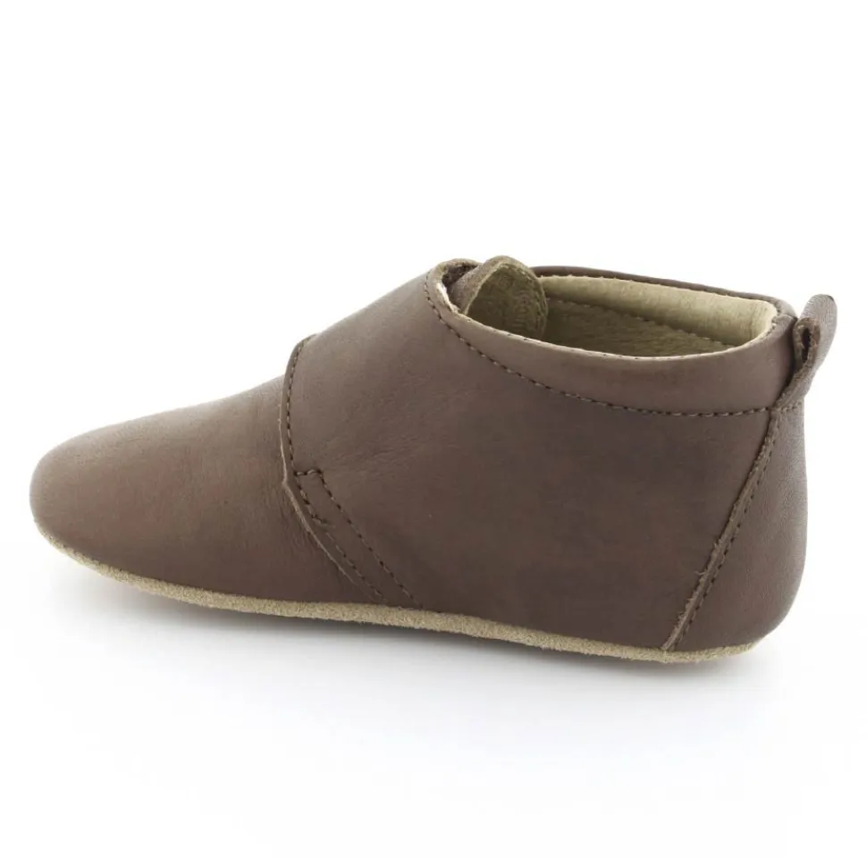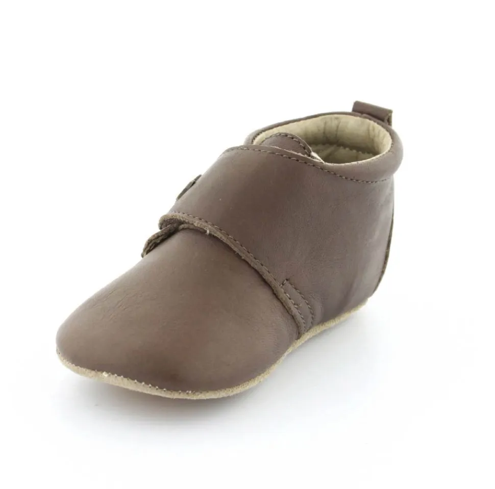 Super fin hjemmesko fra Bisgaard lavet i mørkebrunt skind. Skindet er kalveskind både indvendigt og udvendigt, så den er super blød og lækker. God fast hælkappe og velcro lukning ved vristen. Hjemmeskoen fra Bisgaard har ruskindsåler under bunden med to gummifelter, så barnet står bedre fast. Kan fint bruges som kravlesko.