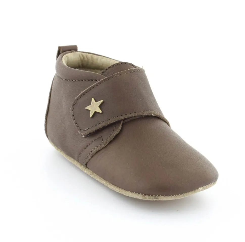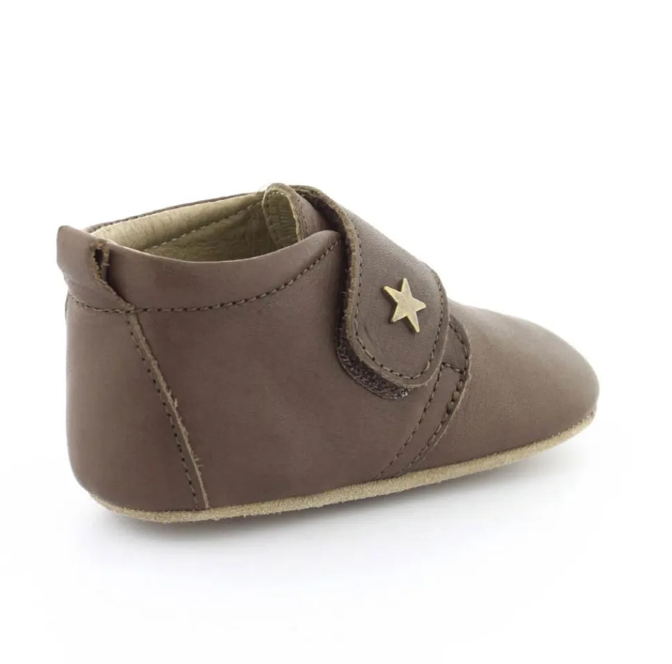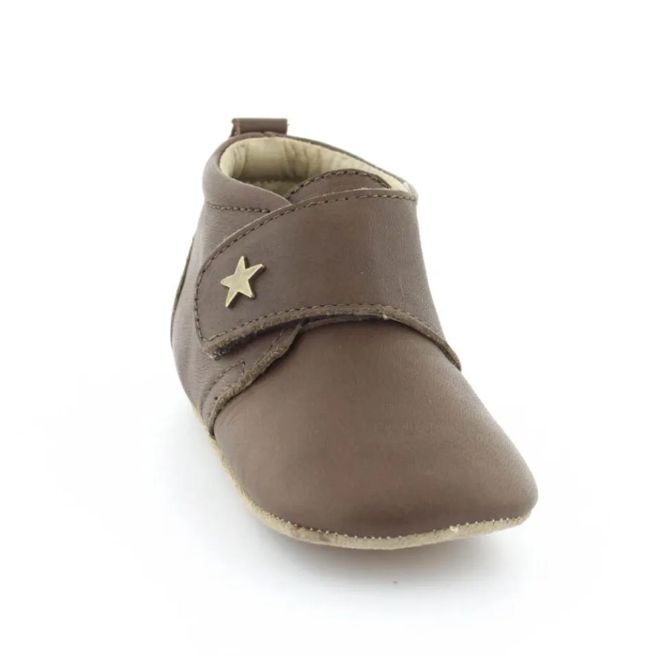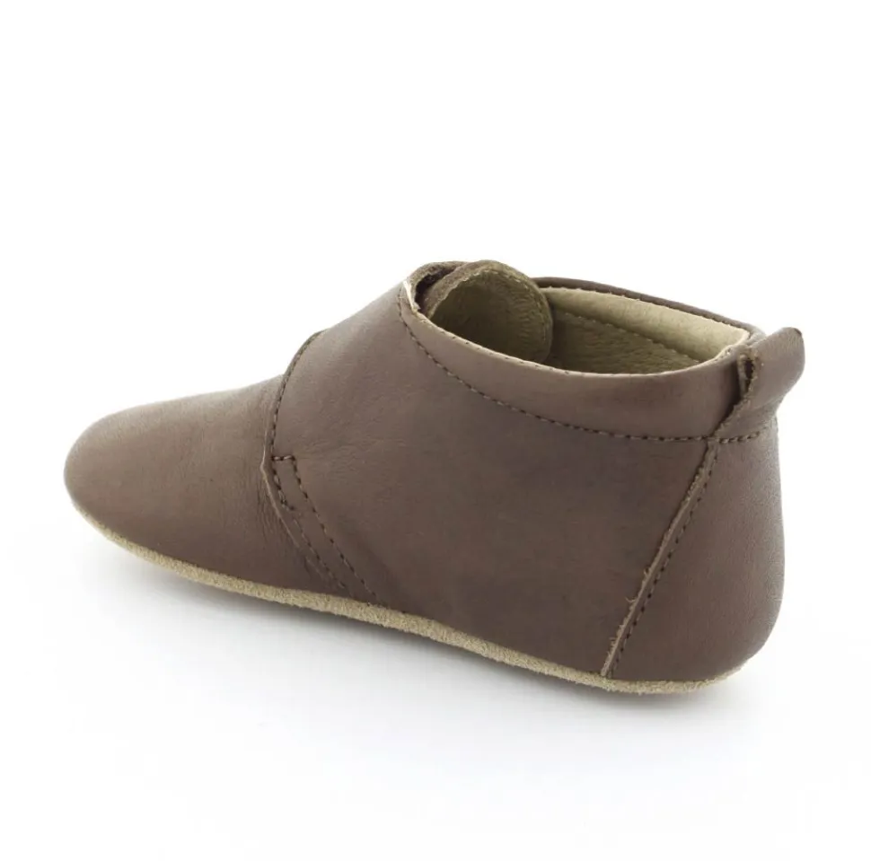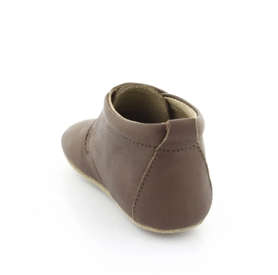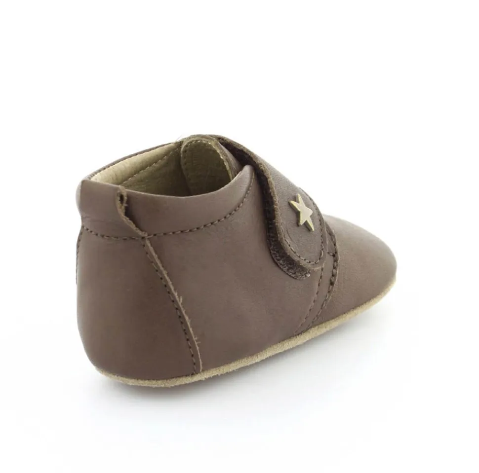 Super fin hjemmesko fra Bisgaard lavet i mørkebrunt skind. Skindet er kalveskind både indvendigt og udvendigt, så den er super blød og lækker. God fast hælkappe og velcro lukning ved vristen. Hjemmeskoen fra Bisgaard har ruskindsåler under bunden med to gummifelter, så barnet står bedre fast. Kan fint bruges som kravlesko.