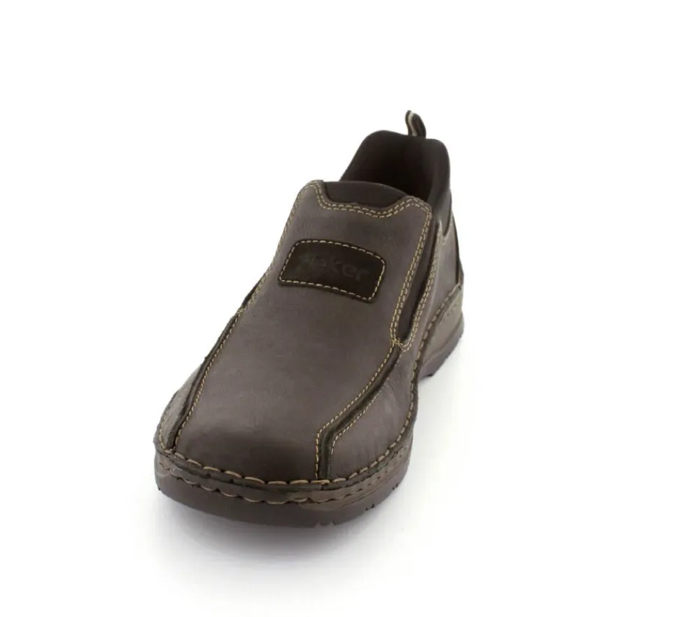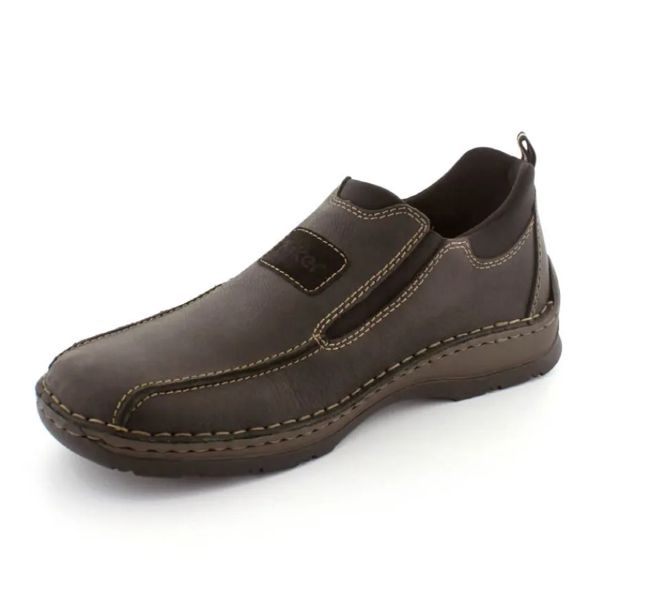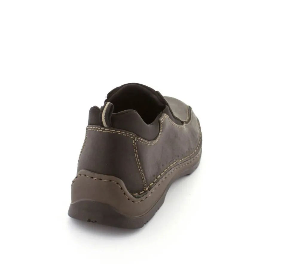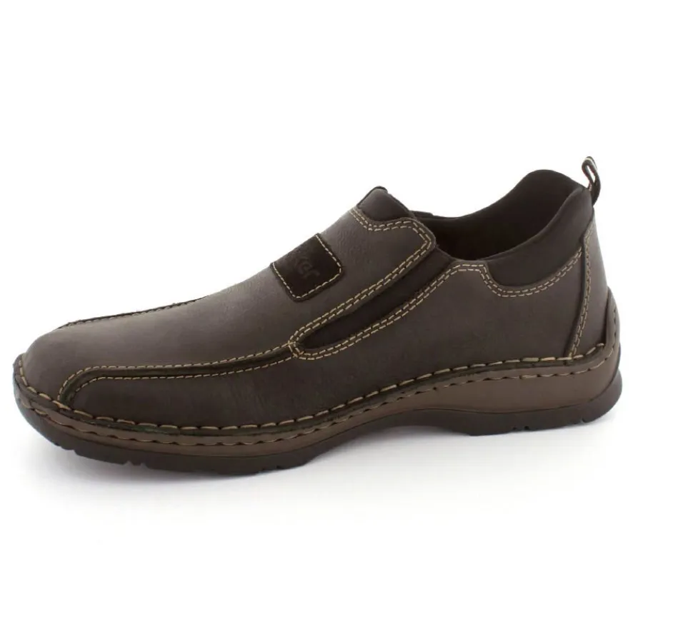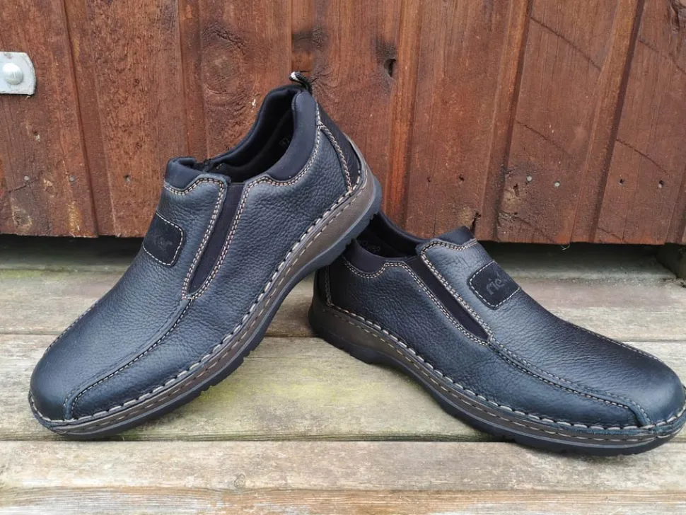 Klassiske hyttesko fra Rieker i sort oilieret skind med lyse stikninger. Skoen er lige til at smutte i, da der er elastik på begge sider af vristen. Skoen rummer godt i bredden da den er med extra vidde. Skinddækssål indeni og bløde, fleksible, og stødabsoberende såler under hele bunden.