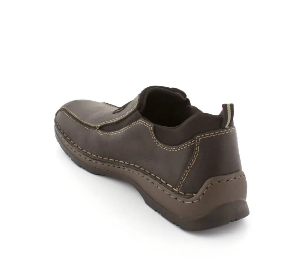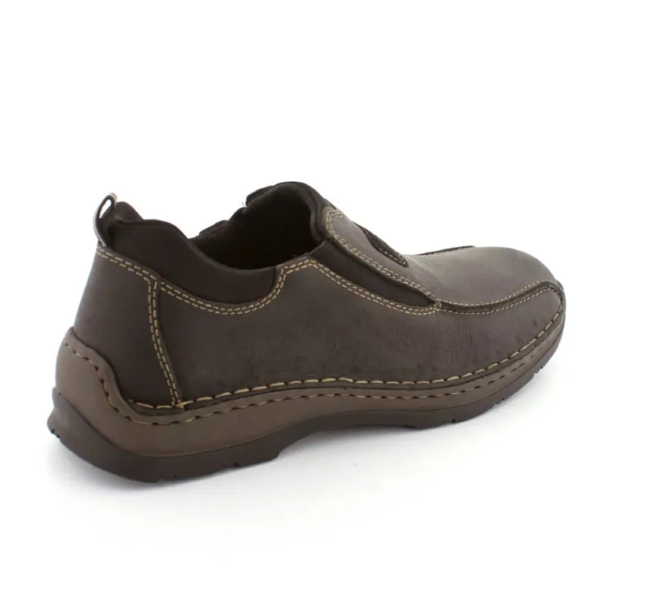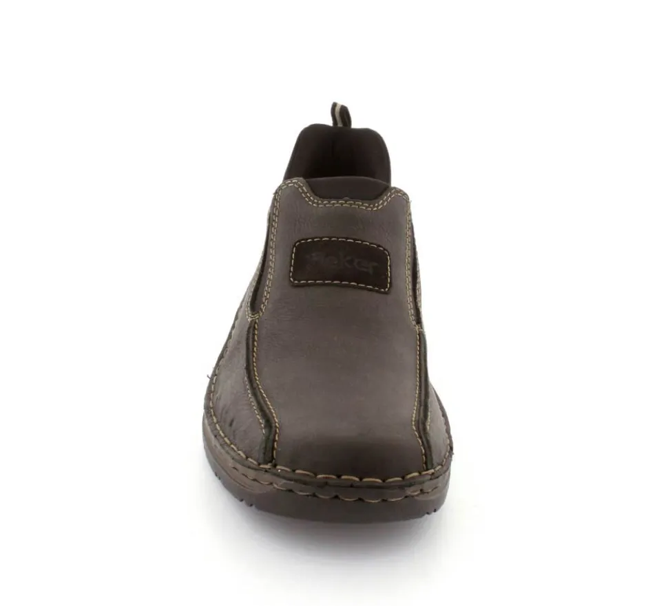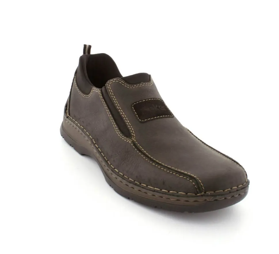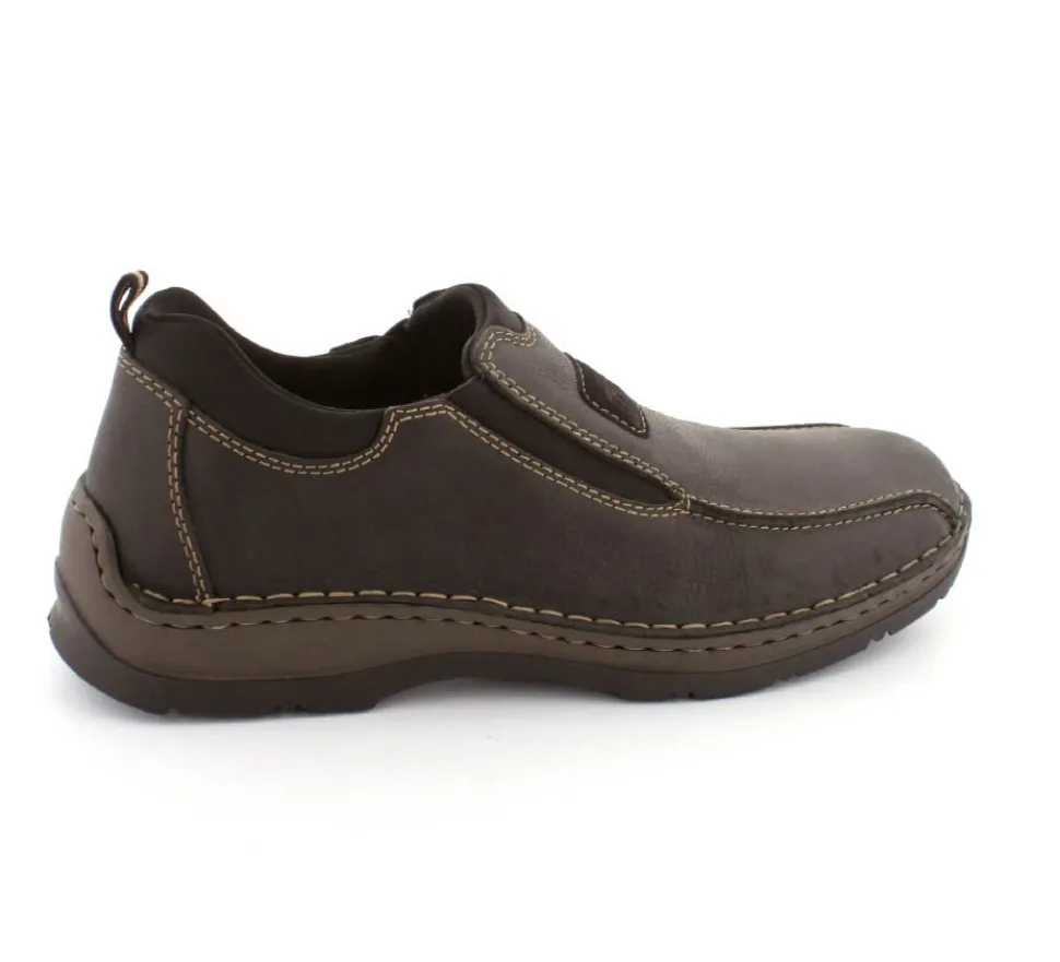 Klassiske hyttesko fra Rieker i sort oilieret skind med lyse stikninger. Skoen er lige til at smutte i, da der er elastik på begge sider af vristen. Skoen rummer godt i bredden da den er med extra vidde. Skinddækssål indeni og bløde, fleksible, og stødabsoberende såler under hele bunden.