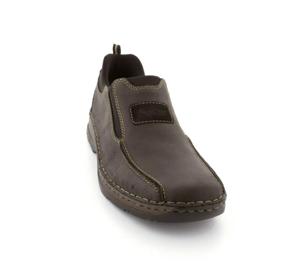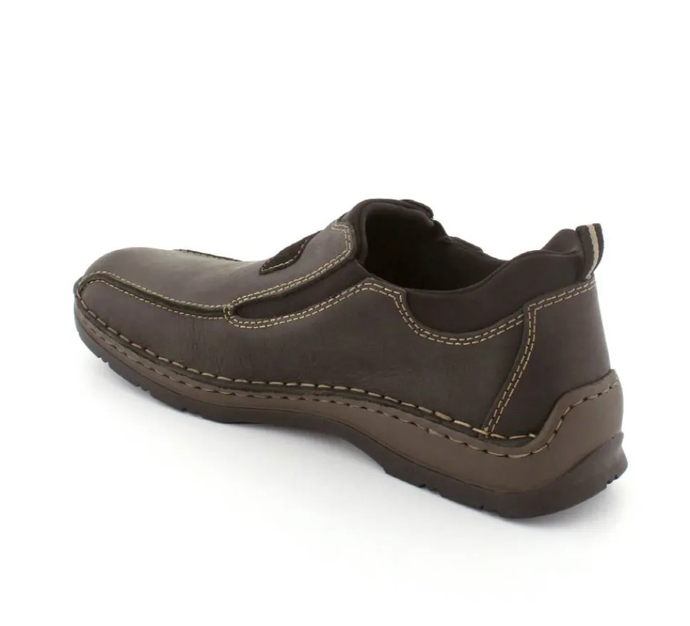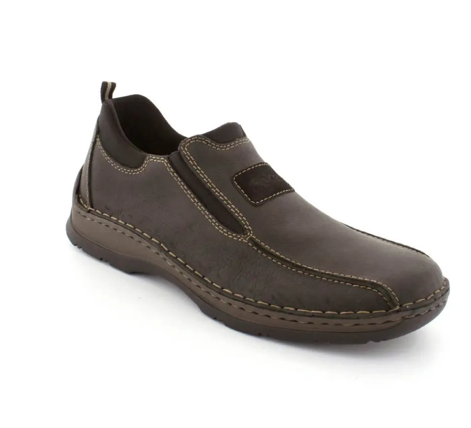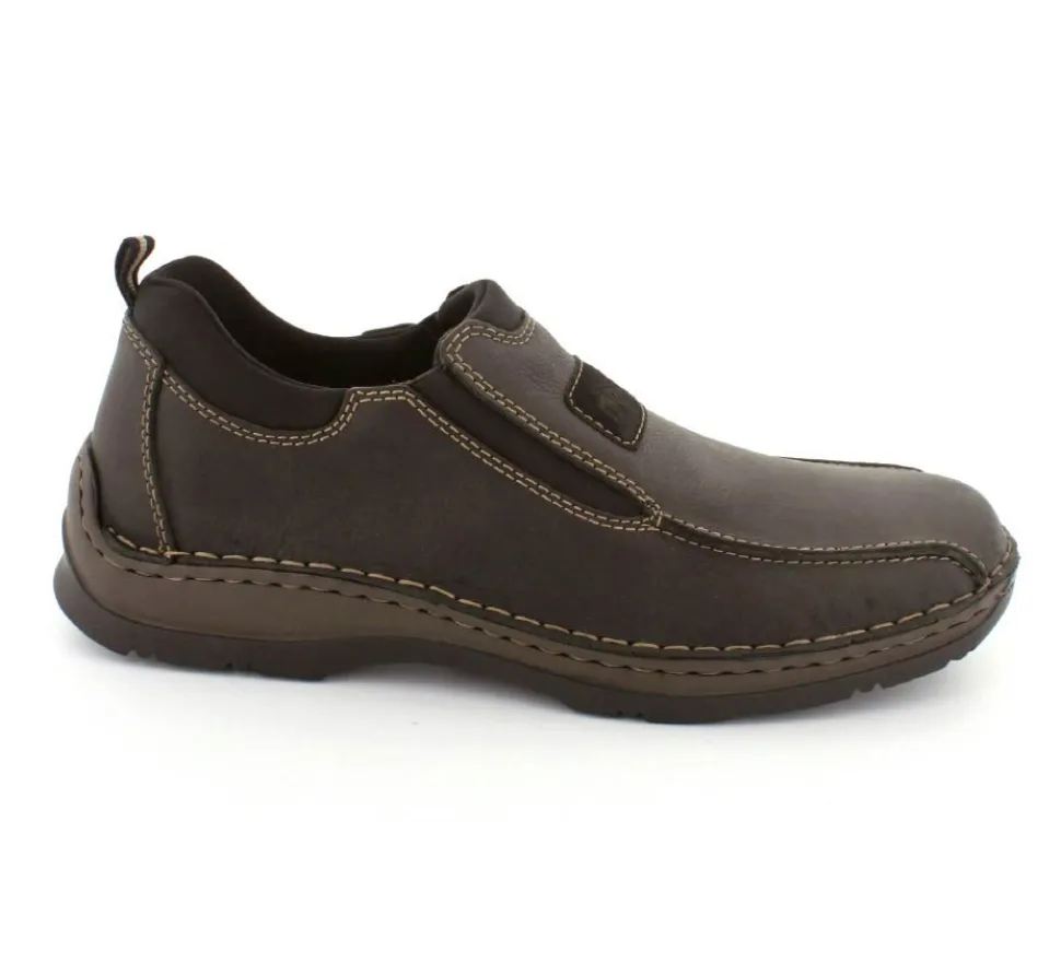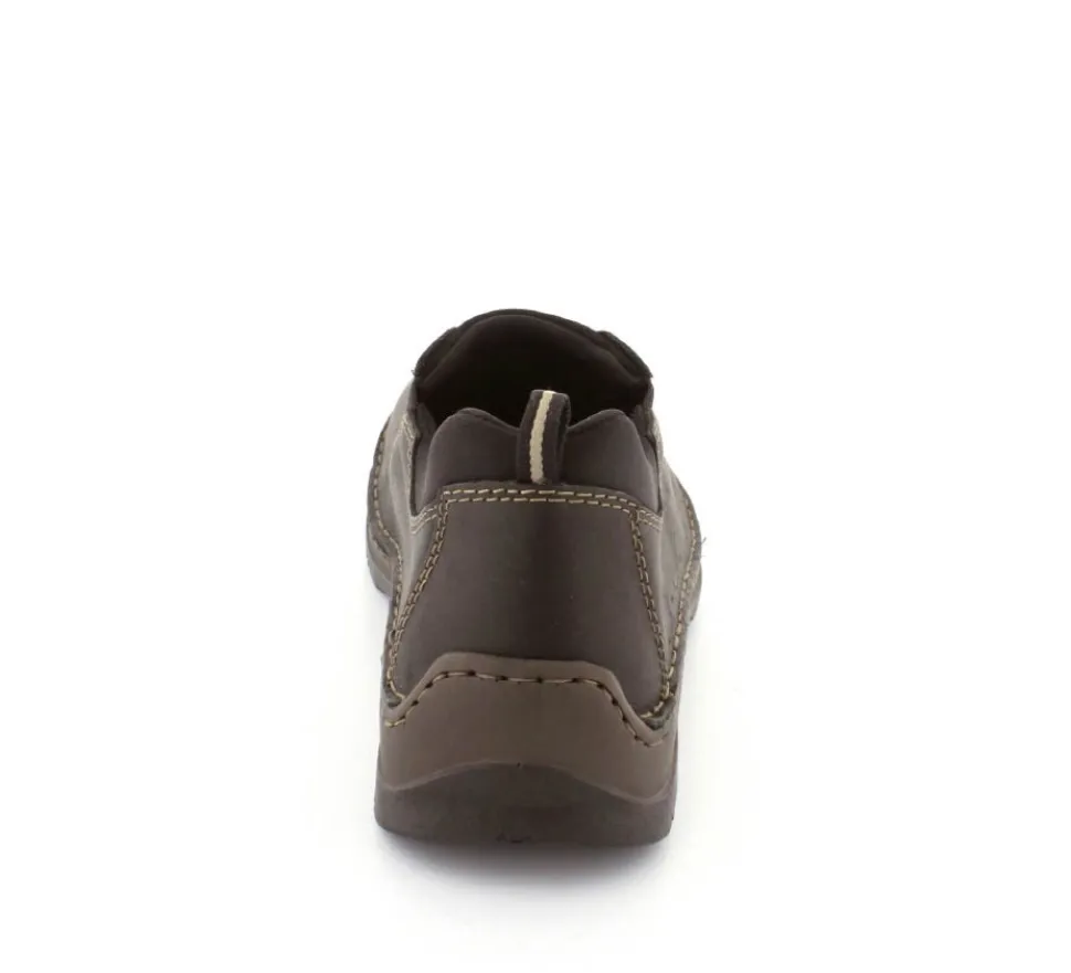 Klassiske hyttesko fra Rieker i sort oilieret skind med lyse stikninger. Skoen er lige til at smutte i, da der er elastik på begge sider af vristen. Skoen rummer godt i bredden da den er med extra vidde. Skinddækssål indeni og bløde, fleksible, og stødabsoberende såler under hele bunden.