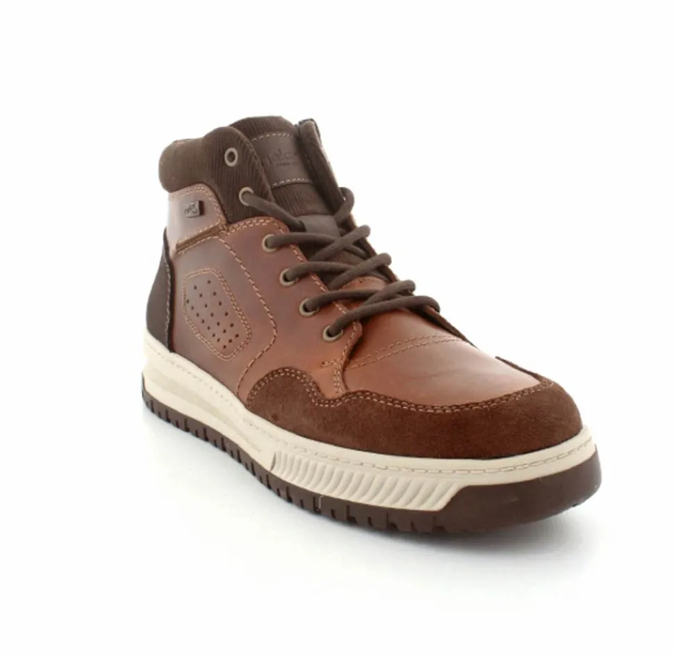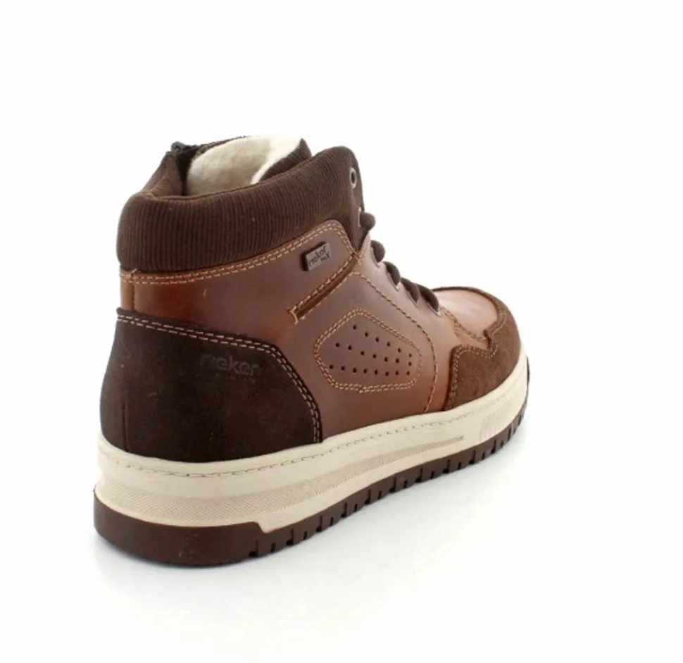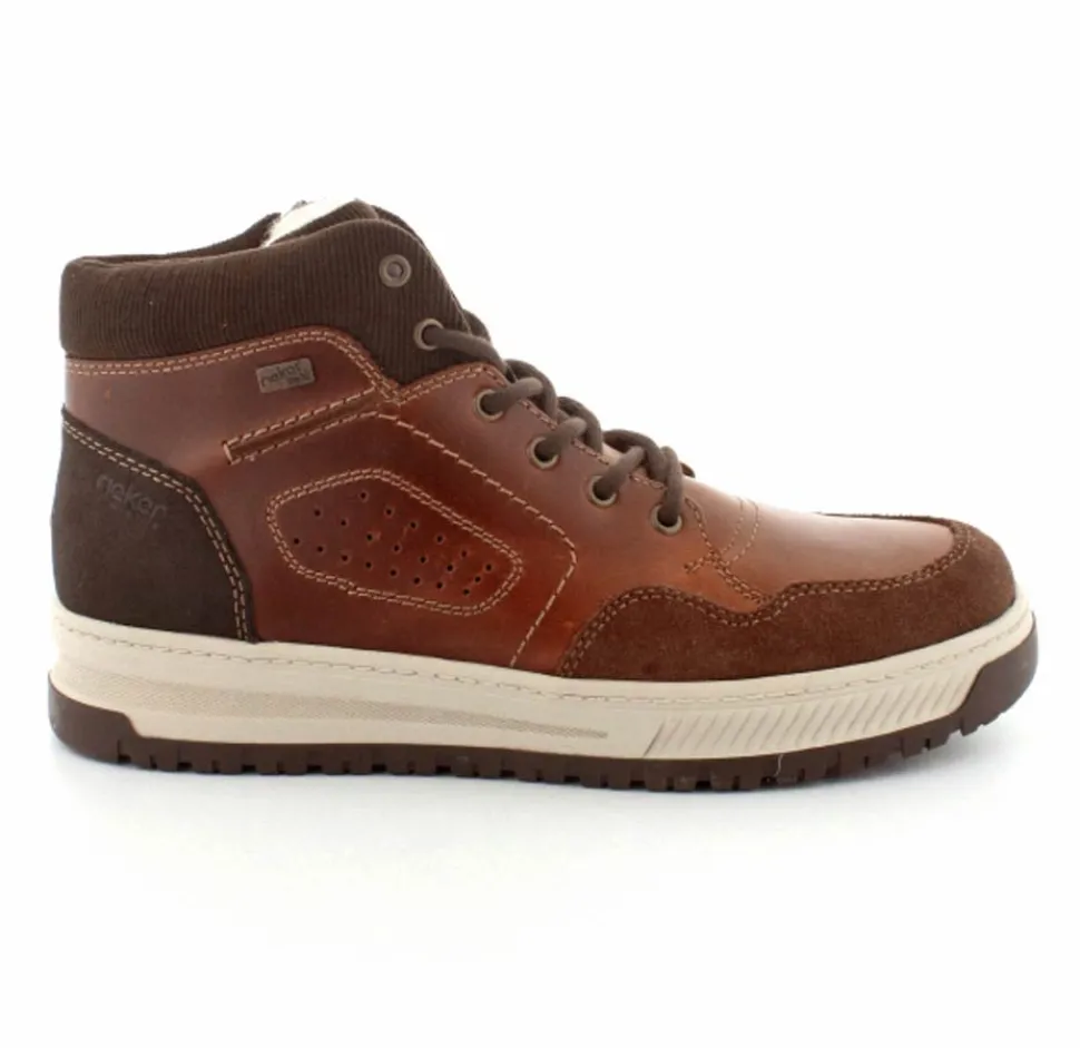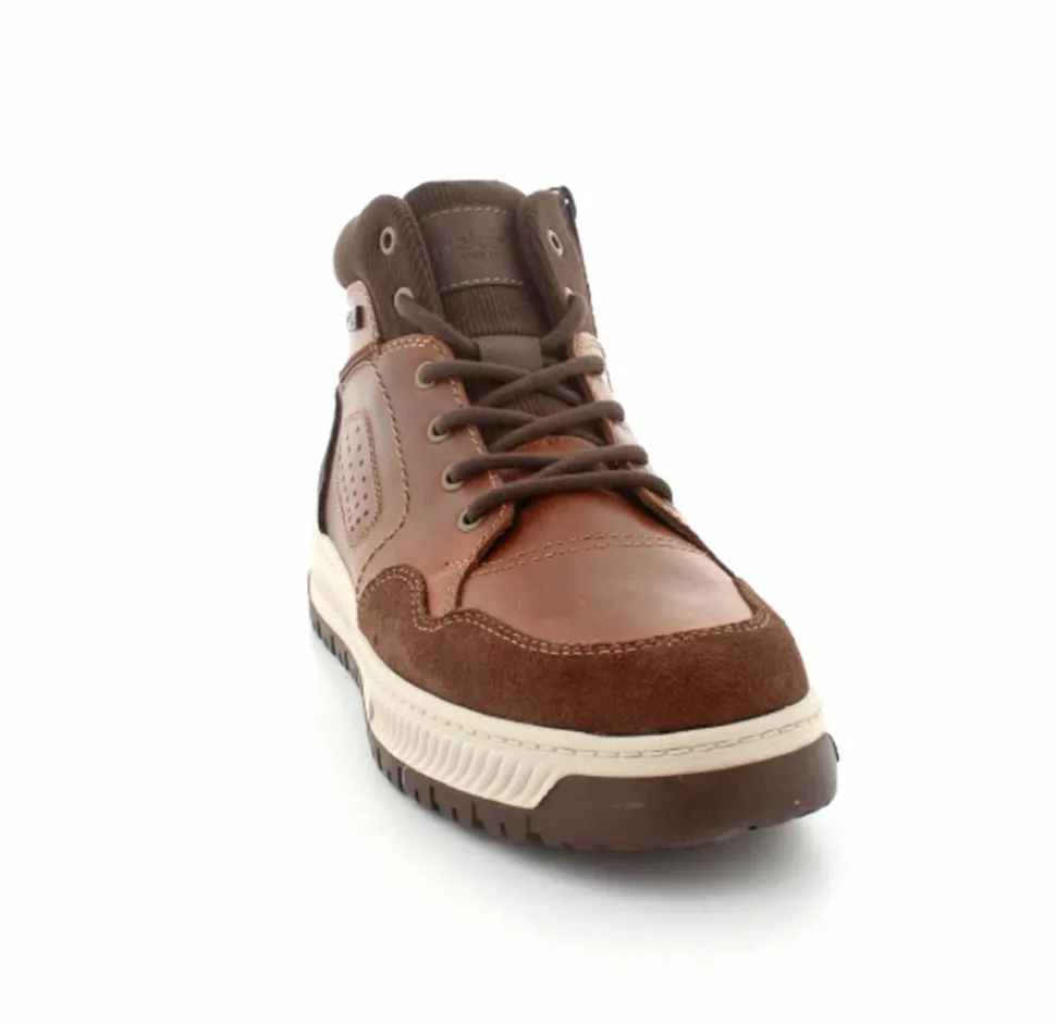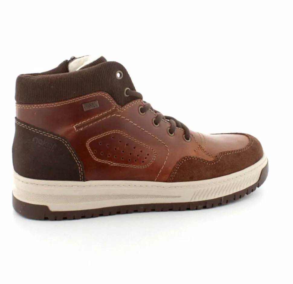 Super smarte vinterstøvle fra Rieker med bet sporty look. Støvlen er lavet i cognacfarvet skind med lyse gummisåler. Der er både snørebånd og lynlås, så den er nem at komme i. Uldfoer indeni og Rieker-Tex membran, så den kan klare sne og kulde.