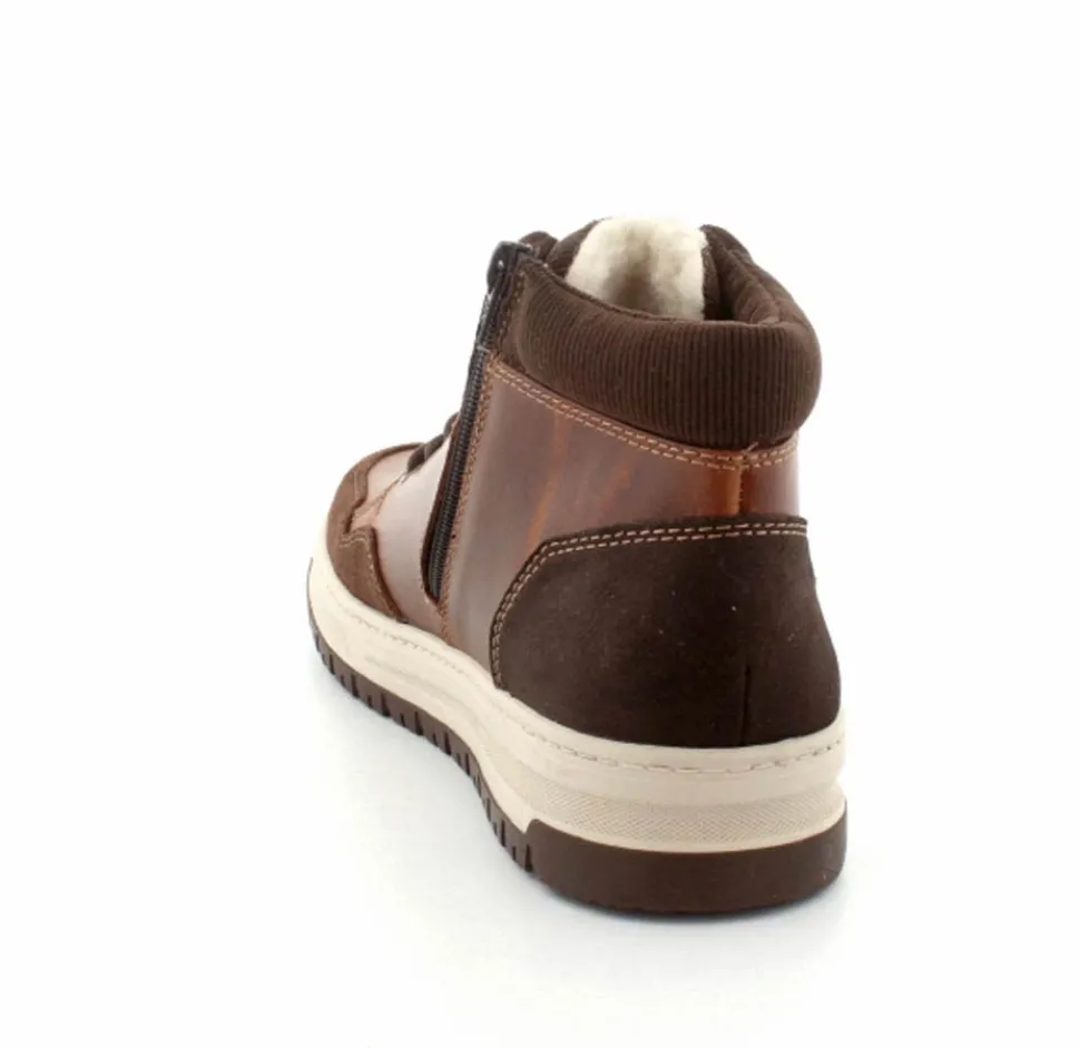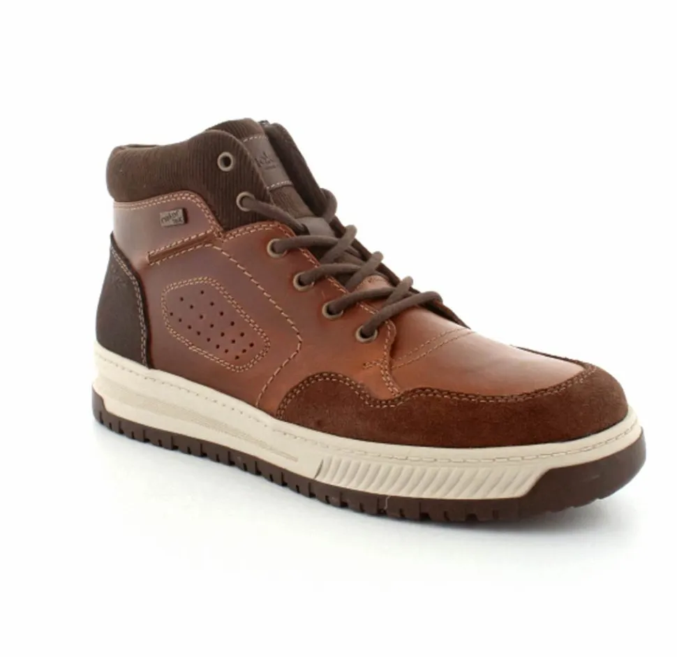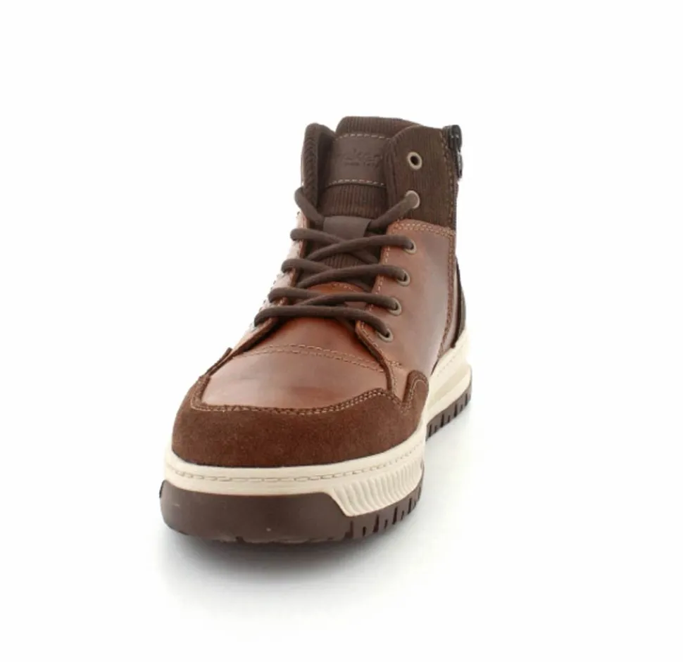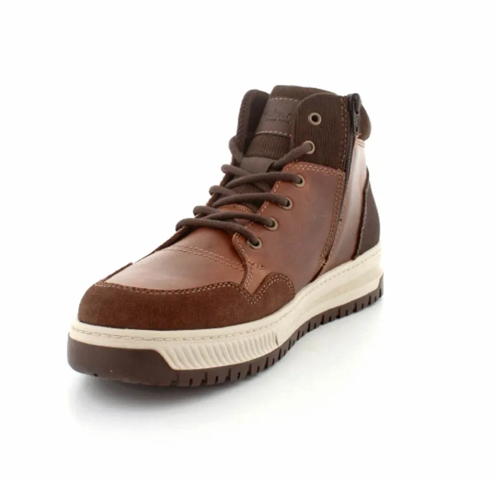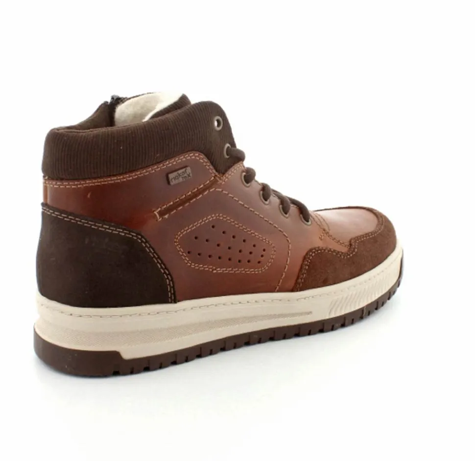 Super smarte vinterstøvle fra Rieker med bet sporty look. Støvlen er lavet i cognacfarvet skind med lyse gummisåler. Der er både snørebånd og lynlås, så den er nem at komme i. Uldfoer indeni og Rieker-Tex membran, så den kan klare sne og kulde.