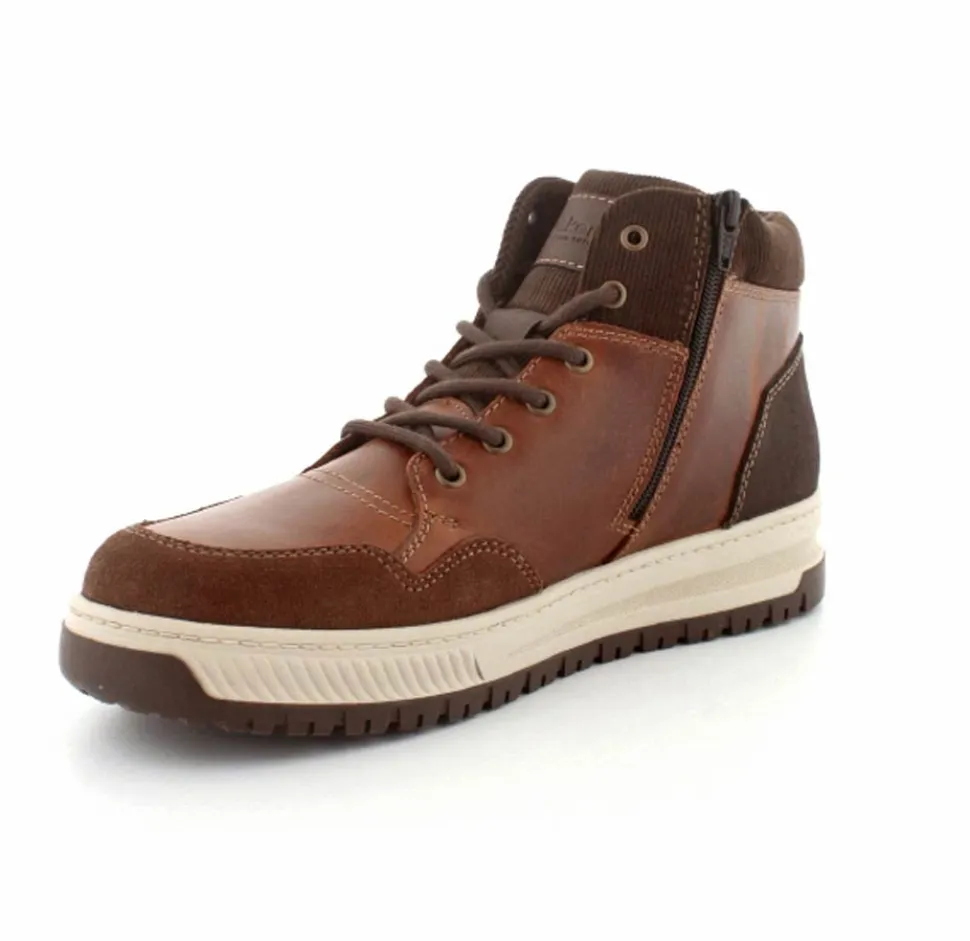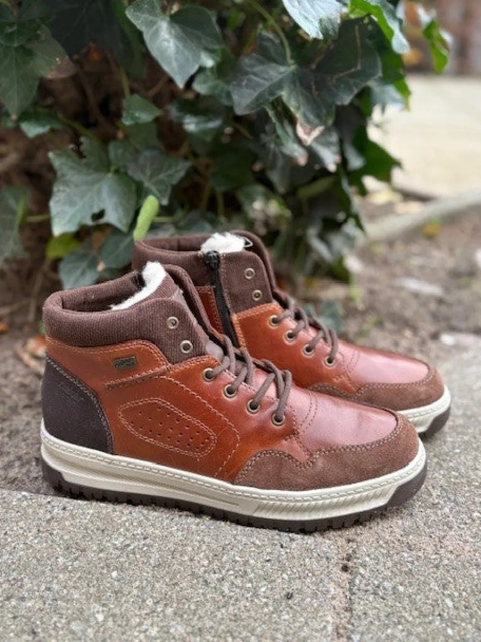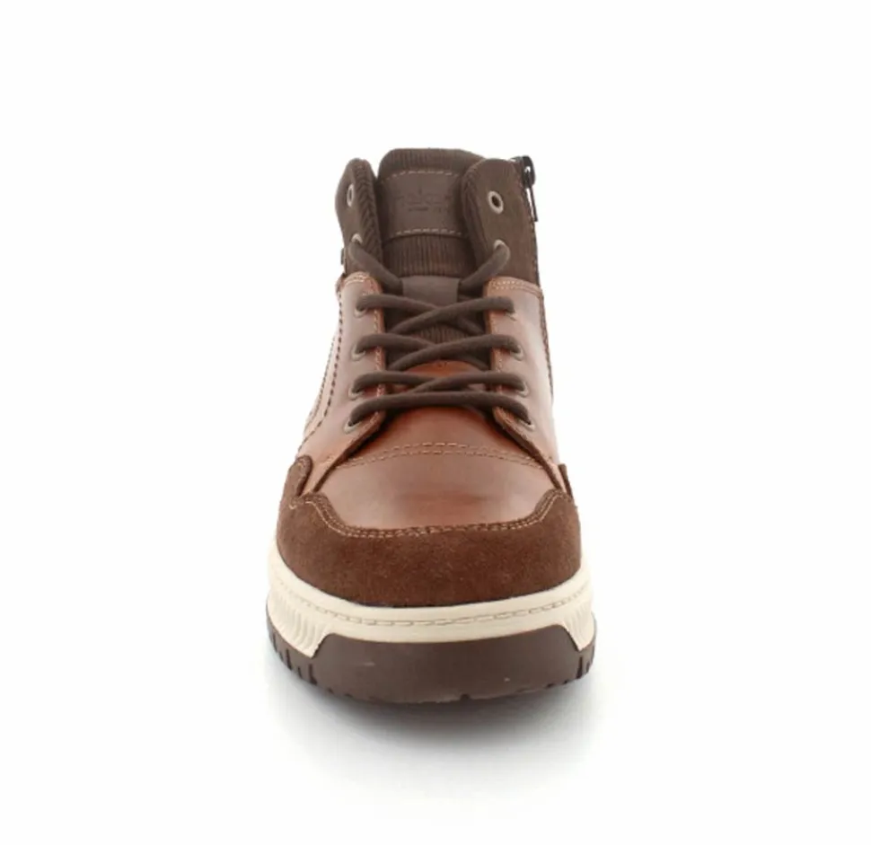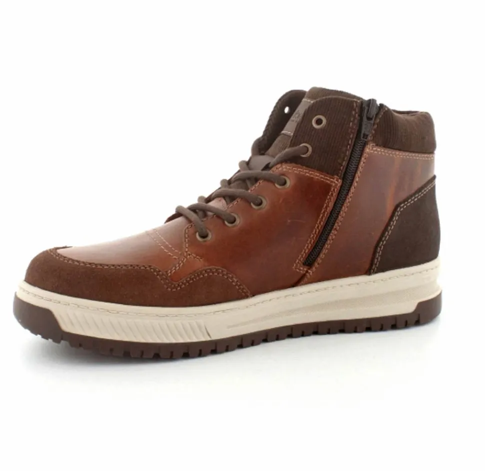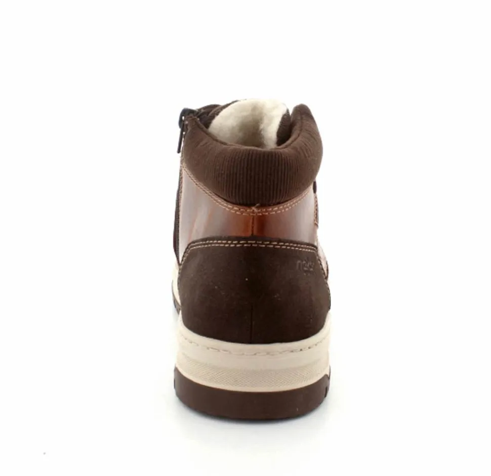Super smarte vinterstøvle fra Rieker med bet sporty look. Støvlen er lavet i cognacfarvet skind med lyse gummisåler. Der er både snørebånd og lynlås, så den er nem at komme i. Uldfoer indeni og Rieker-Tex membran, så den kan klare sne og kulde.