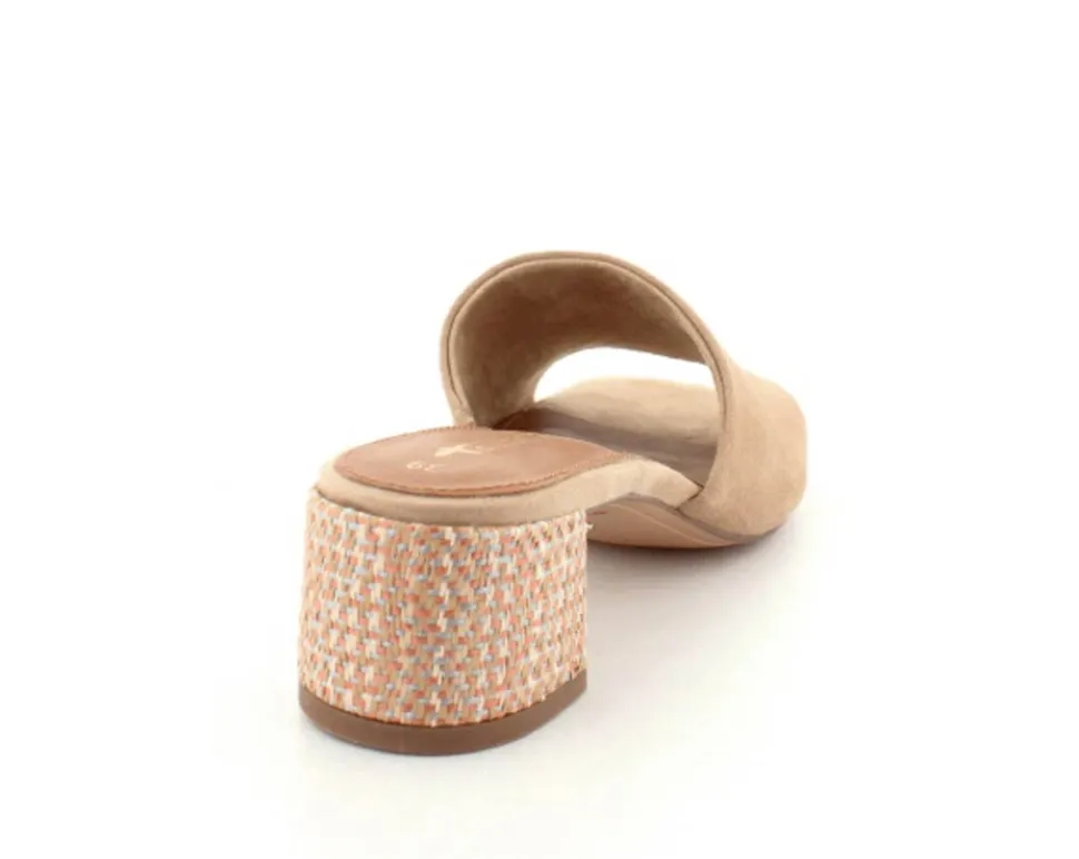 Smuk slippers med hæl fra Tamaris i ruskind og i en flot lys farve. Sandalen har en god bred rem ved forfoden, der dækker flot ind og som rummer godt. Bløde skindsåler indeni og en nem blokhæl at gå på. Den har både “AntiSlide” og “AntiShokk”