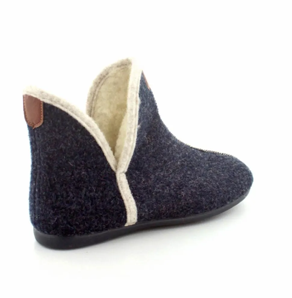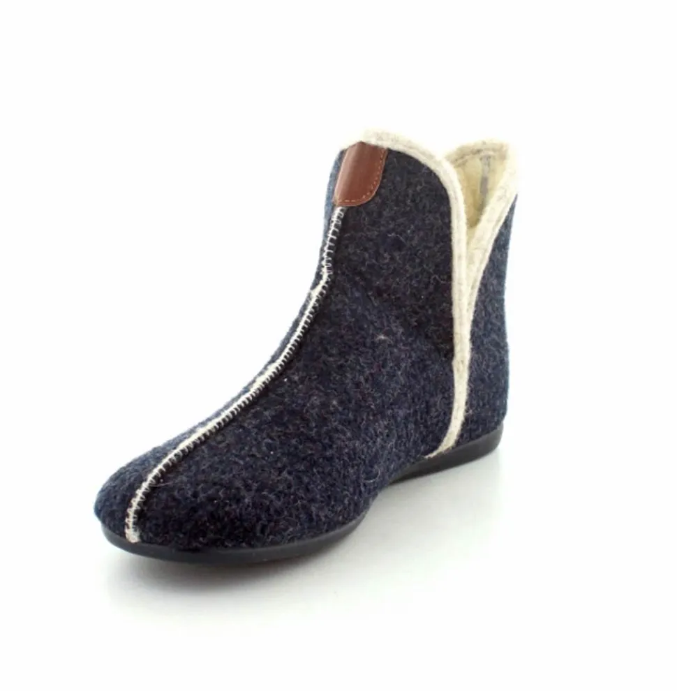 Rigtig skøn og varm hjemmesko fra Bella Moda i en flot mørkeblå farve. Hjemmeskoen er lige til at trække på med skaft og med slidser i siden. Der er dejligt varmt uldfoer indeni og gummisåler under hele bunden. Den er lavet på en smallere læst så den virker lidt til den smalle side.