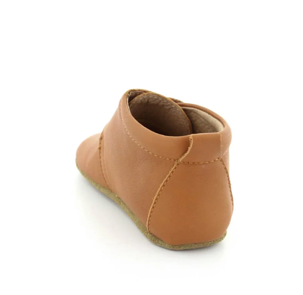 Lækker hjemmesko fra Bisgaard model Velcro Star i cognacfarvet skind. Skoen er nem at komme i med en velcrorem over vristen. Den sidder godt til på foden med god fast hælkappe. Skoen fra Bisgaard har blødt skindfoer indvendigt og ruskindssåler under bunden. Her er der påsat to gummifelter så barnet står bedre fast. Skoen egner sig godt til den første kravle/gåsko til indendørs brug. Husk den rummer godt i størrelsen.