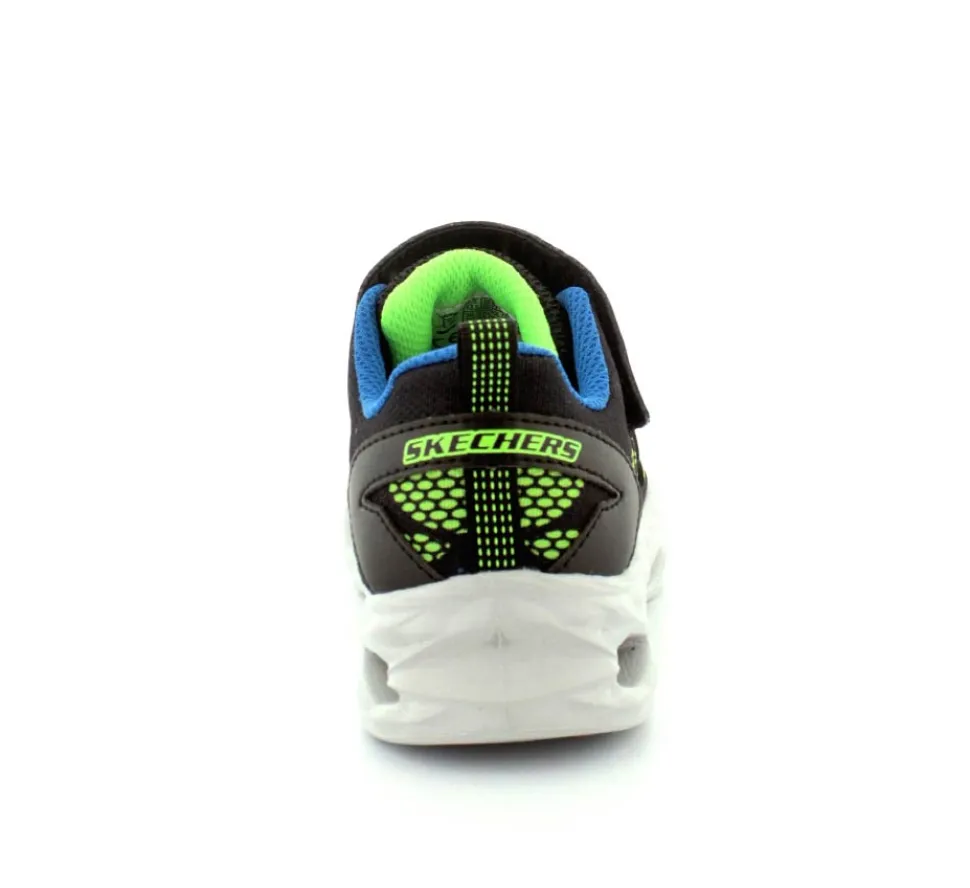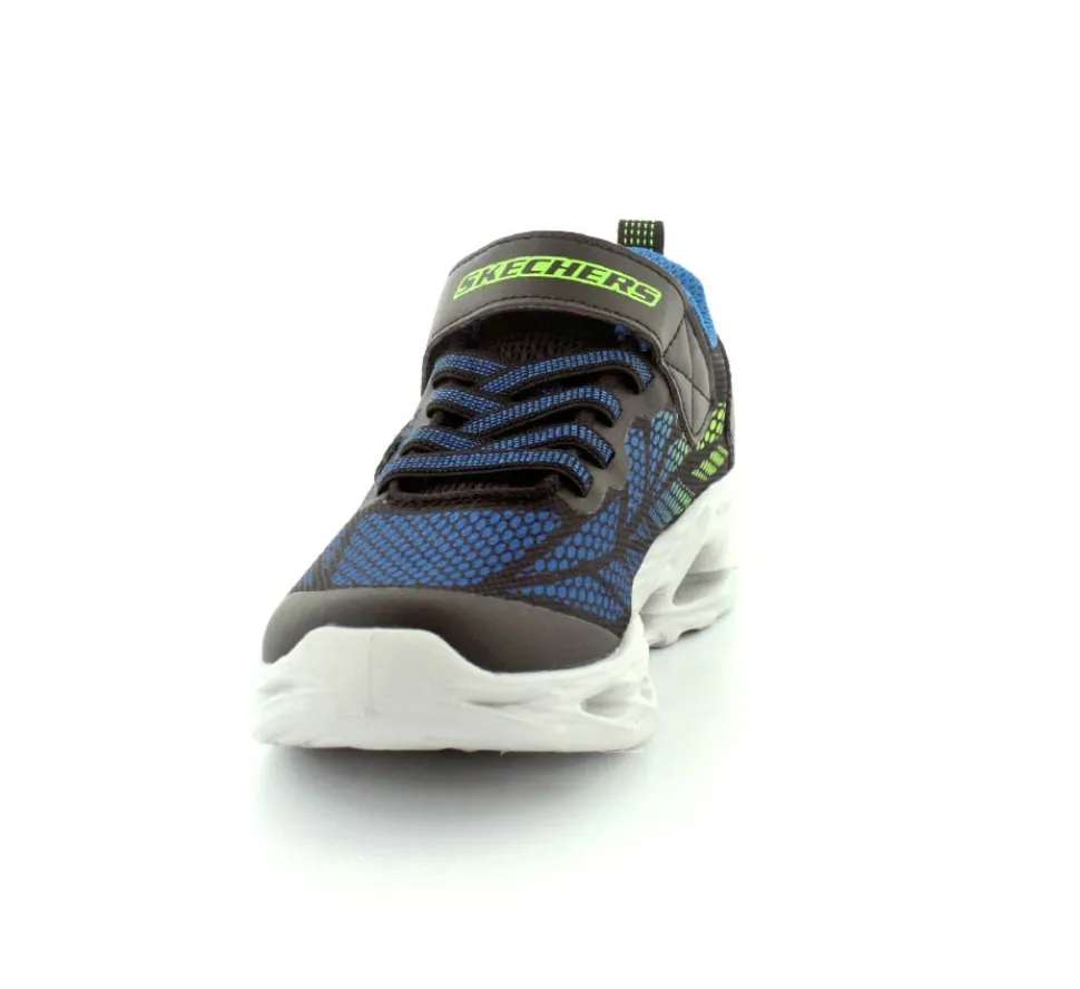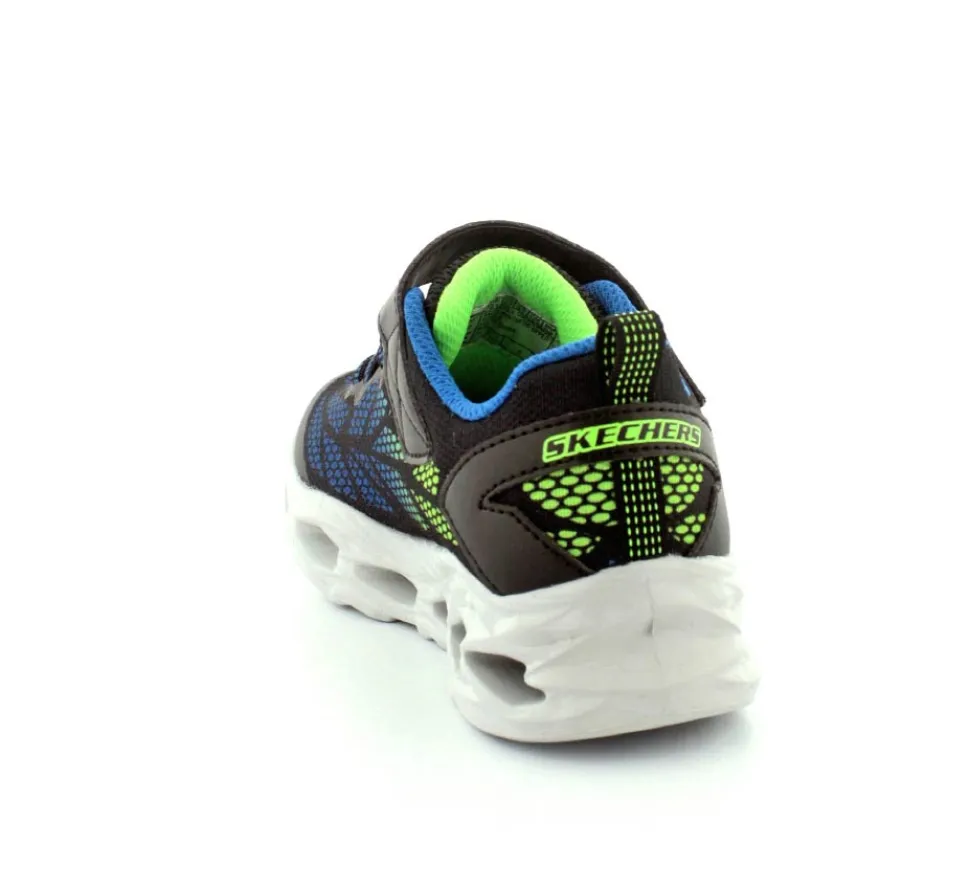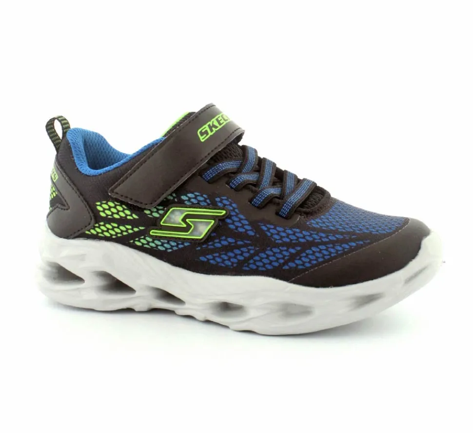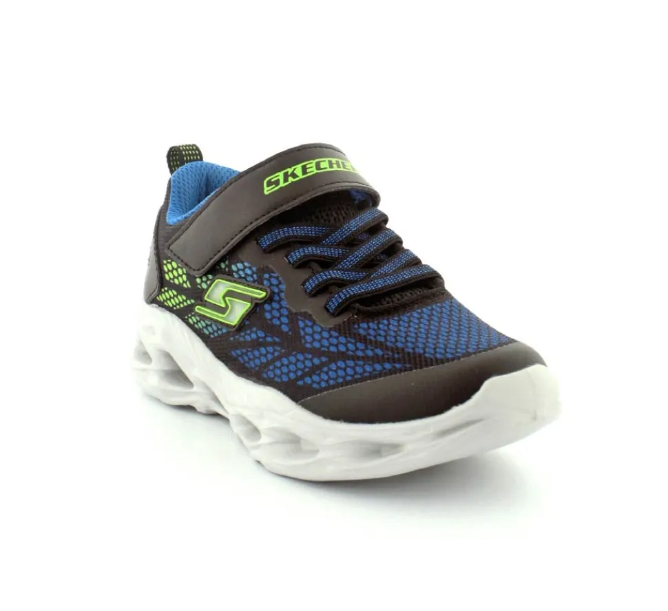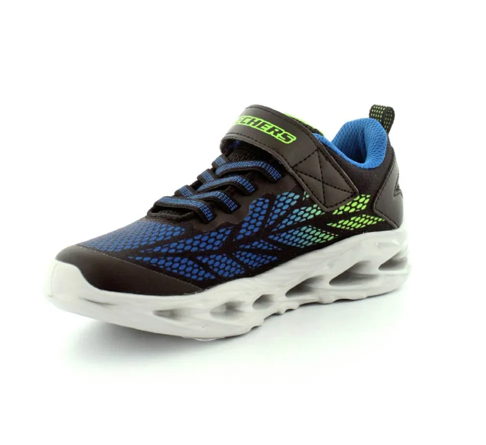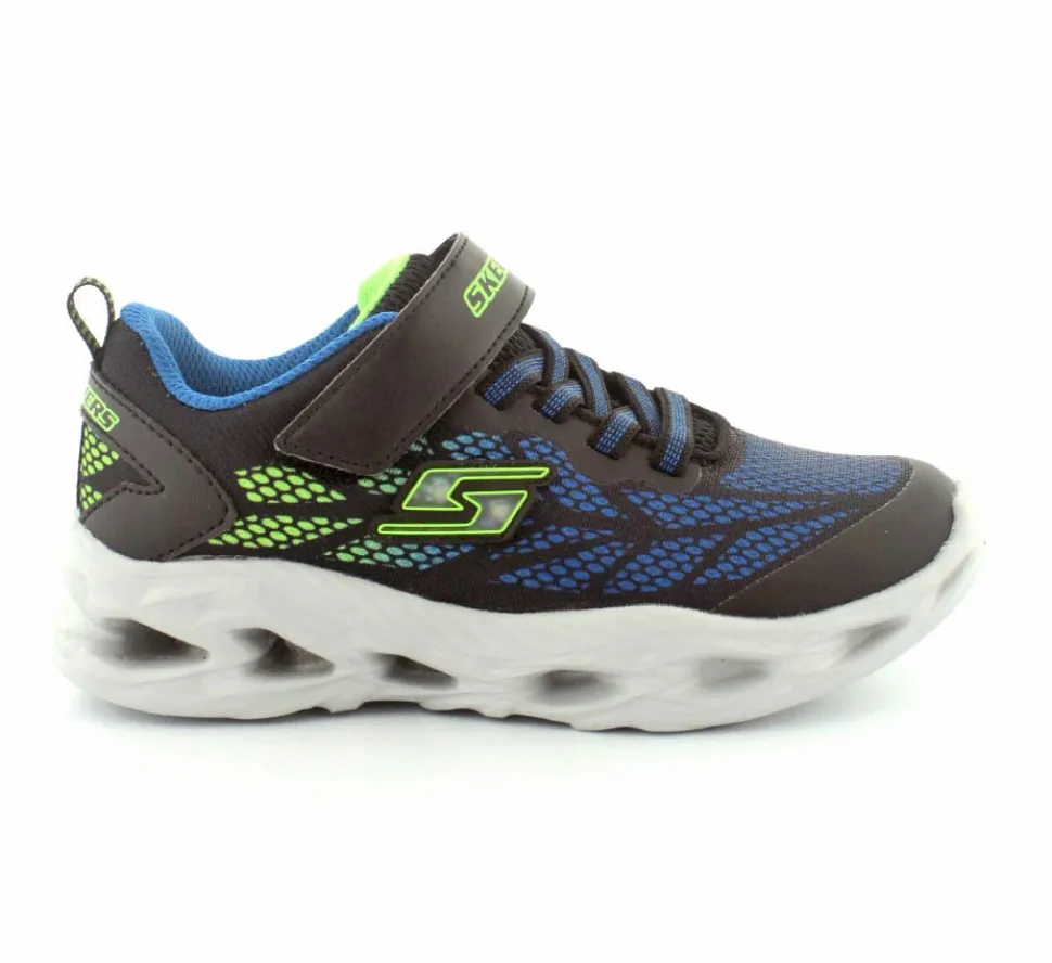 Blinkesko fra Skechers model Vortex-Flash i blå, grøn, sort kombination. Skoen er meget let, har elastiksnøre og en velcrorem. Nem at tage på og sidder godt til på foden. Skoen blinker ved bevægelse.